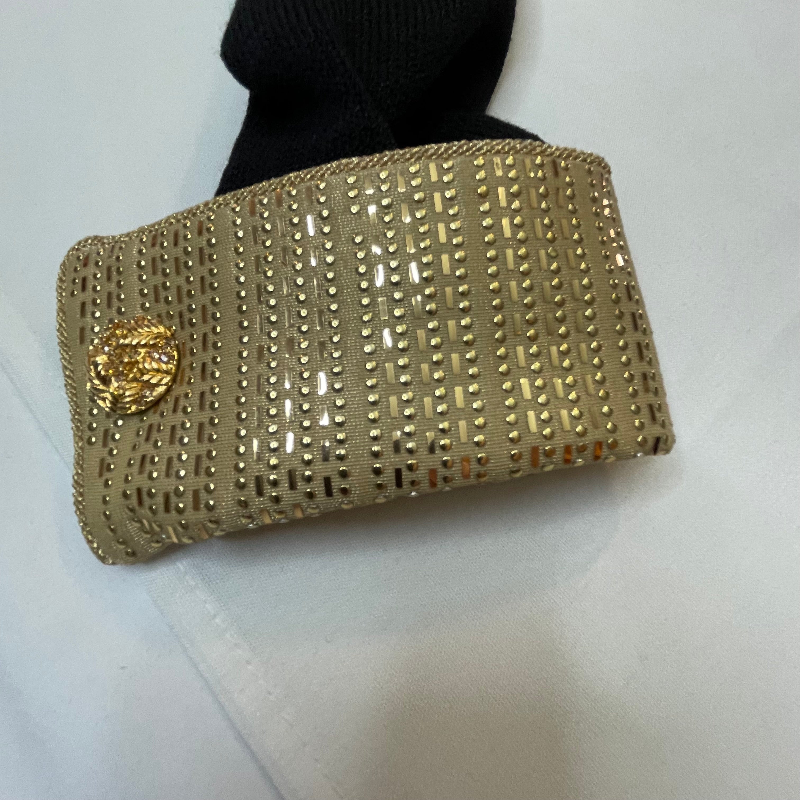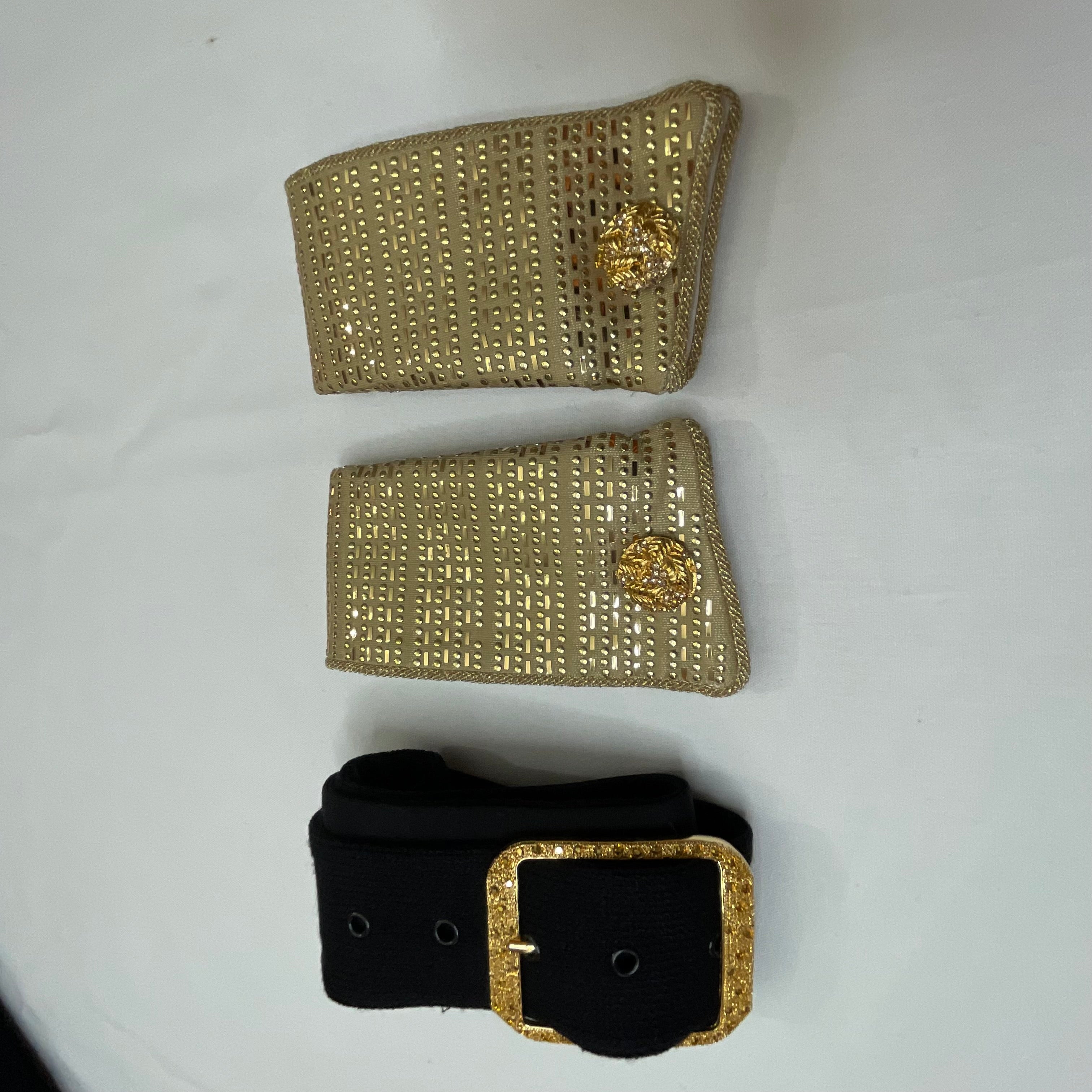 - Removable metallic gold collar, cuffs, and belt for versatile styling