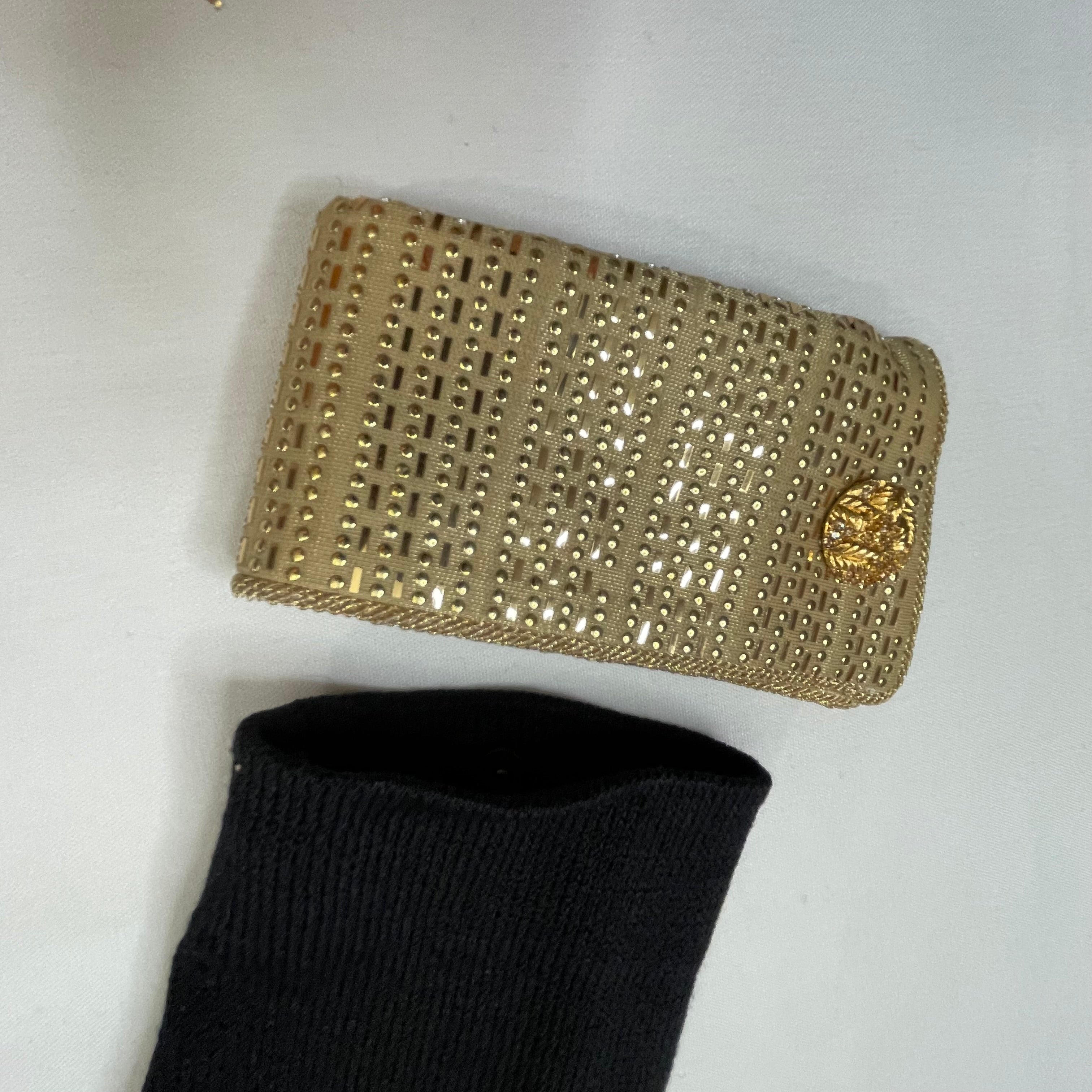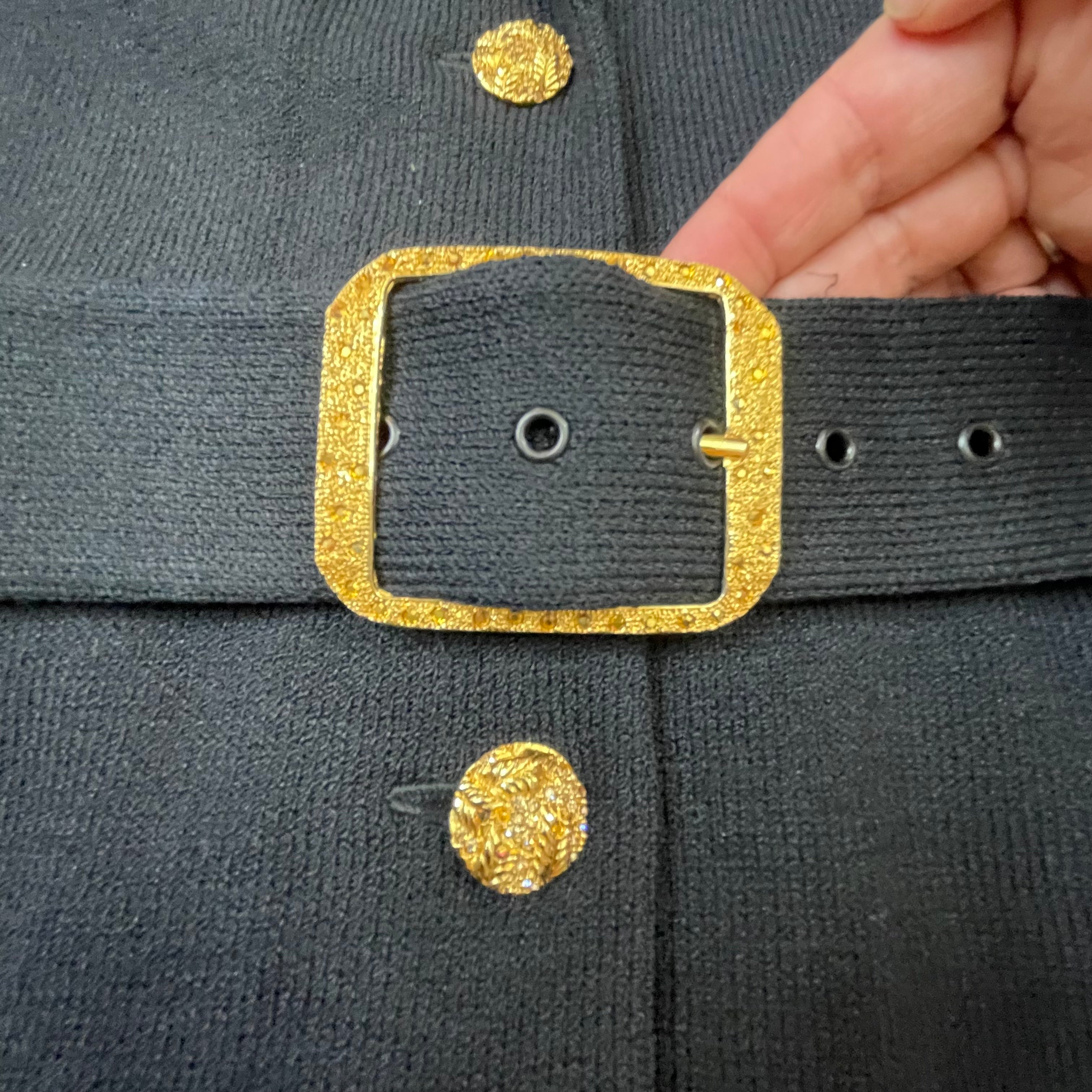 This is the kind of piece that works as hard as you do. The classic black knit silhouette features a stunning metallic gold collar that adds instant glamour, while the removable cuffs, collar, and belt let you style it multiple ways. Wear it fully accessorized for maximum impact, or strip it down to sleek minimalism—your choice. The signature St. John knit fabric moves with you while keeping its polished shape, and those gold lion-head buttons? Pure luxury.