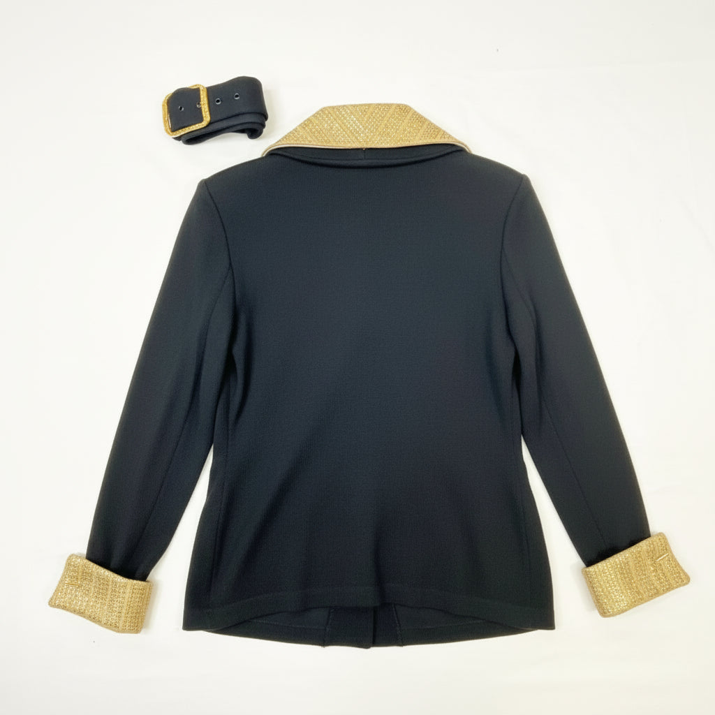 Power dressing meets versatility in this iconic St. John black knit jacket with luxe gold-tone collar and removable accessories.