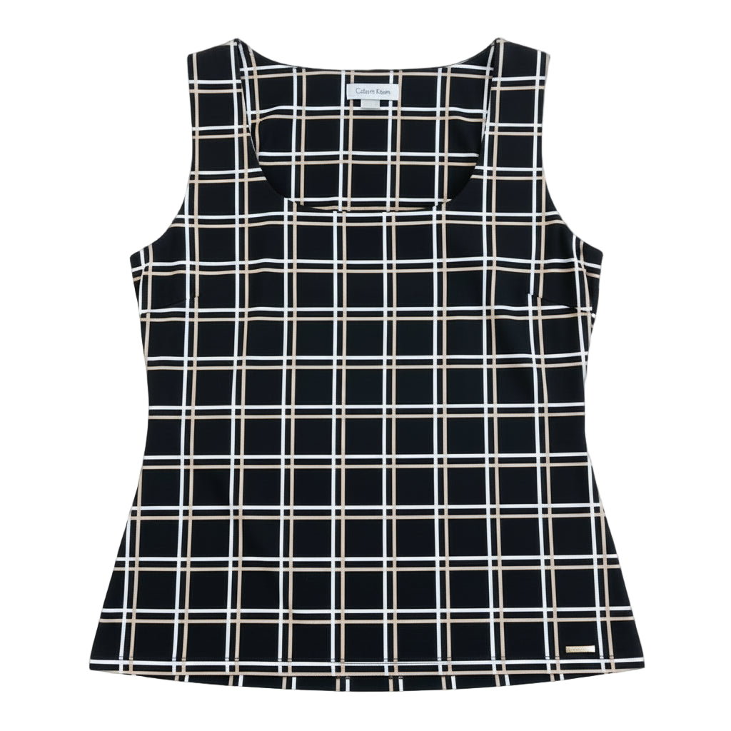 This chic Calvin Klein sleeveless tank top showcases a striking checkered pattern that brings visual interest to any wardrobe. The classic silhouette offers versatile styling options—tuck into tailored trousers for polished office wear, layer under blazers for elevated casual looks, or pair with denim for effortless weekend style. Crafted with Calvin Klein's signature attention to detail and quality construction, this piece delivers both comfort and refined aesthetic appeal.