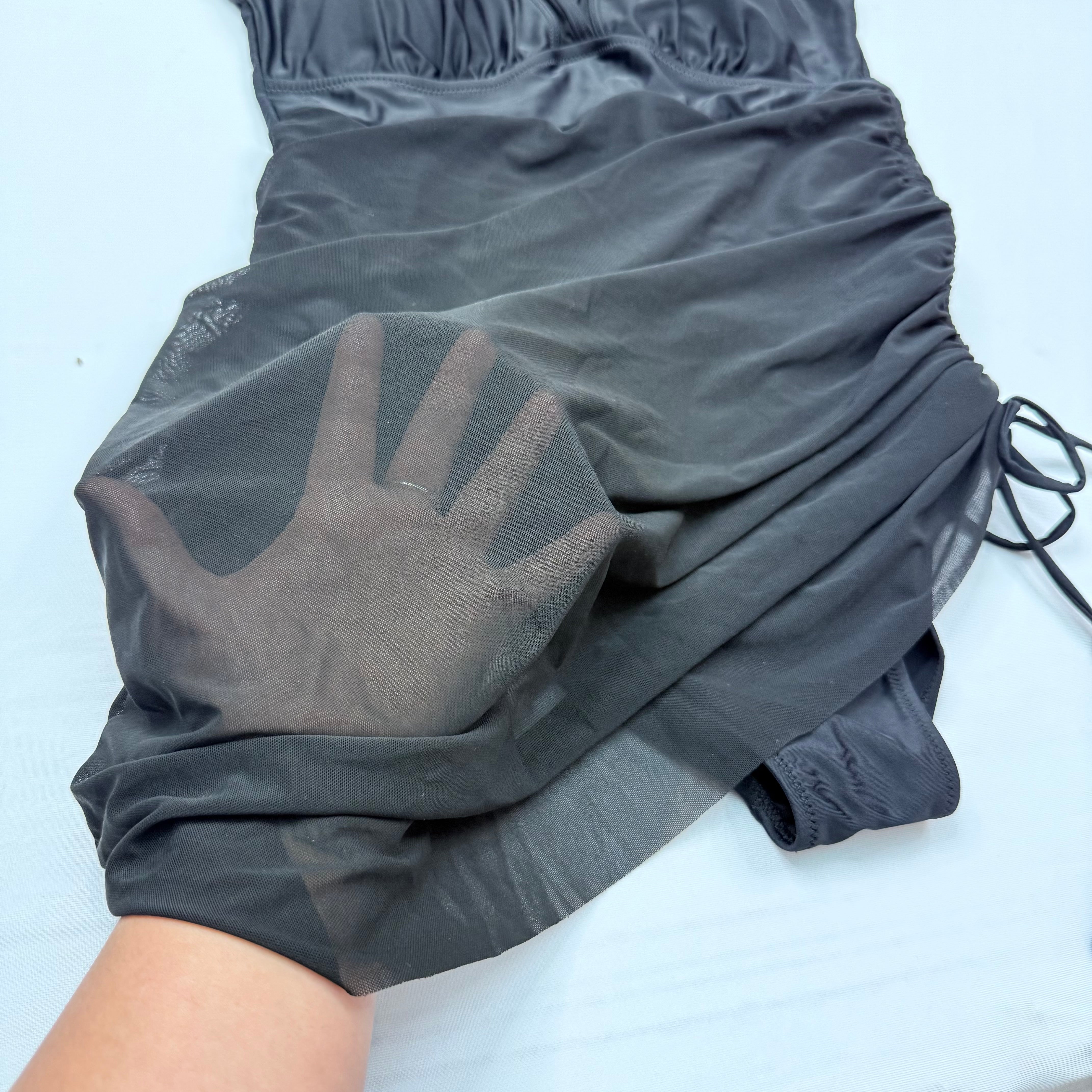 The adjustable side ties let you customize the fit and add a playful touch, while the V-neckline with soft cups provides support and shaping. The strategic ruching across the torso and sides smooths and flatters your silhouette, making this the kind of swimsuit you'll reach for again and again. The mesh panel detailing adds a subtle edge while maintaining full coverage. Whether you're lounging poolside or diving into the waves, this suit delivers serious style and comfort.