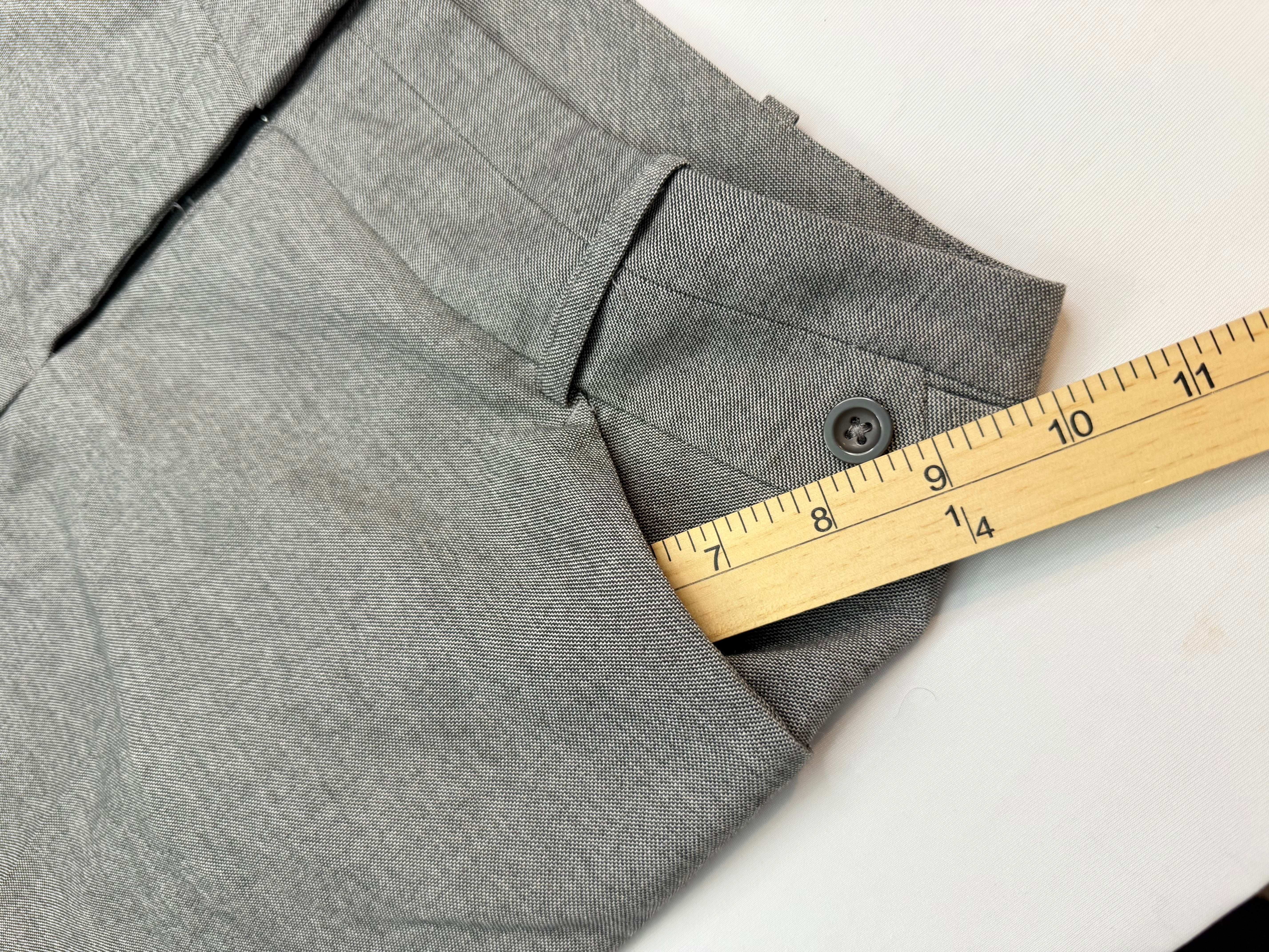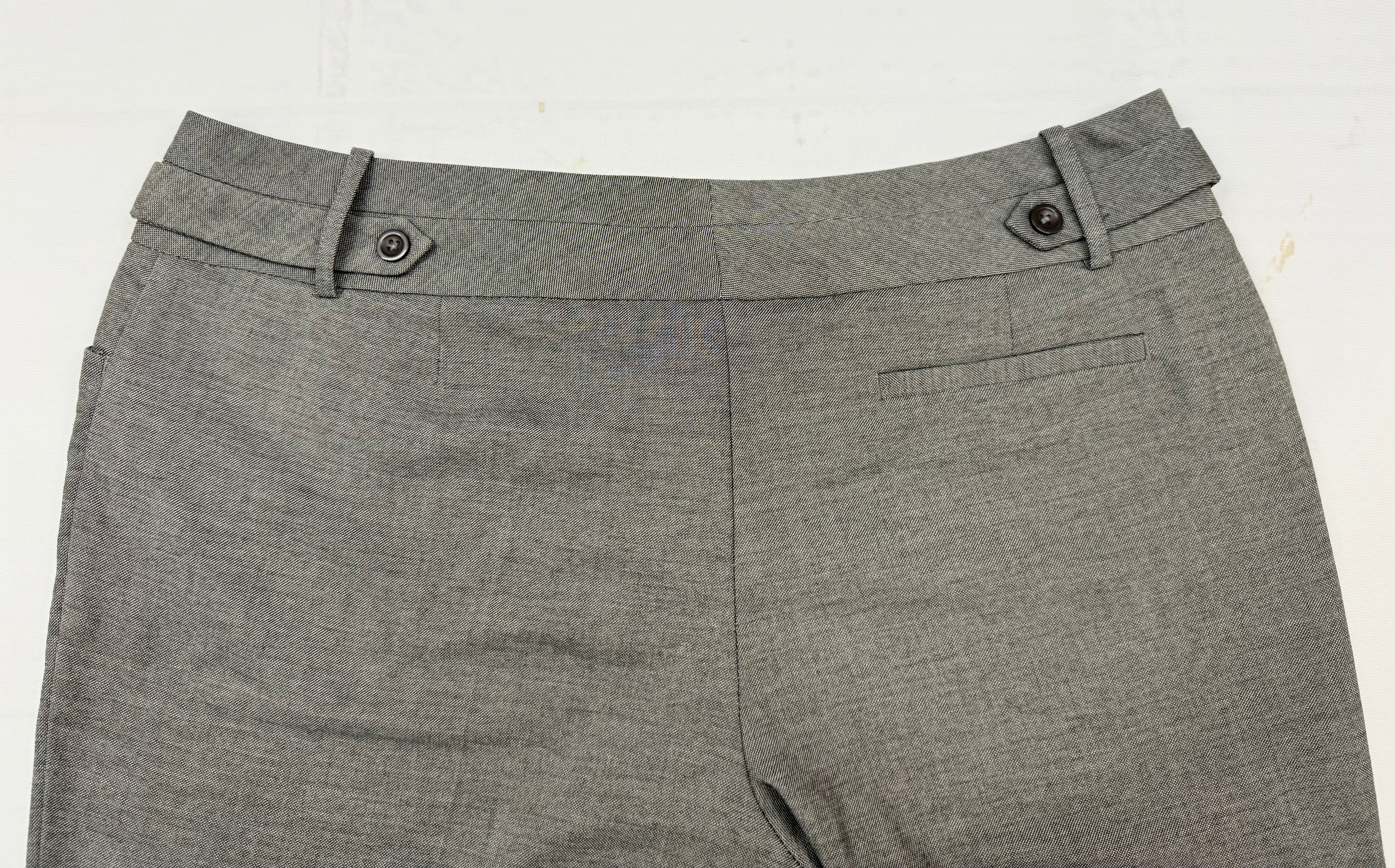 - Details: Tab waistband with dual button closure, front pockets, center crease