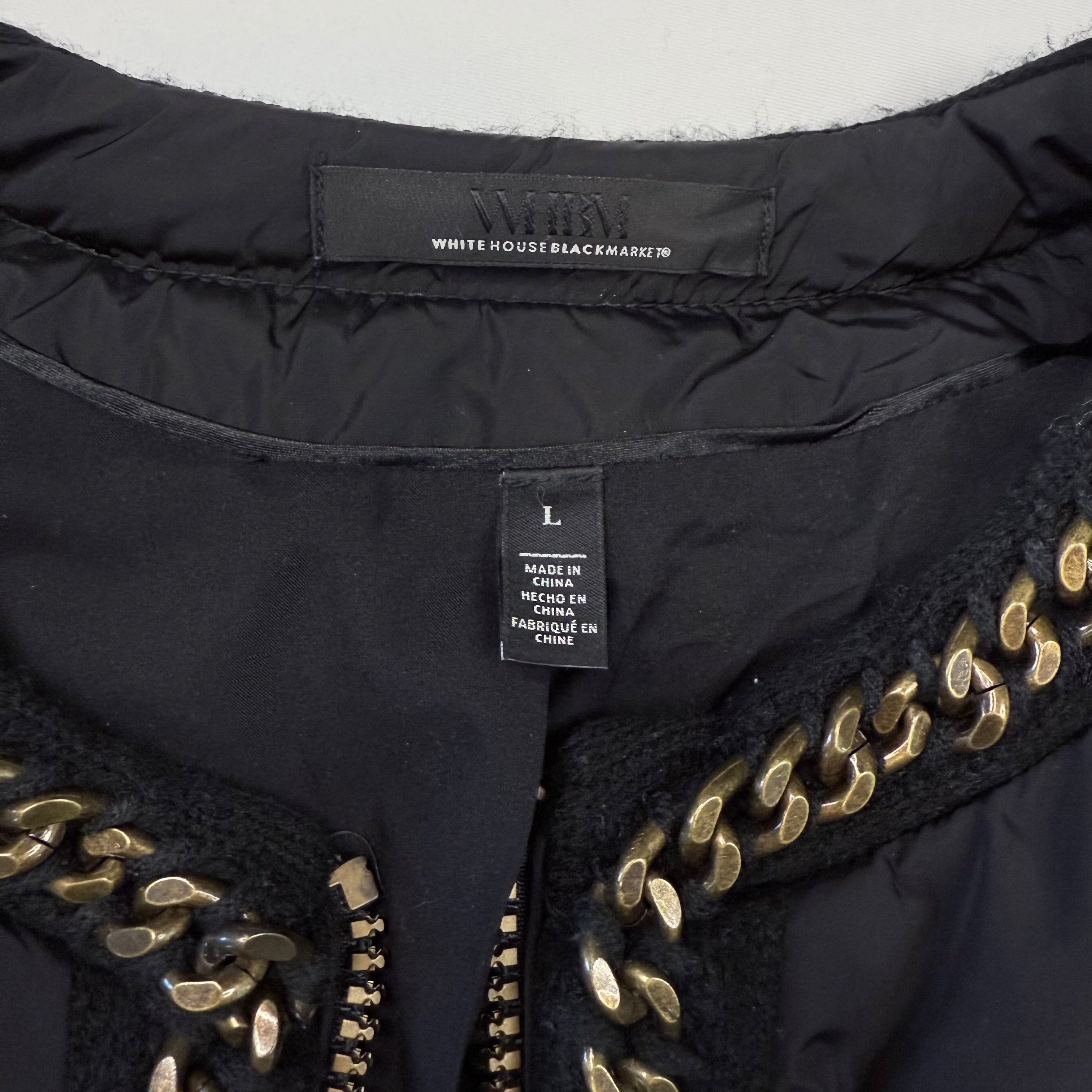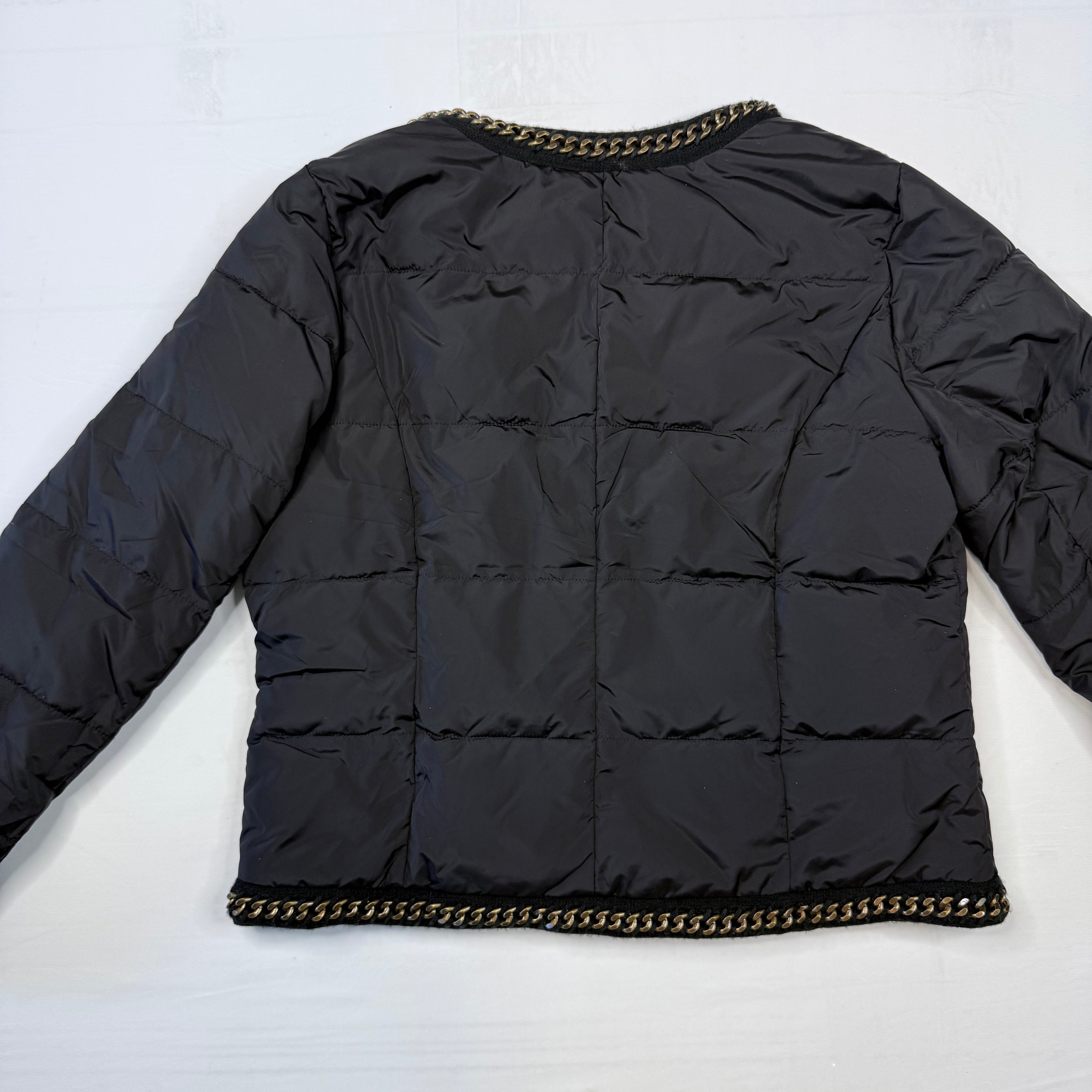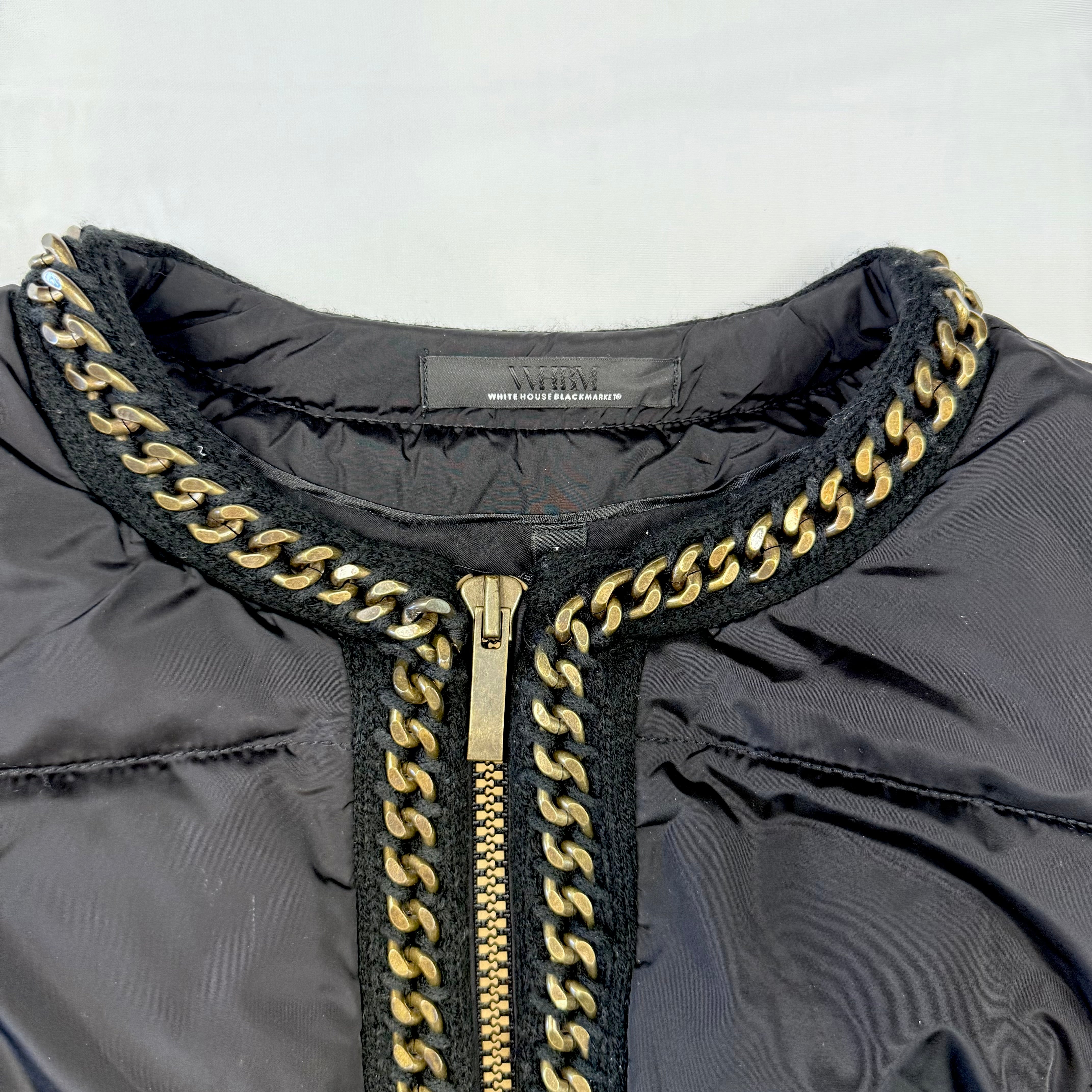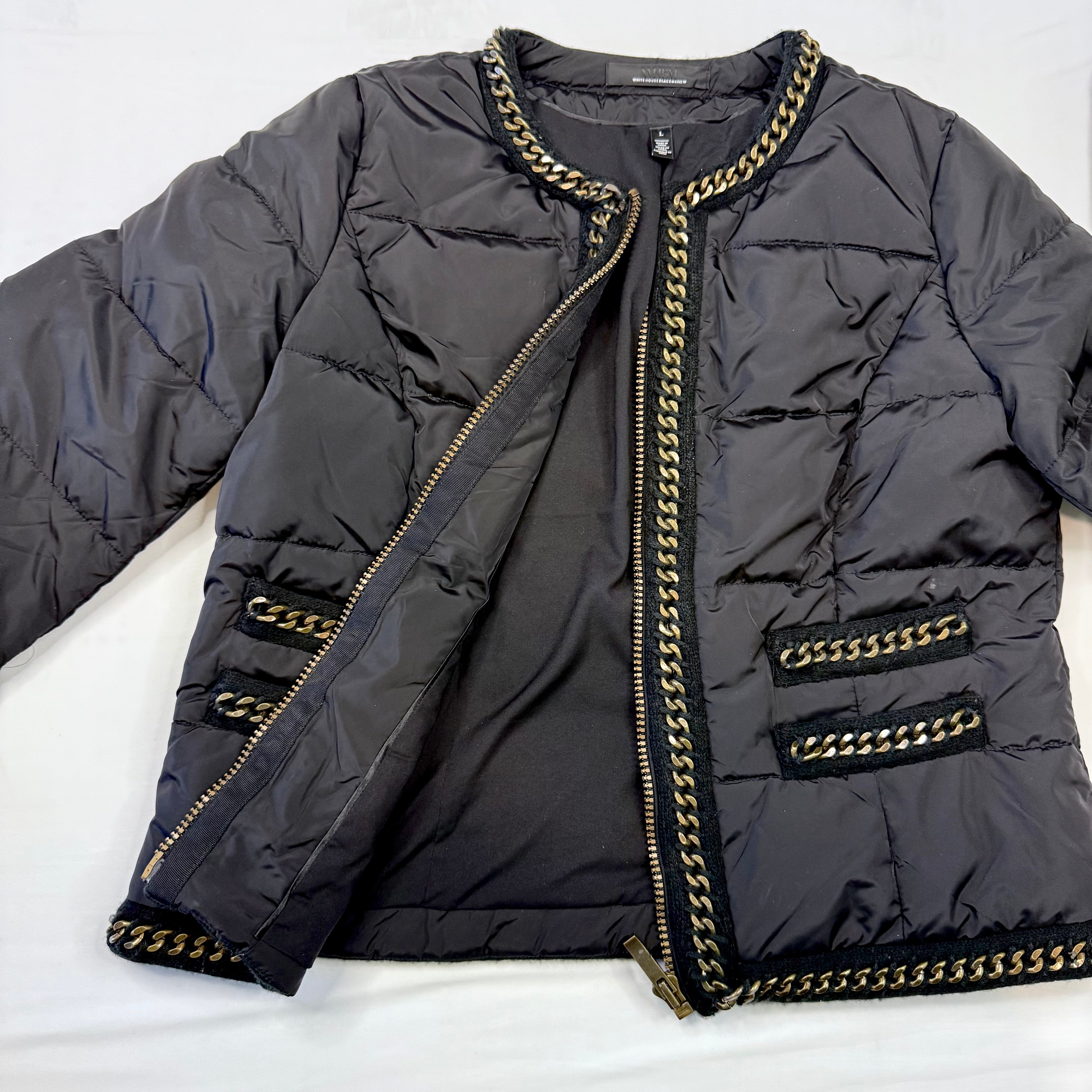 White House Black Market Black Quilted Puffer Jacket with Gold Chain Trim - Size Large