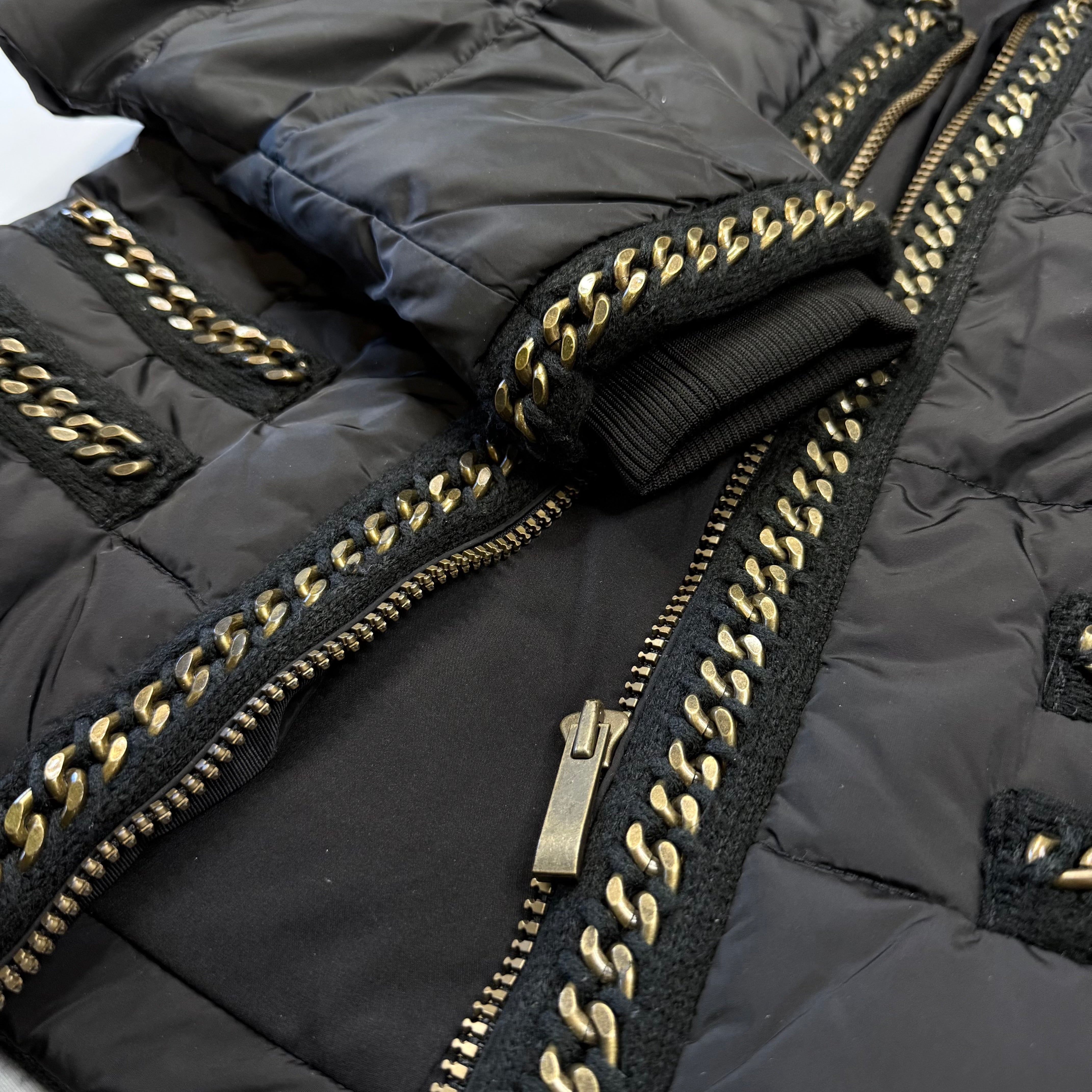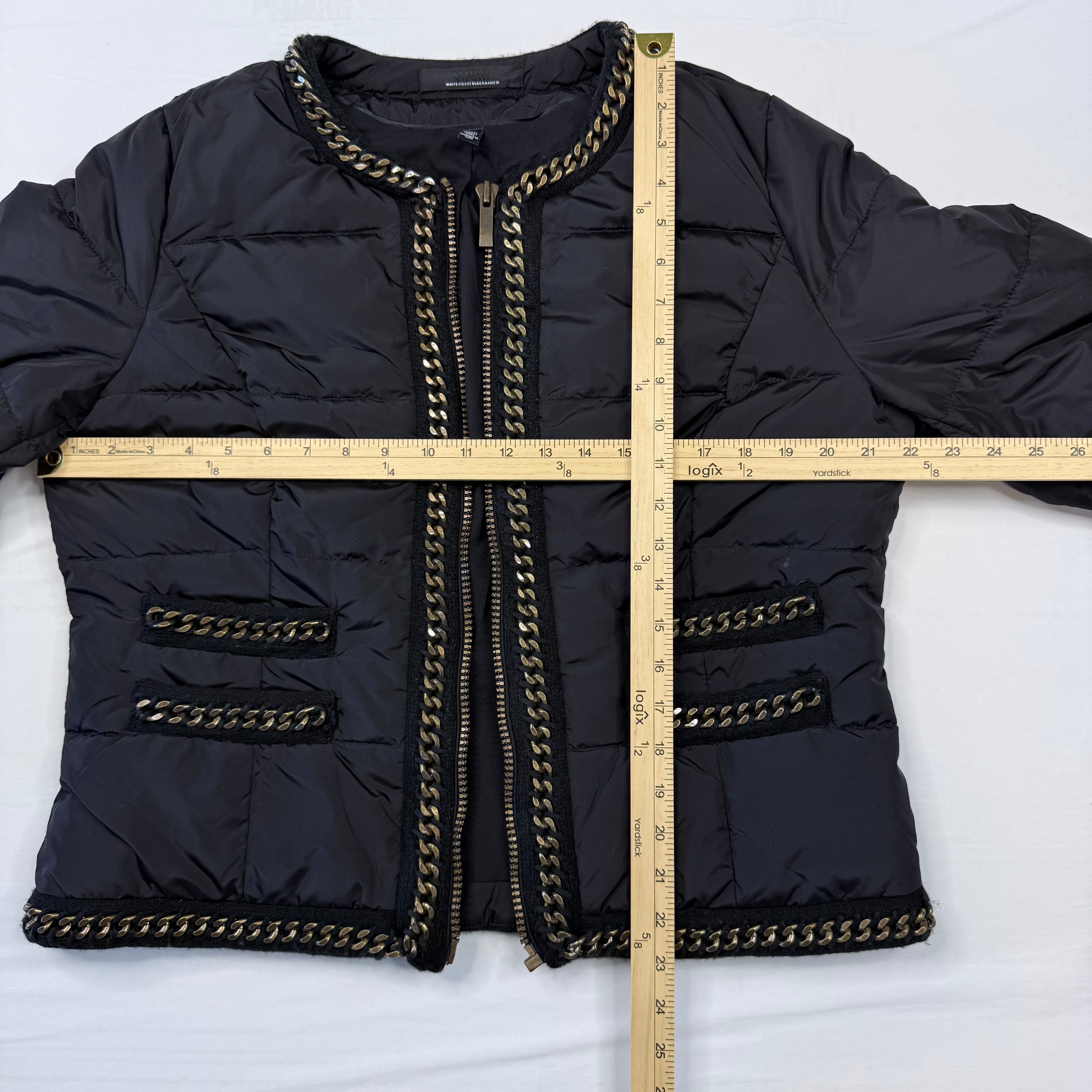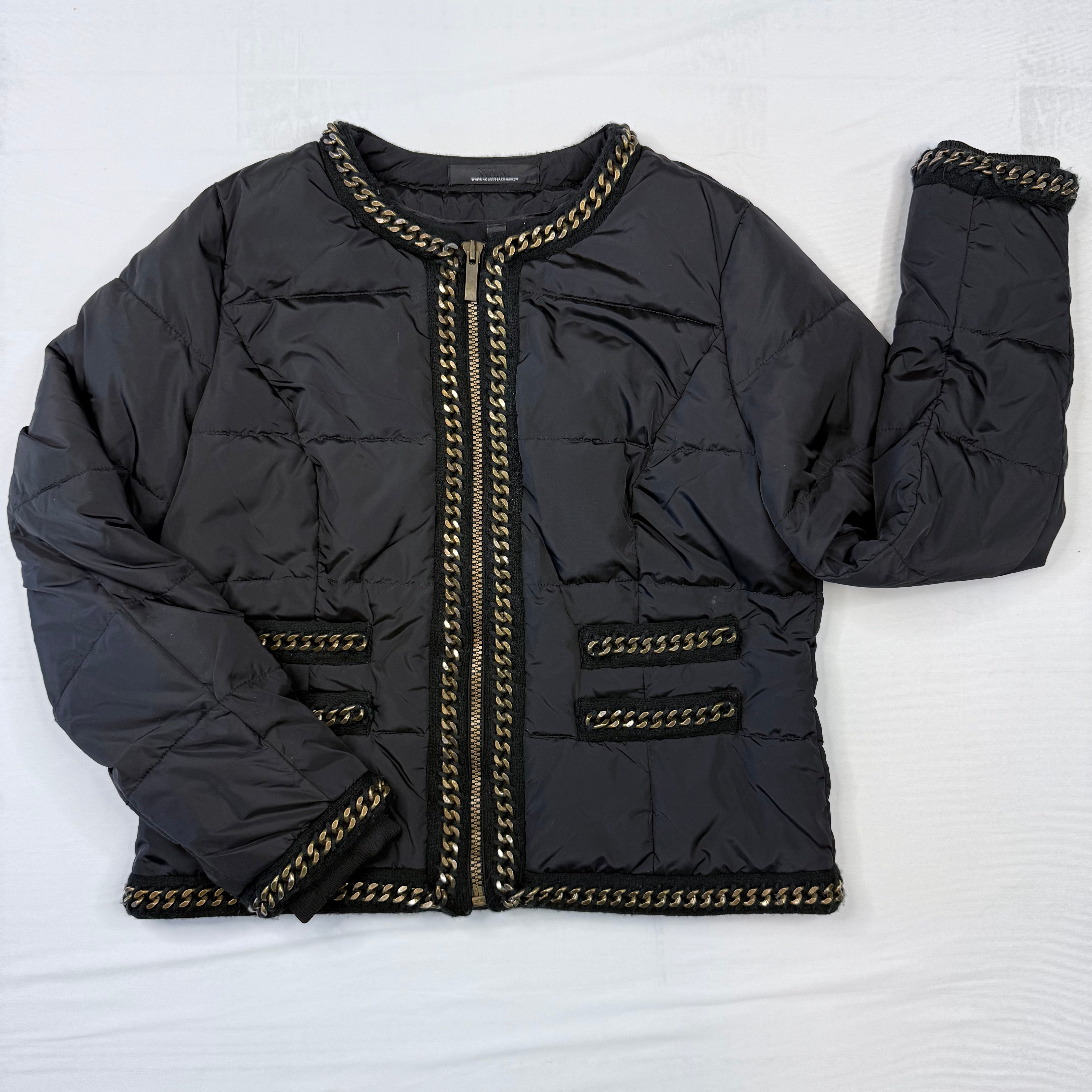 This stylish White House Black Market puffer jacket adds warmth and edge to any outfit. The black quilted design features eye-catching gold-tone metal chain trim along the neckline, cuffs, pockets, and hem, giving it a modern, fashion-forward look.