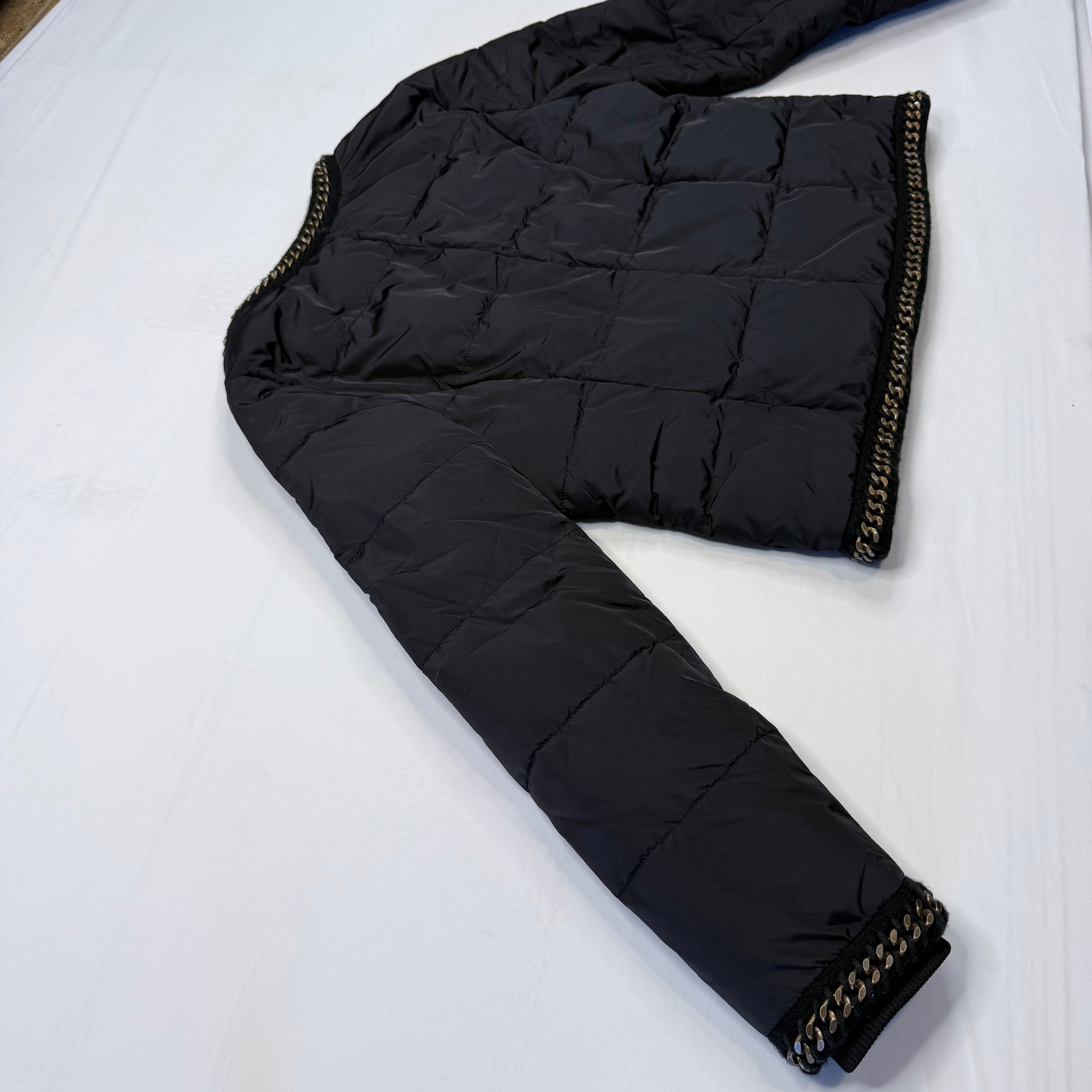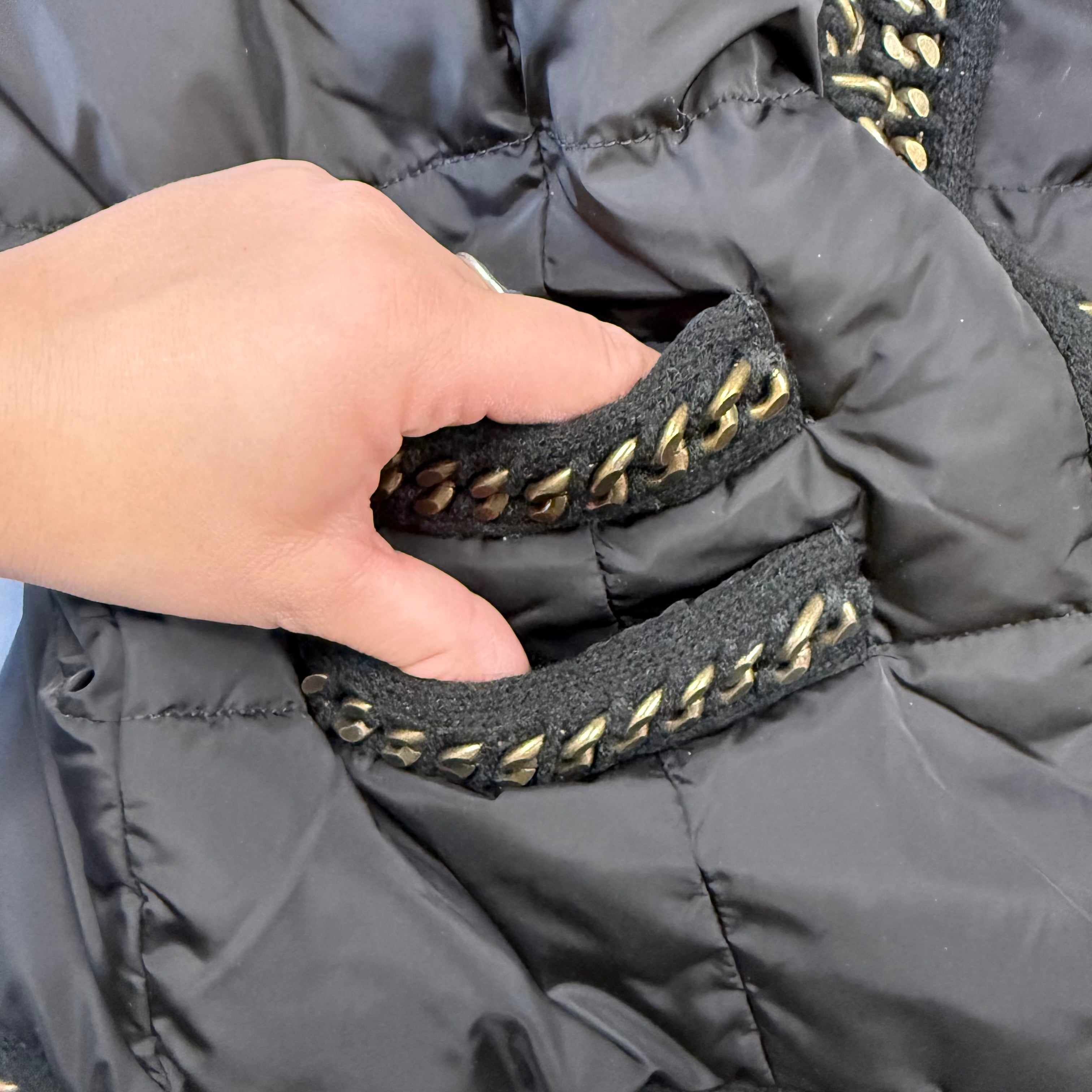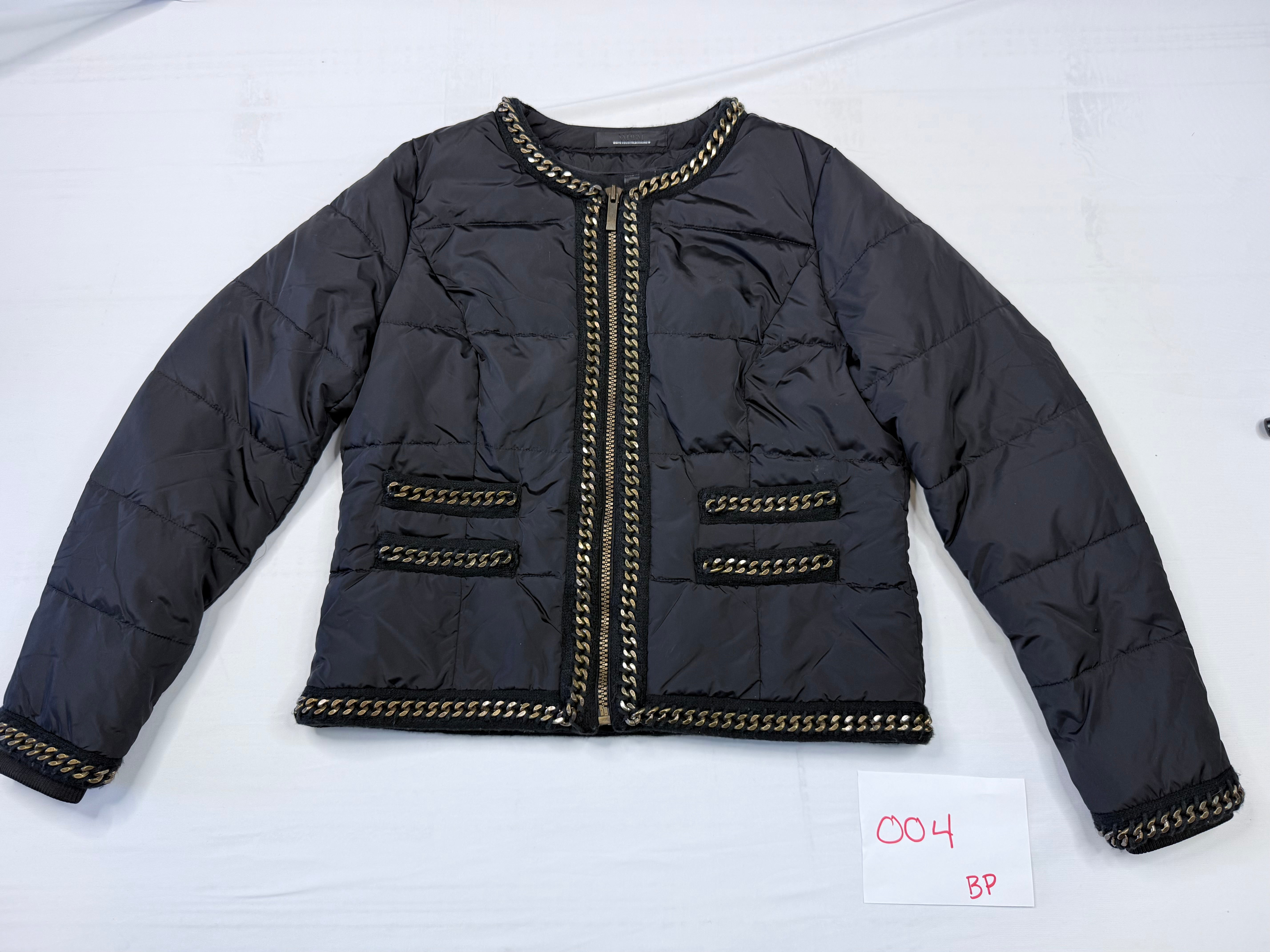This stylish White House Black Market puffer jacket adds warmth and edge to any outfit. The black quilted design features eye-catching gold-tone metal chain trim along the neckline, cuffs, pockets, and hem, giving it a modern, fashion-forward look.