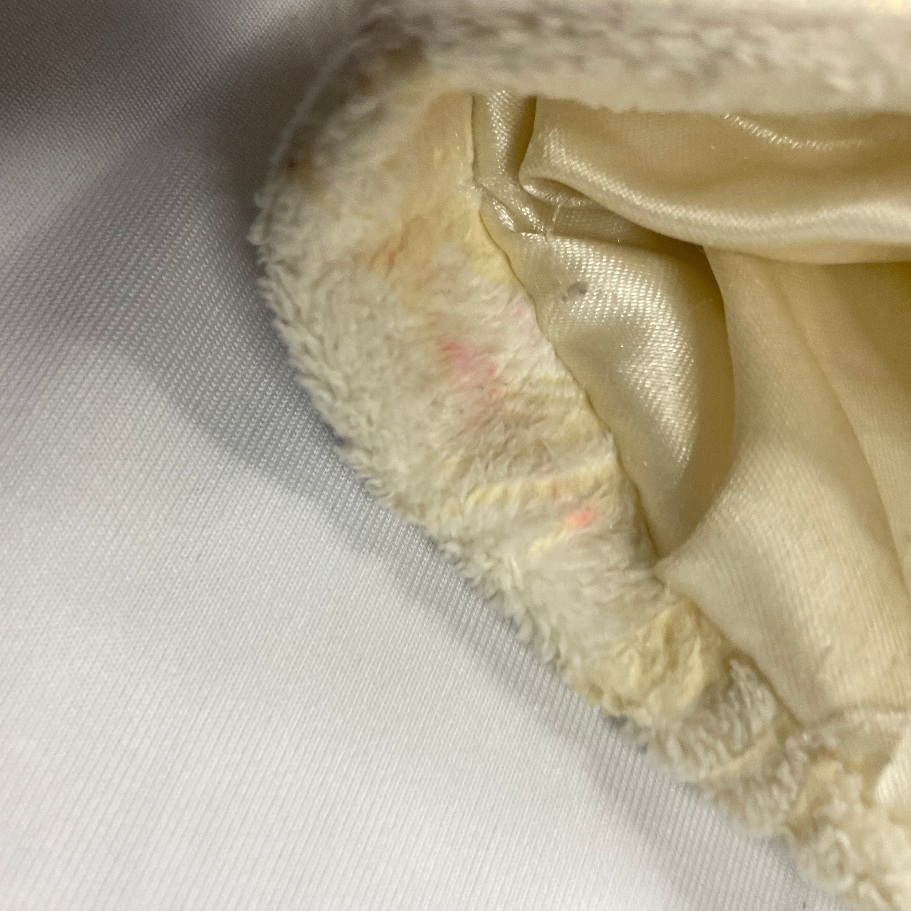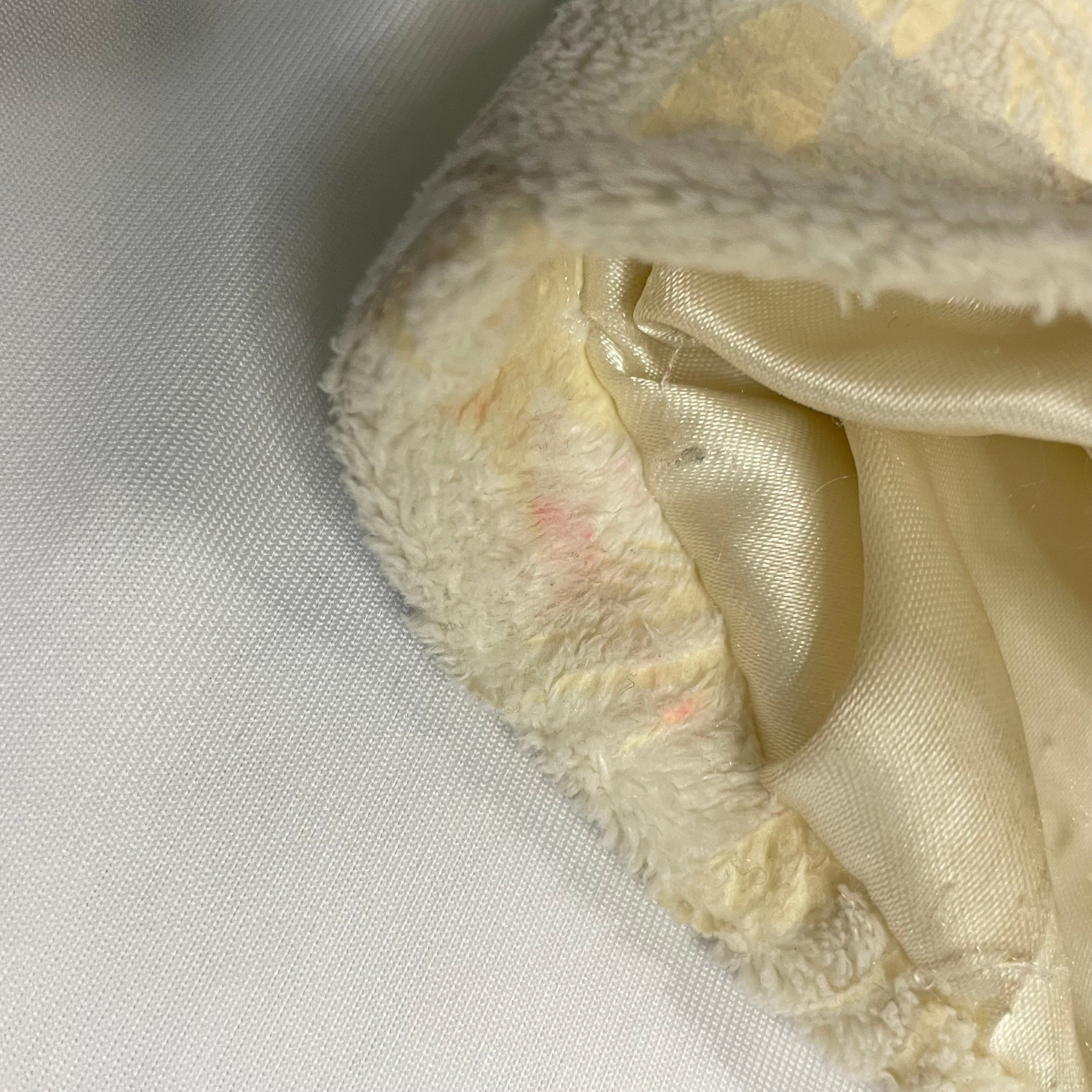 Condition Report: This coat is in good condition overall but does have some minor blemishes. There are marks on the inside of the upper back that appear to be from sunless tanner, and a small pink spot. These flaws are on the interior lining and not visible when worn. The exterior is clean and the coat is otherwise ready to wear.