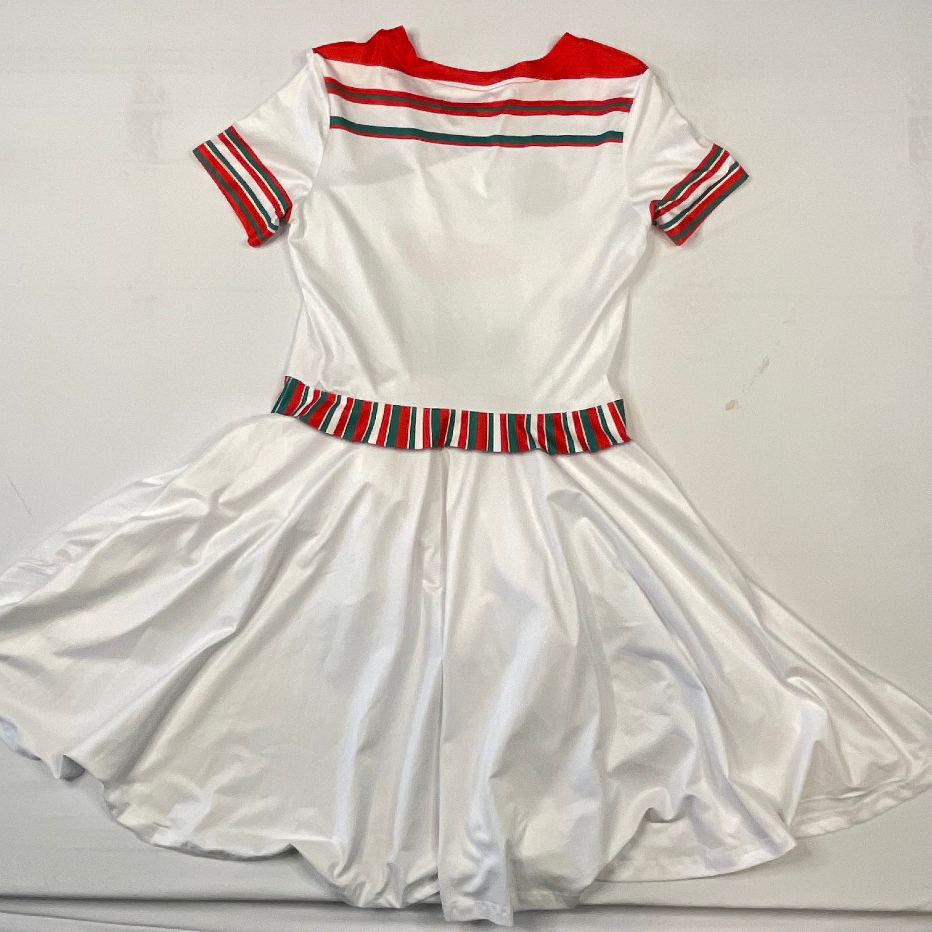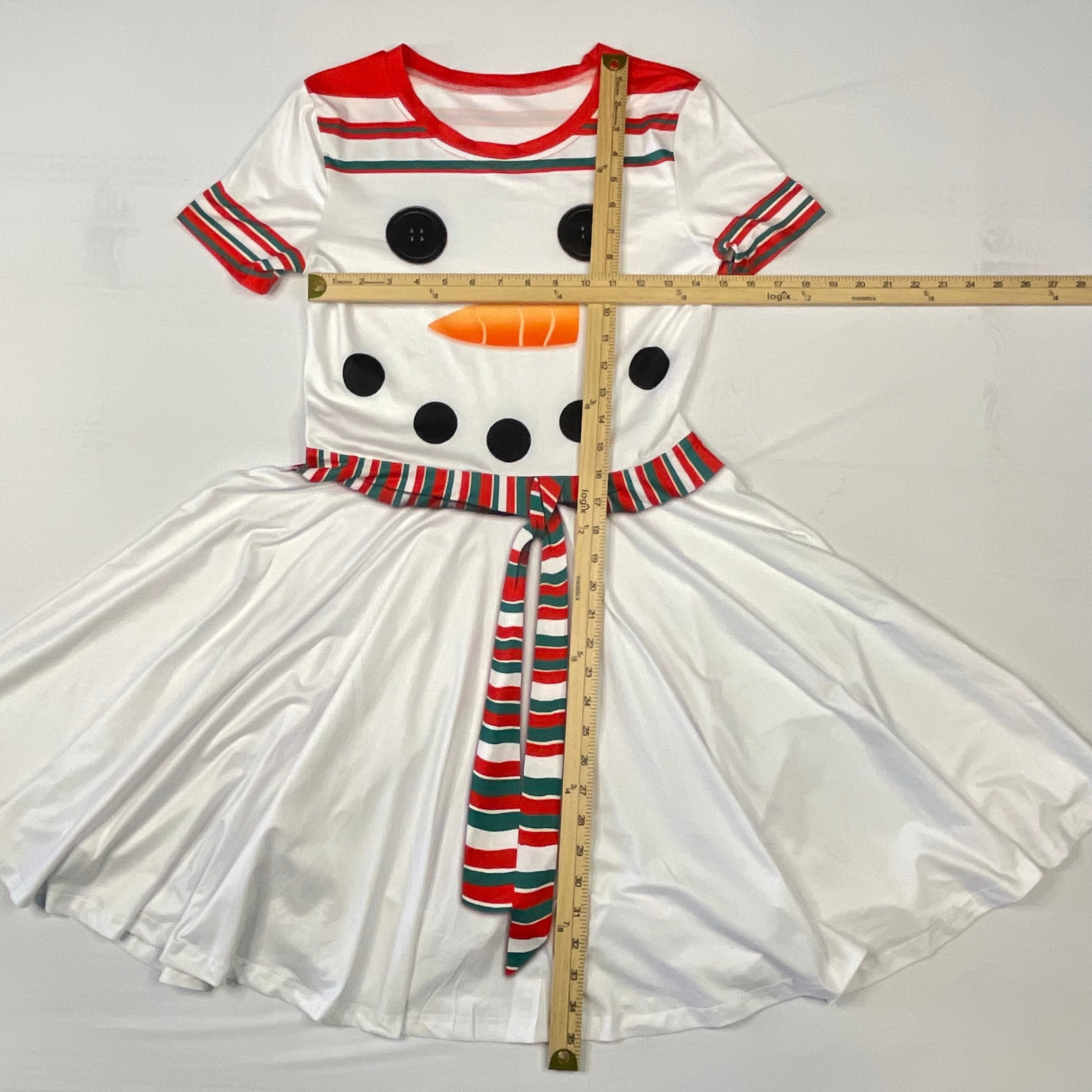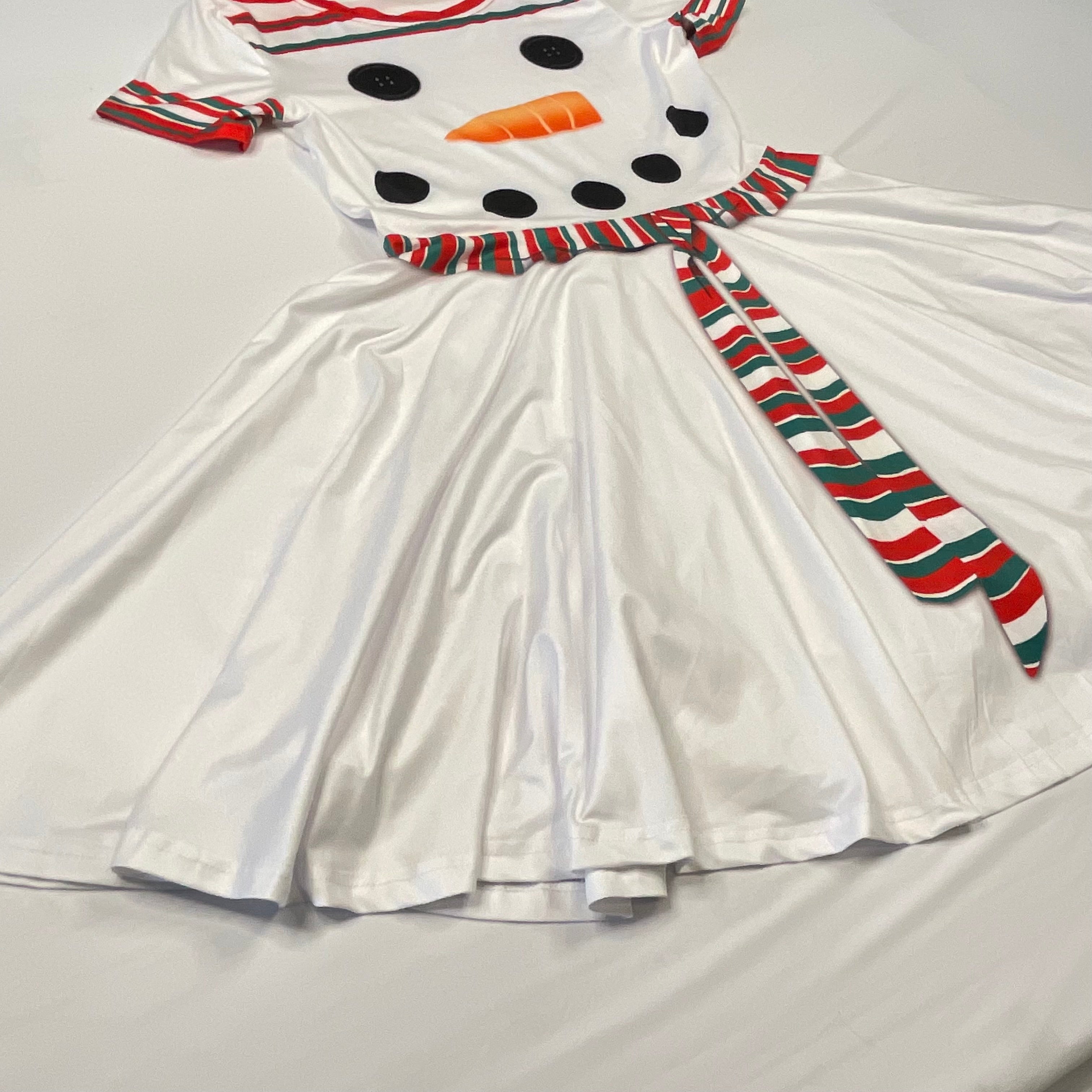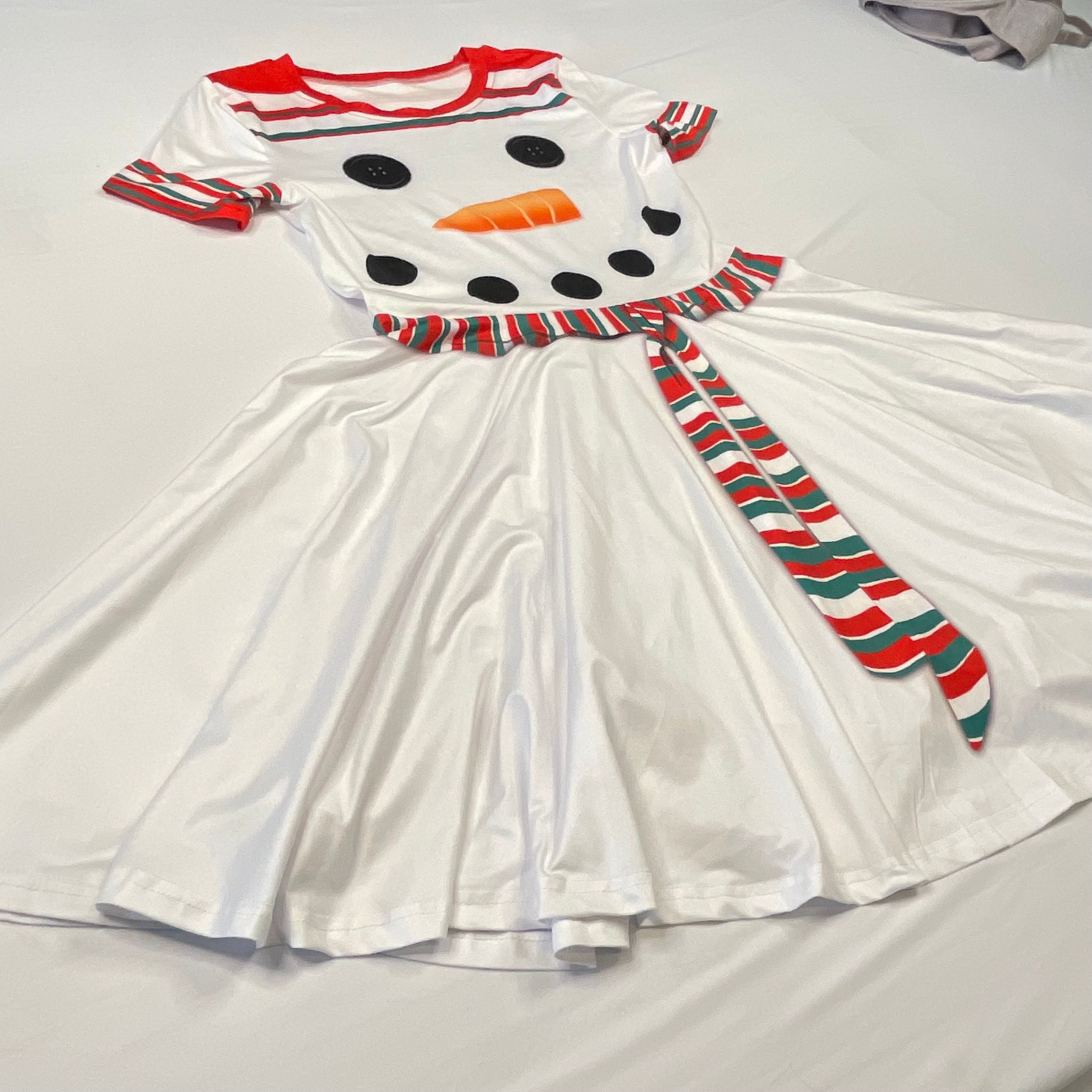 - Features: Snowman design, striped trim, waist tie, short sleeves, fit-and-flare style