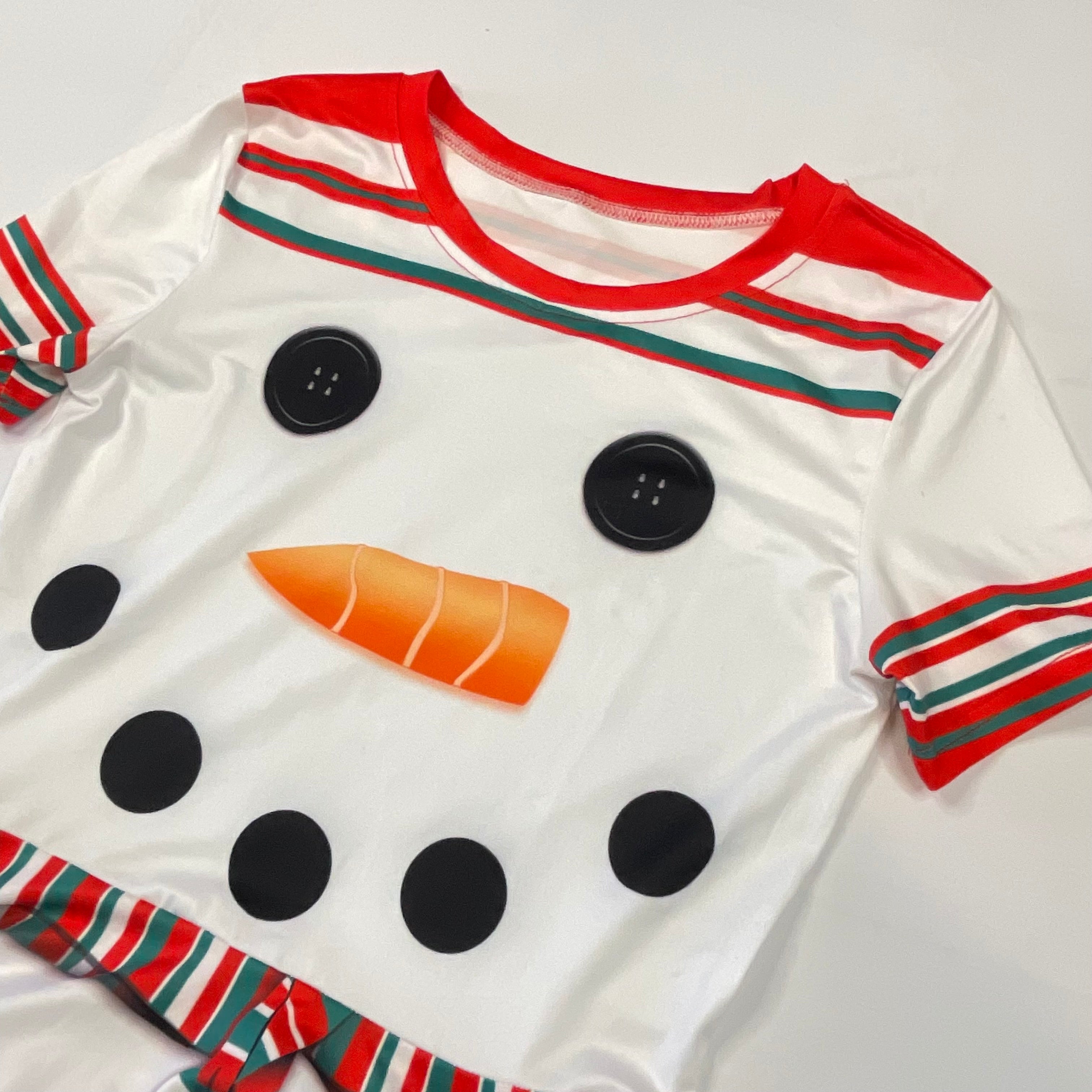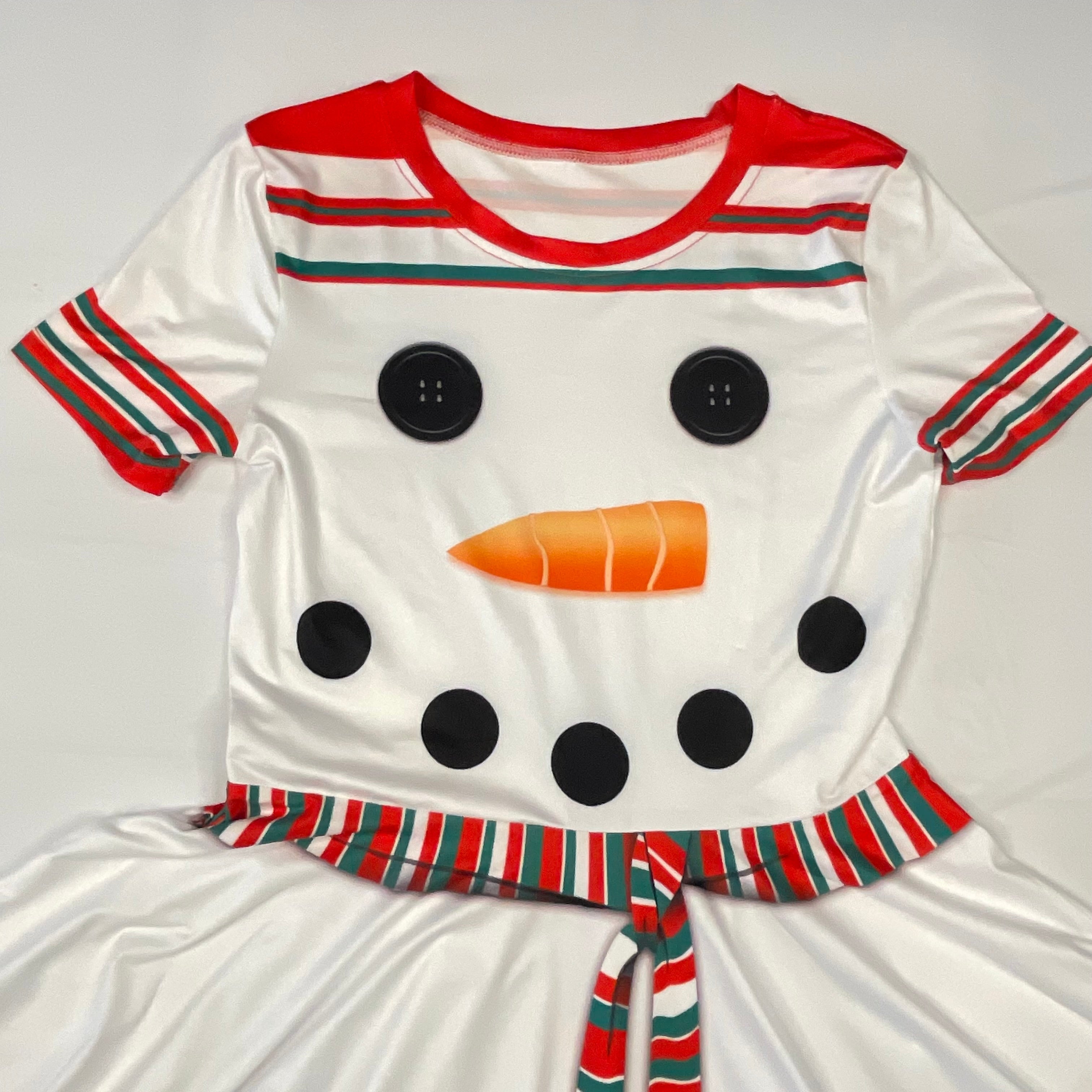 Get ready to spread holiday cheer with this absolutely adorable snowman dress! This playful white dress features a fun snowman design complete with button eyes, a carrot nose, coal buttons, and festive red and green striped trim on the sleeves and waist tie.