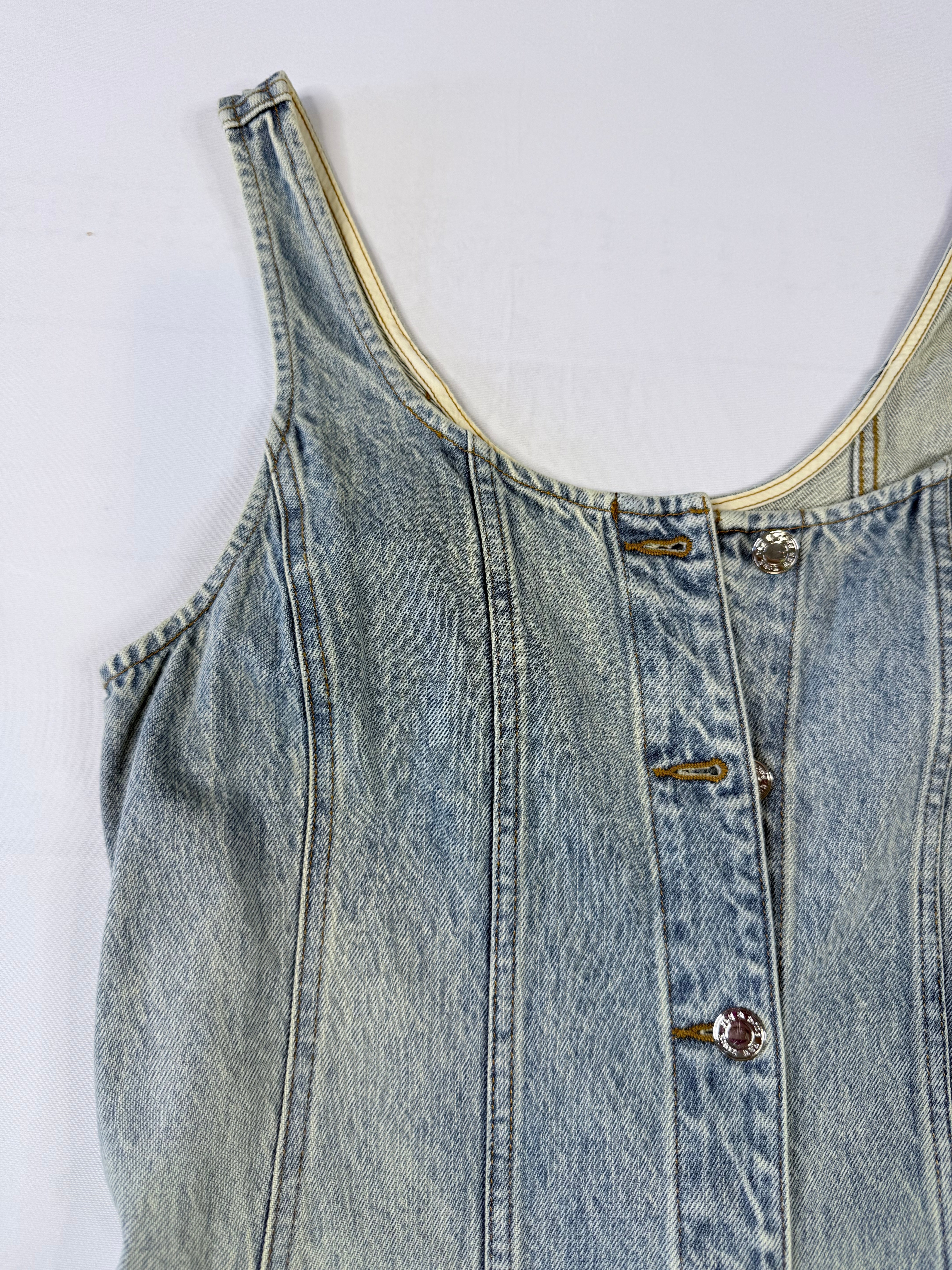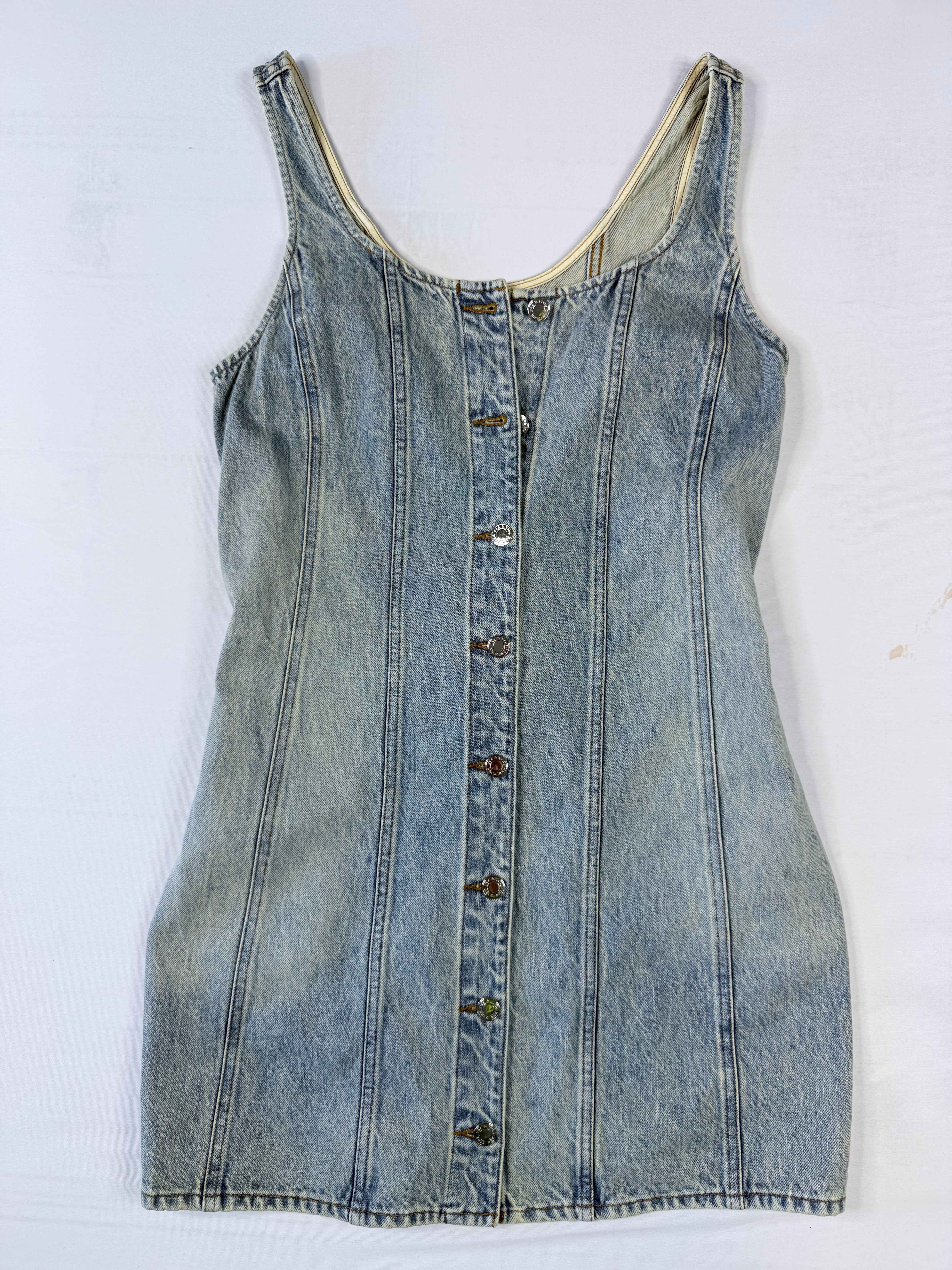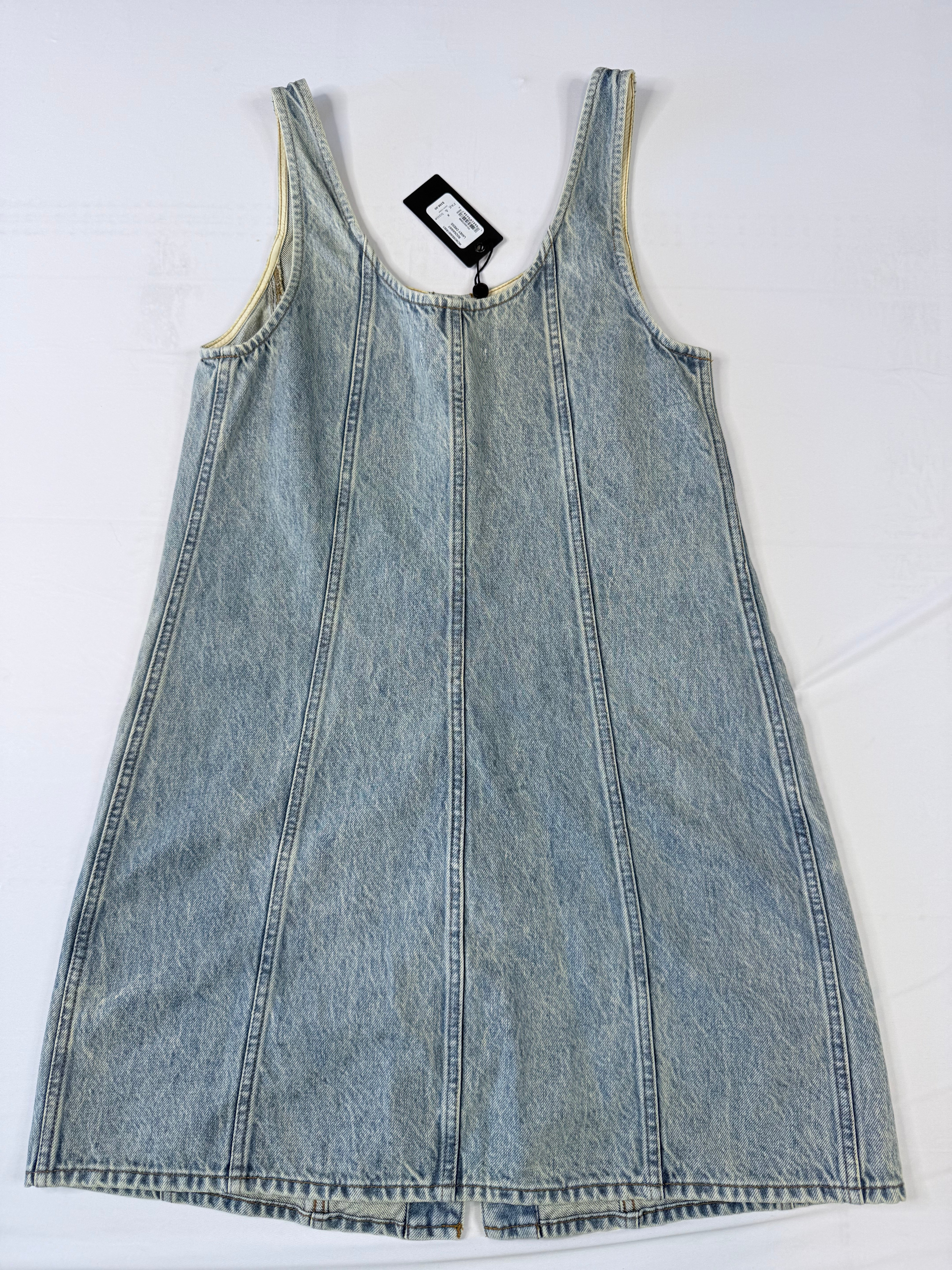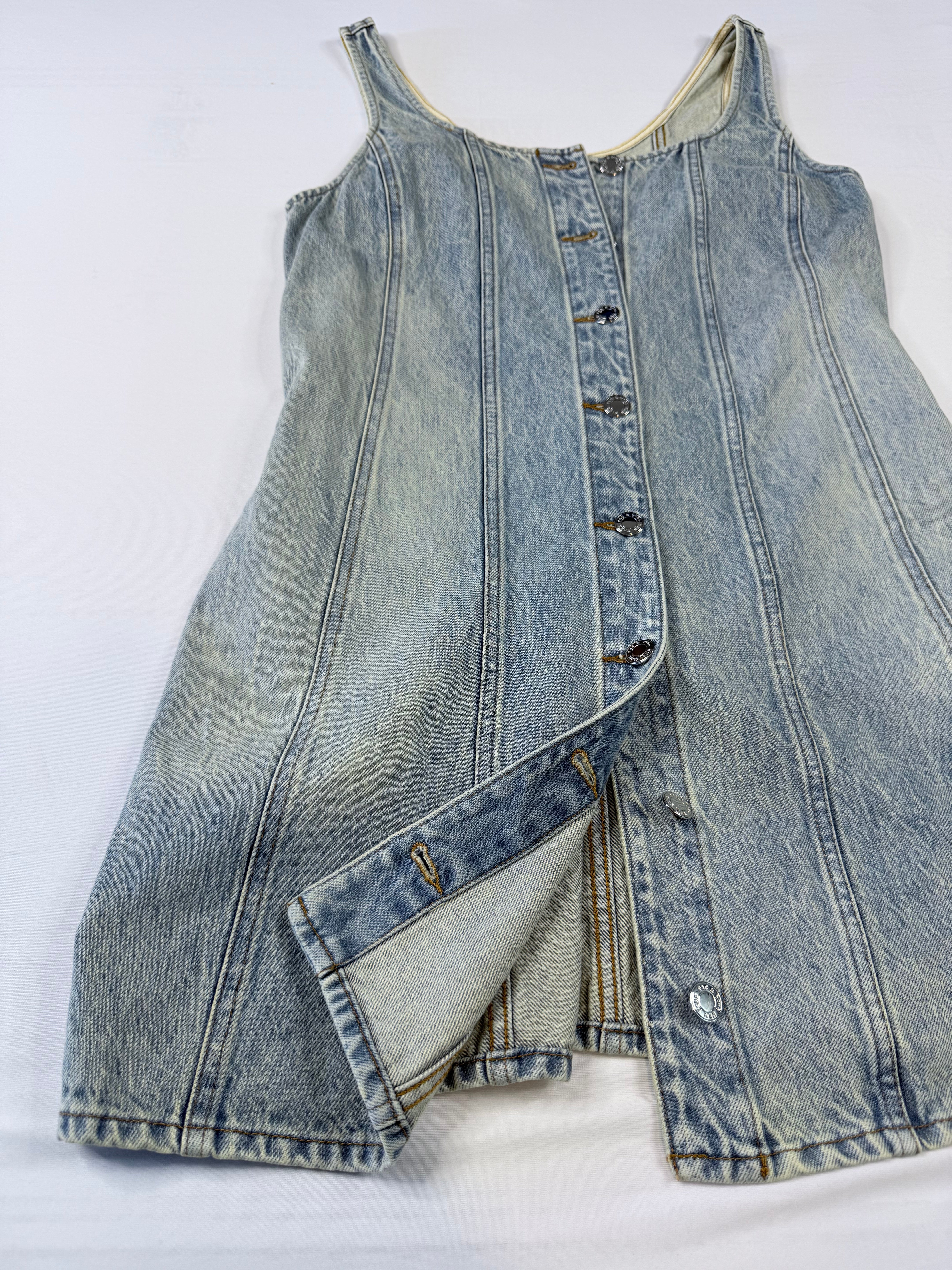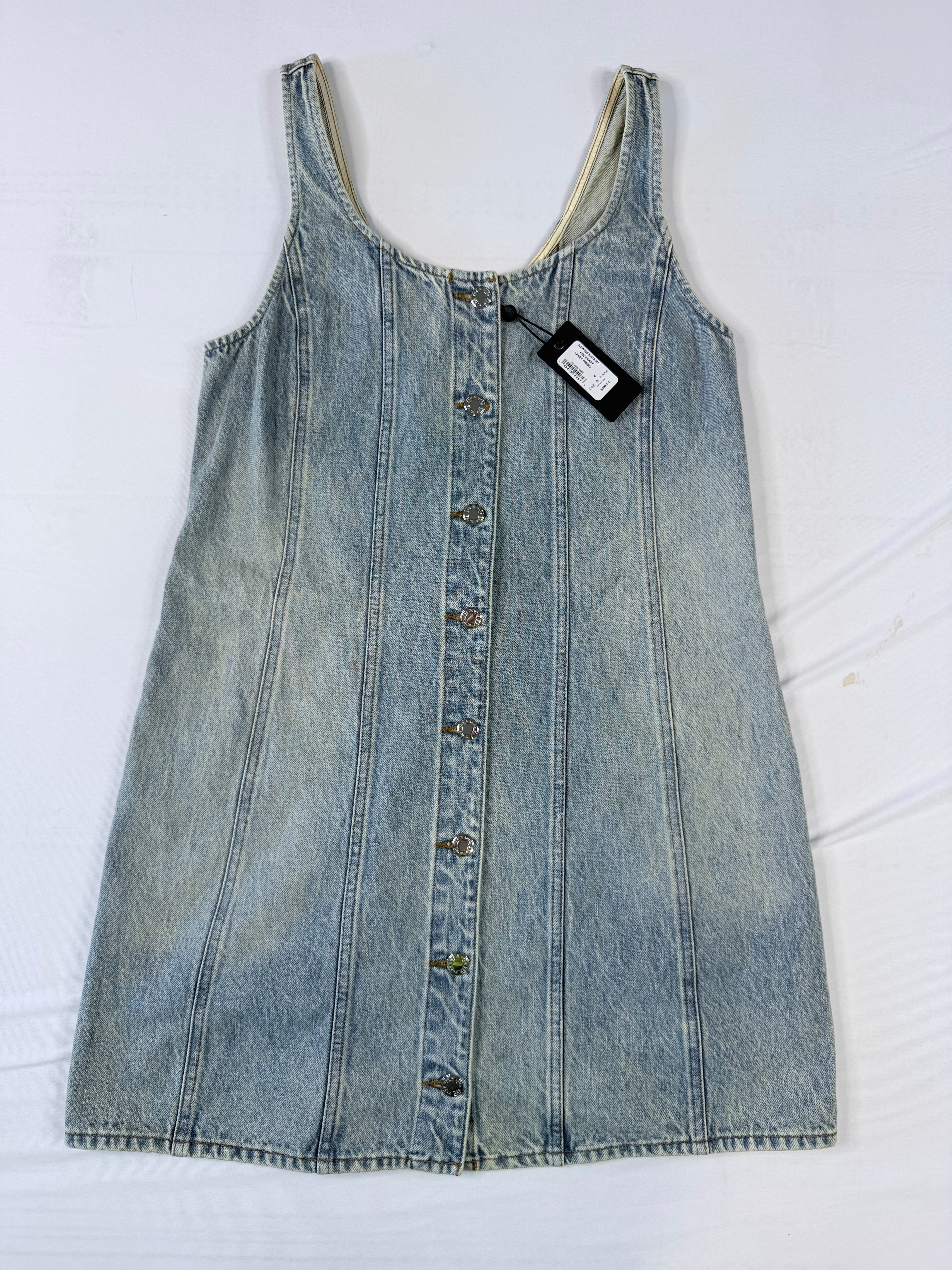 This Rag & Bone denim dress is a versatile piece that works for casual days or dressed up with the right accessories. Made from light wash denim with a flattering sleeveless design and button-front closure.