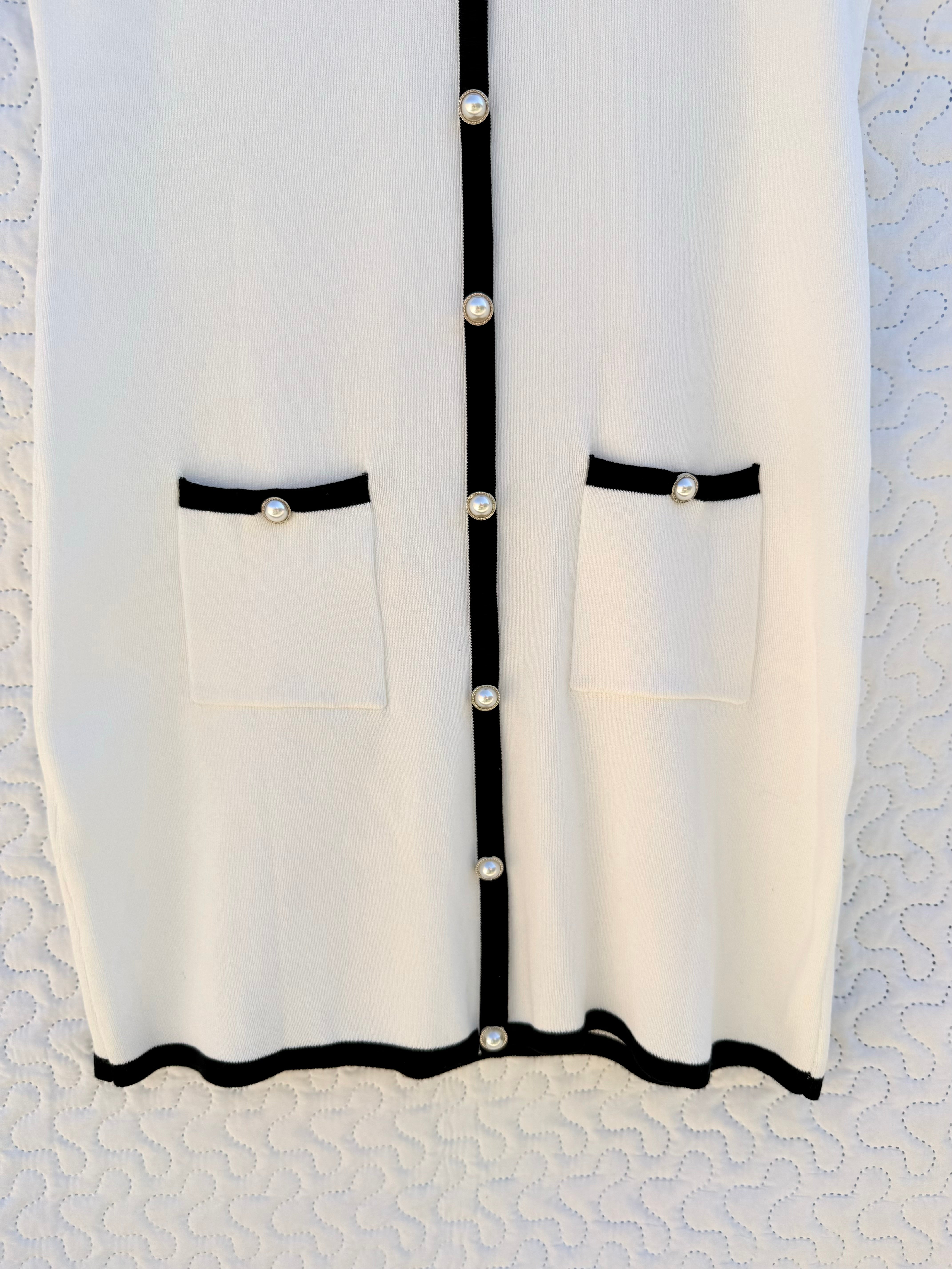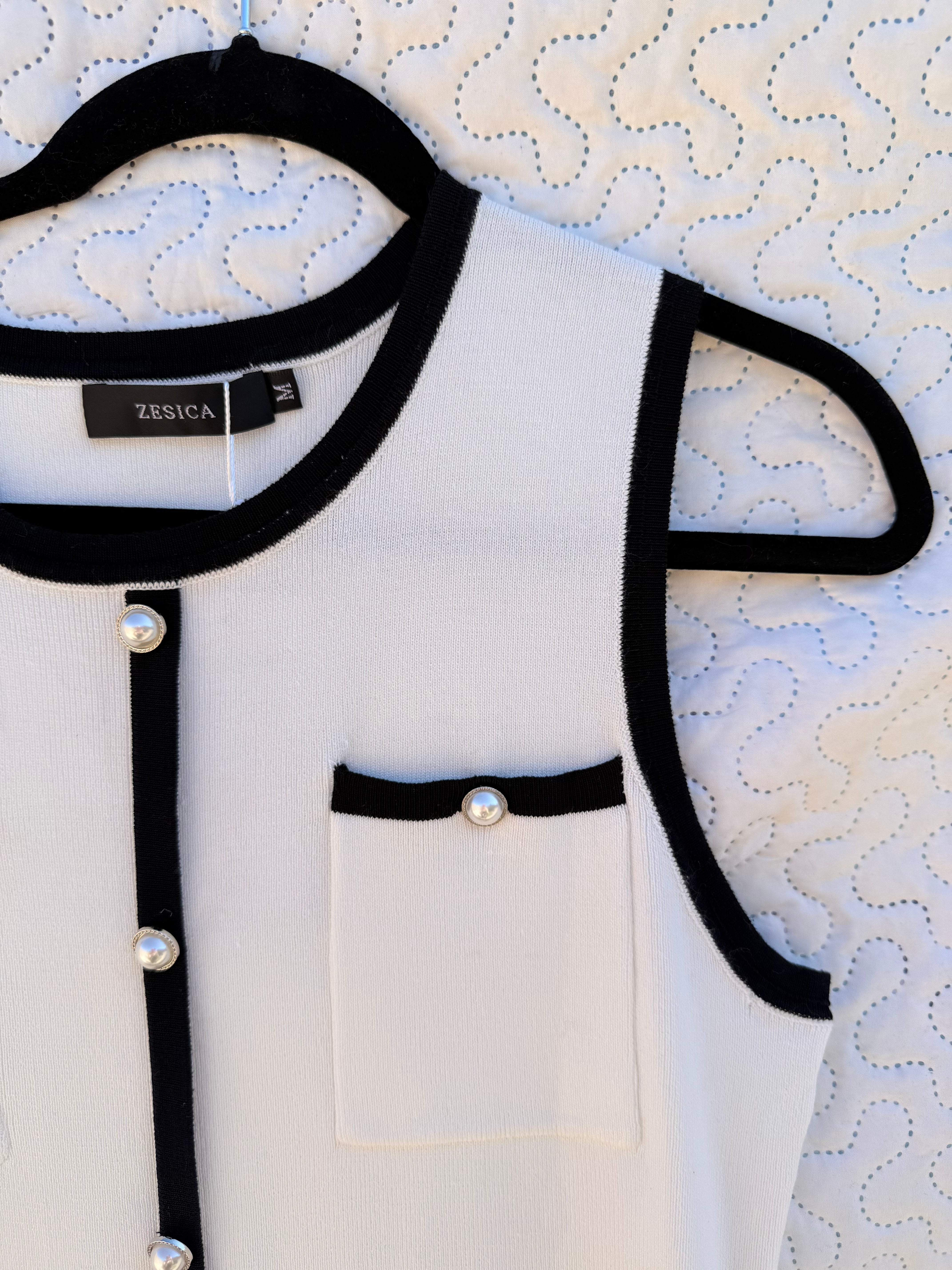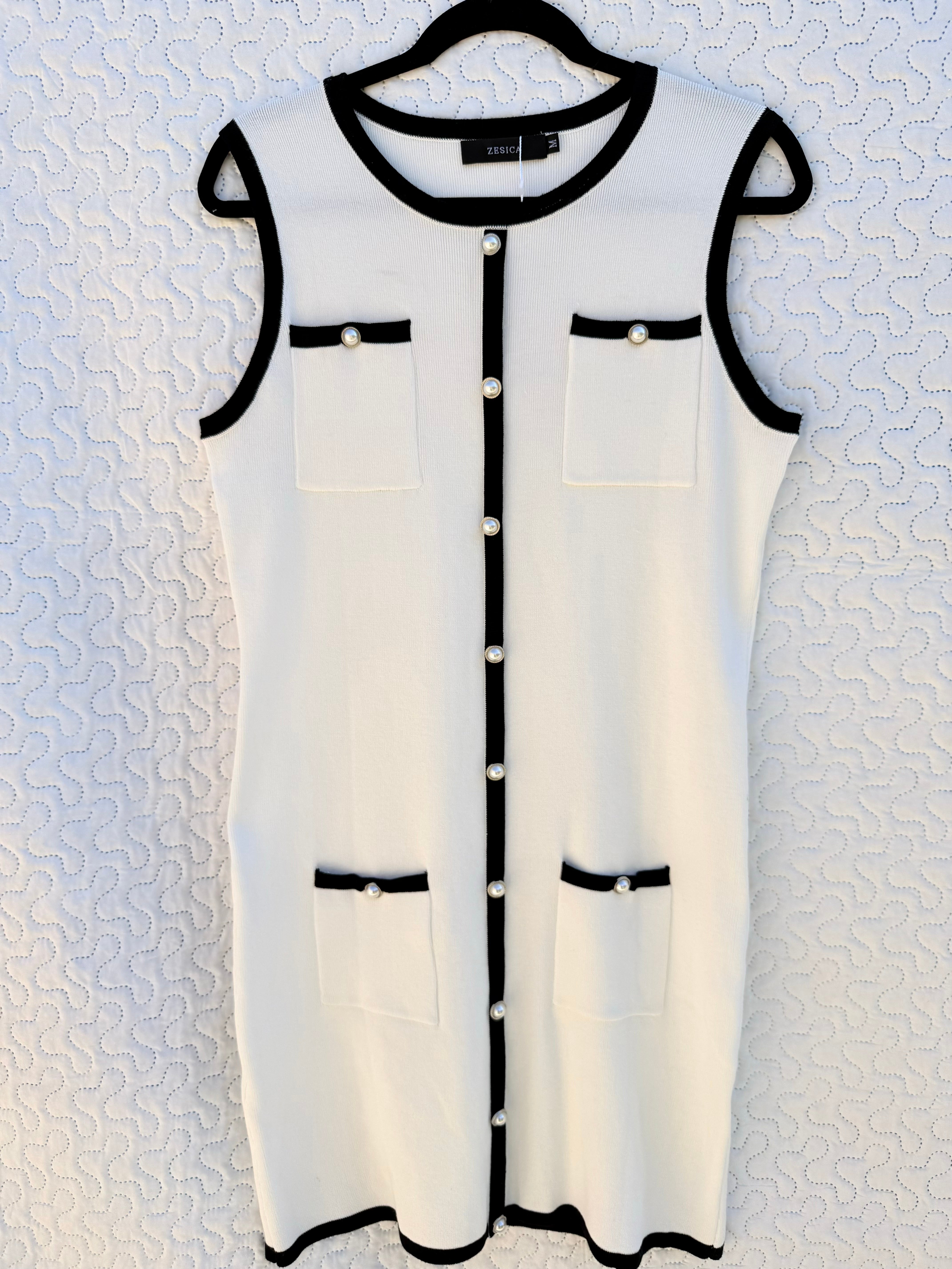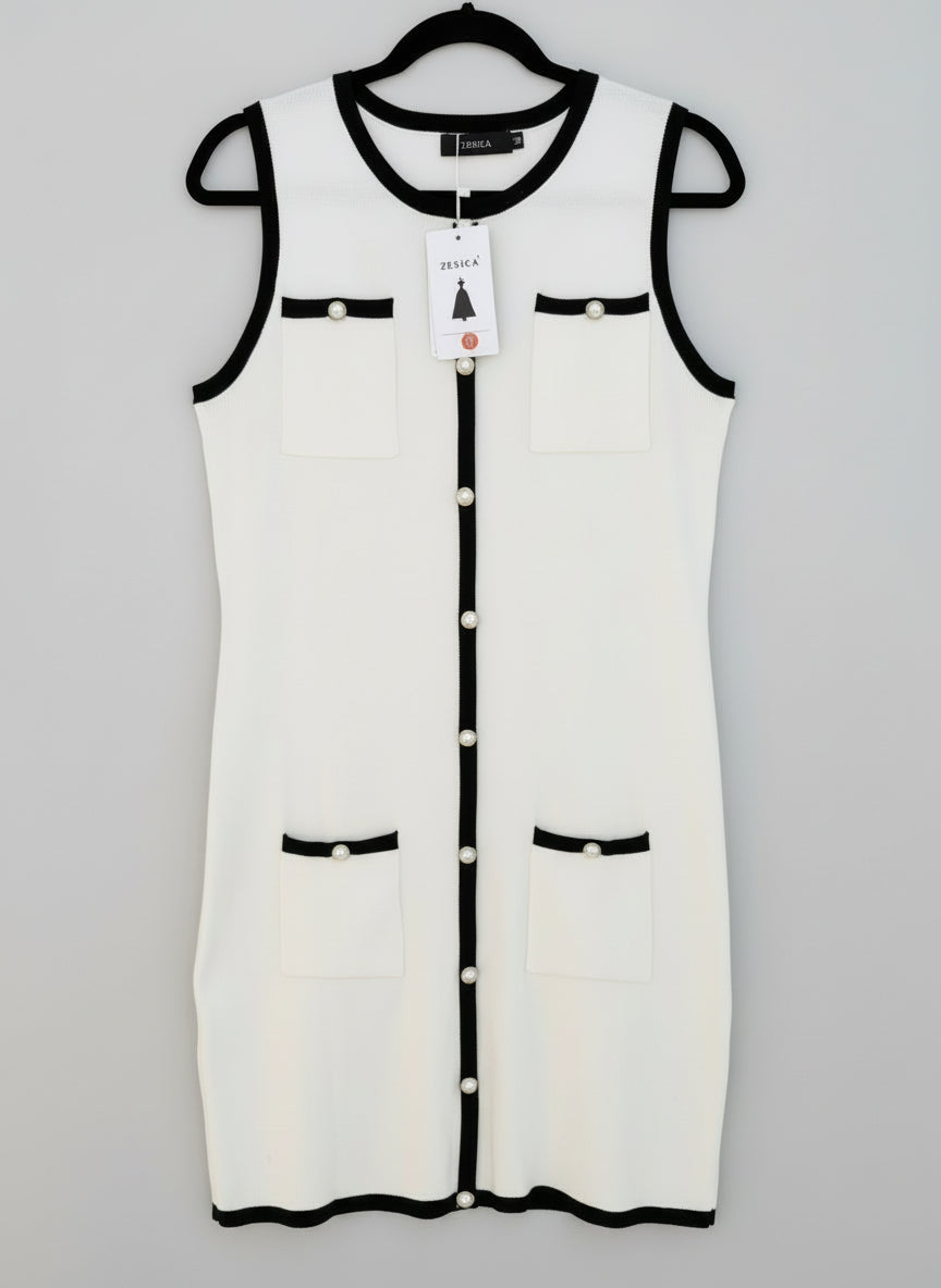 Zesica White Sleeveless Knit Dress with Black Trim & Pearl Buttons - Size M