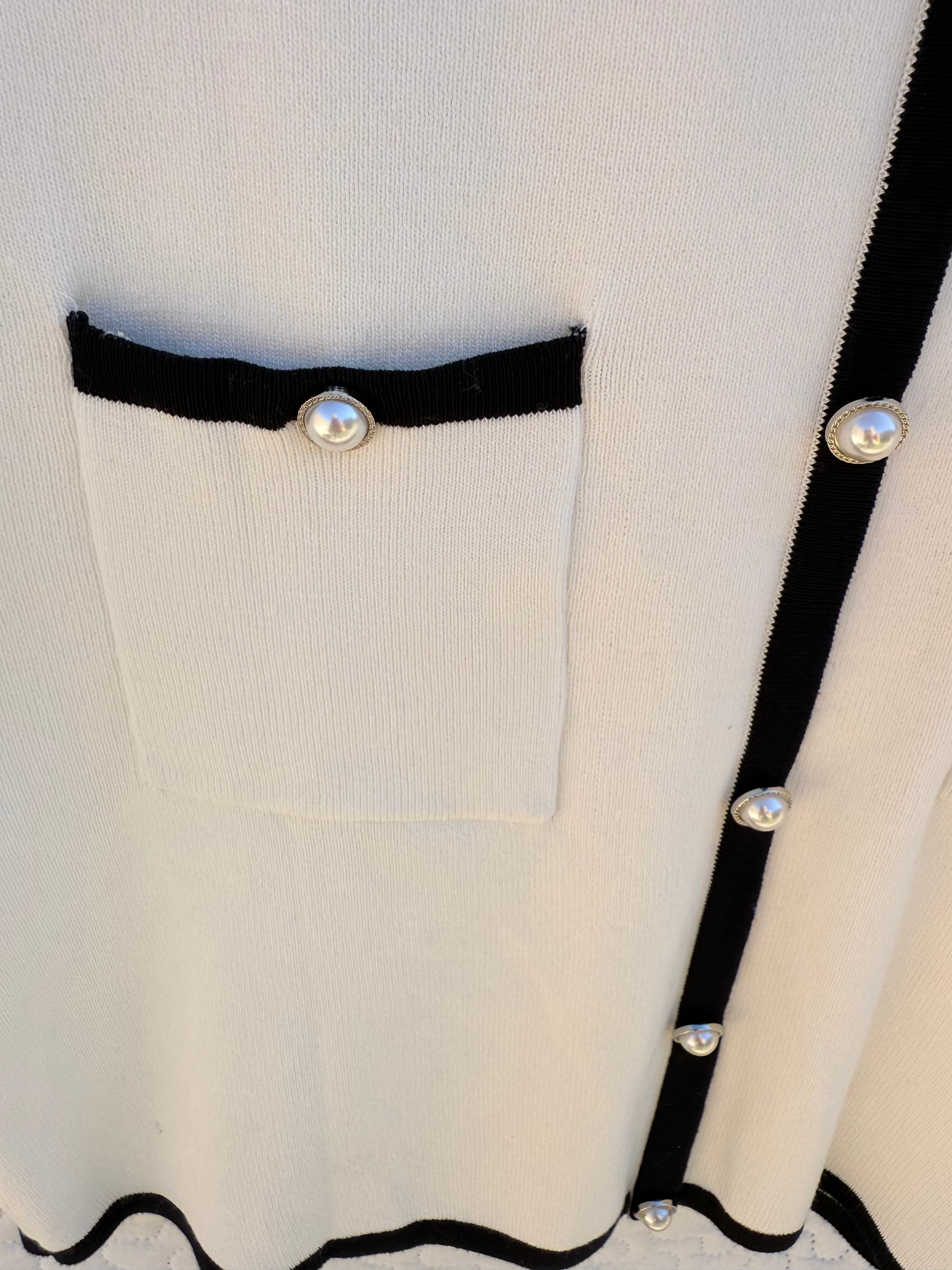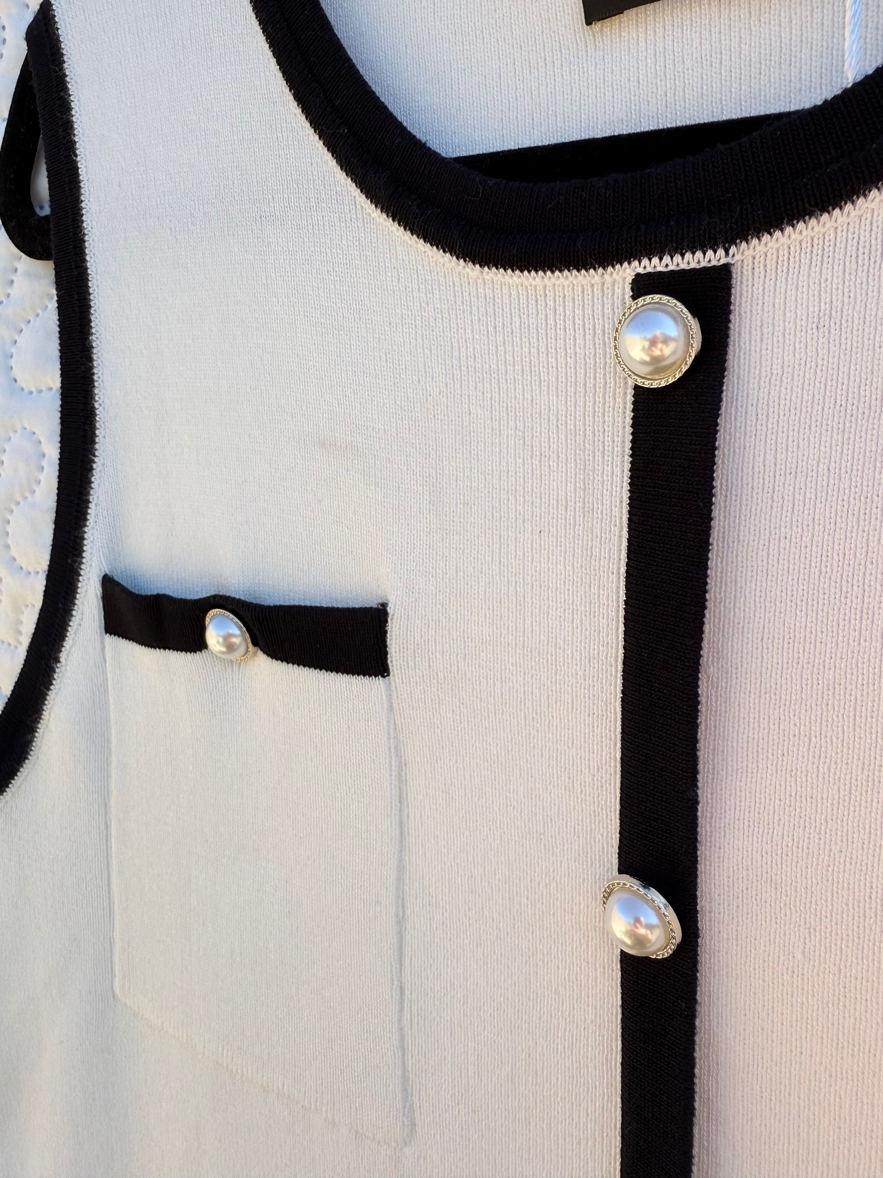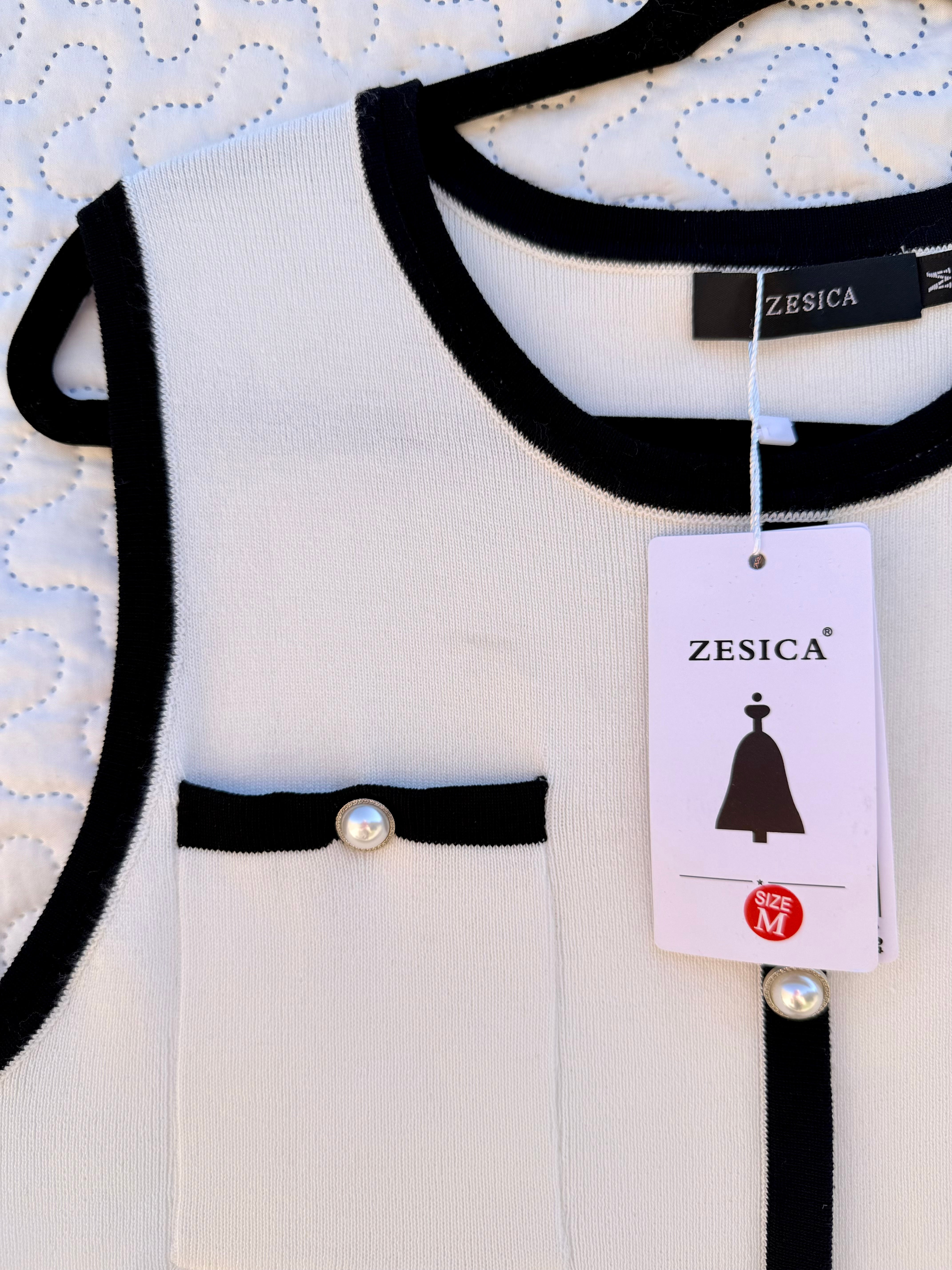 Zesica White Sleeveless Knit Dress with Black Trim & Pearl Buttons - Size M