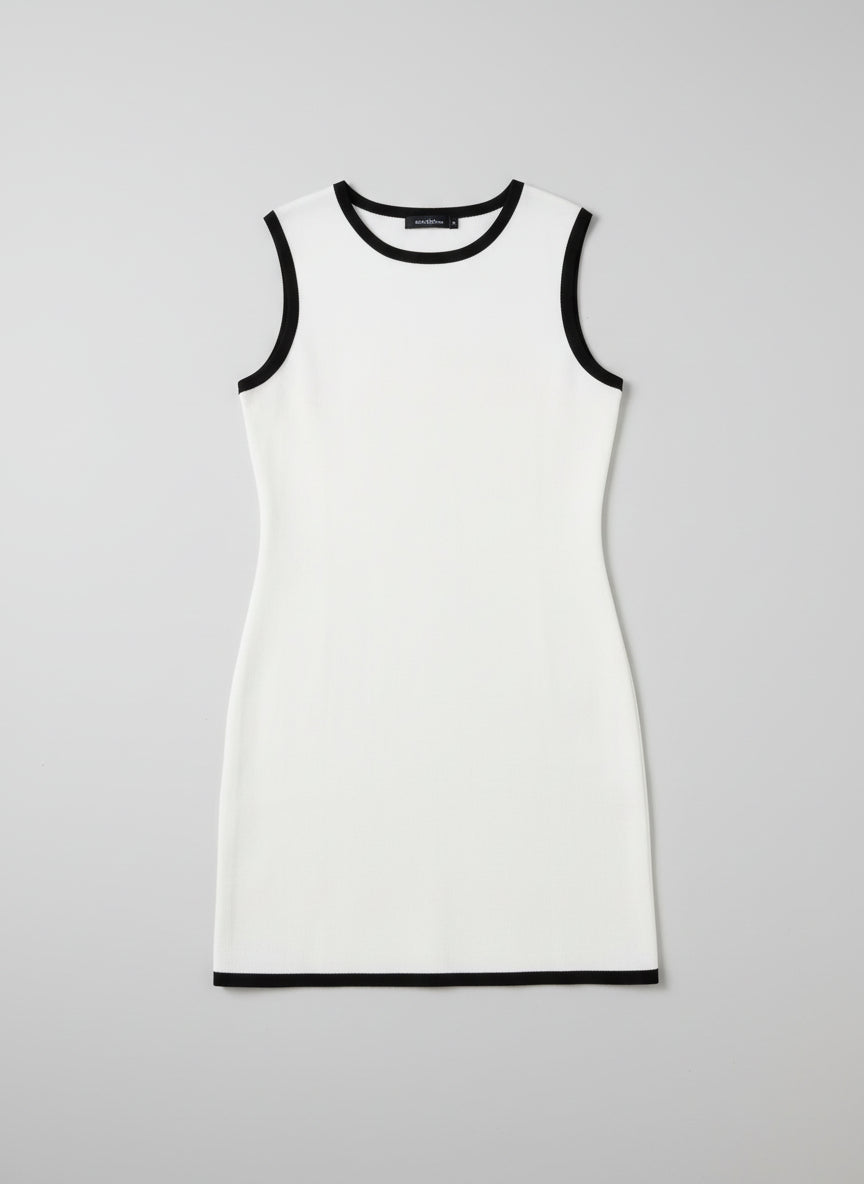 Channel timeless Chanel-inspired elegance with this sophisticated Zesica white sleeveless knit dress. The classic black contrast trim and lustrous pearl-style buttons create an iconic, polished aesthetic that never goes out of style. Crafted from a premium ribbed knit fabric, this dress offers comfortable stretch while maintaining a structured, tailored silhouette. The round neckline, sleeveless design, and functional front pockets trimmed in black add both style and practicality. Perfect for the office paired with a blazer, or dress it up for evening events with statement jewelry and heels.