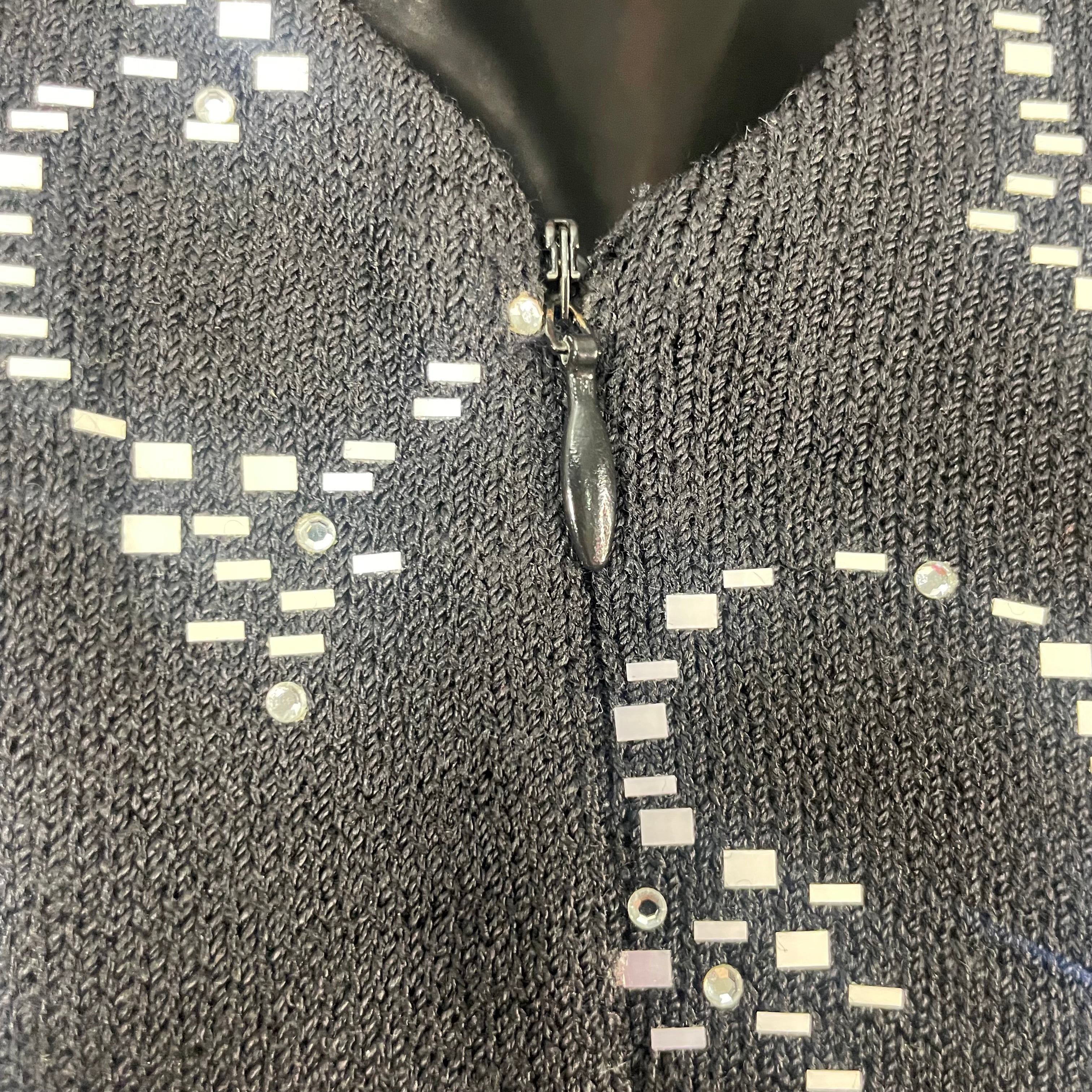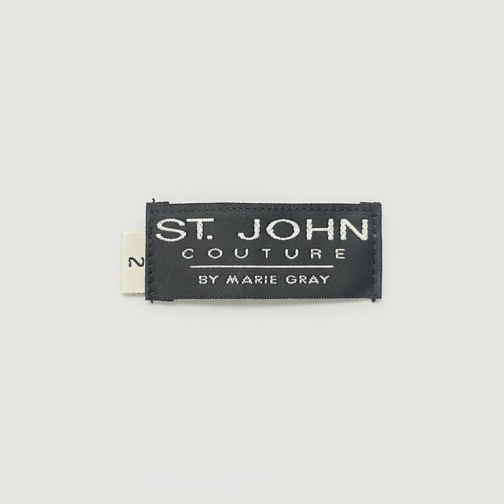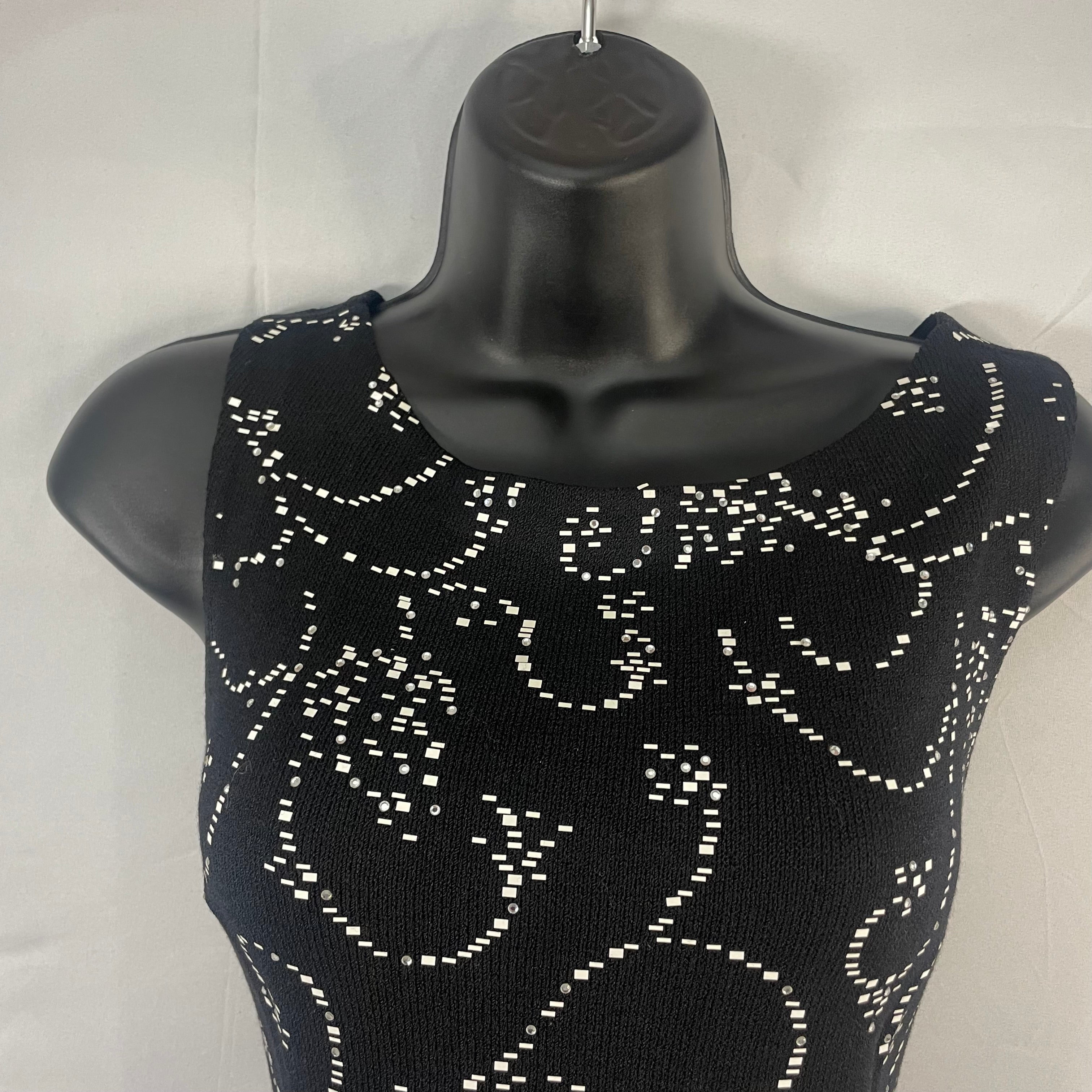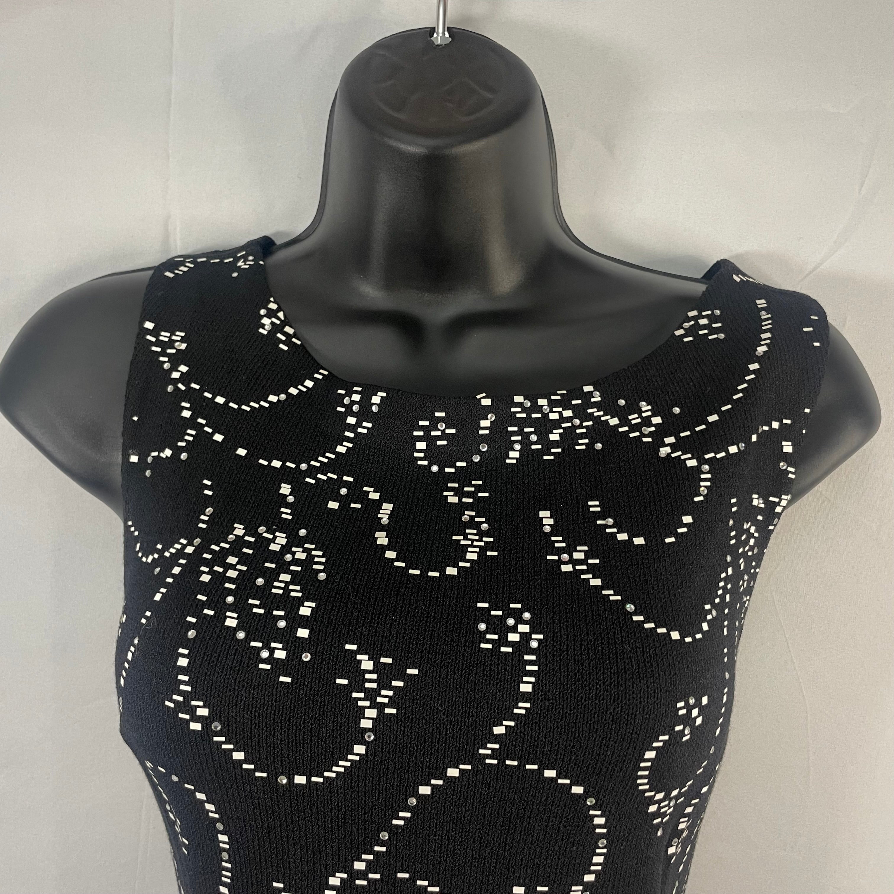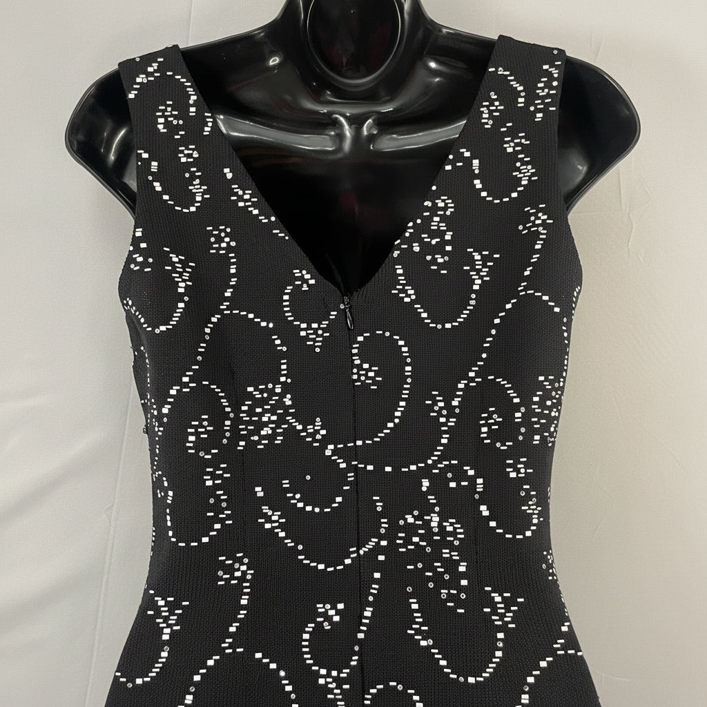 This exquisite St. John cocktail dress features stunning all-over rhinestone embellishments that create a mesmerizing sparkle with every movement. The classic black silhouette and sleeveless design offer refined elegance, while the intricate beading elevates this piece to true special-occasion status.