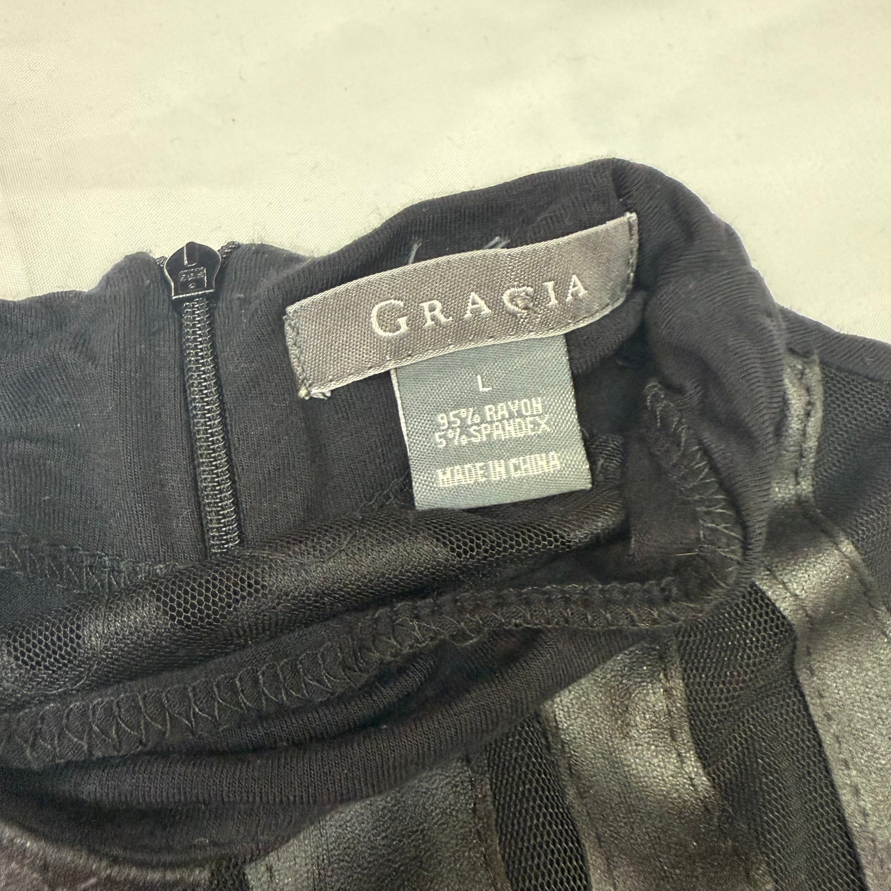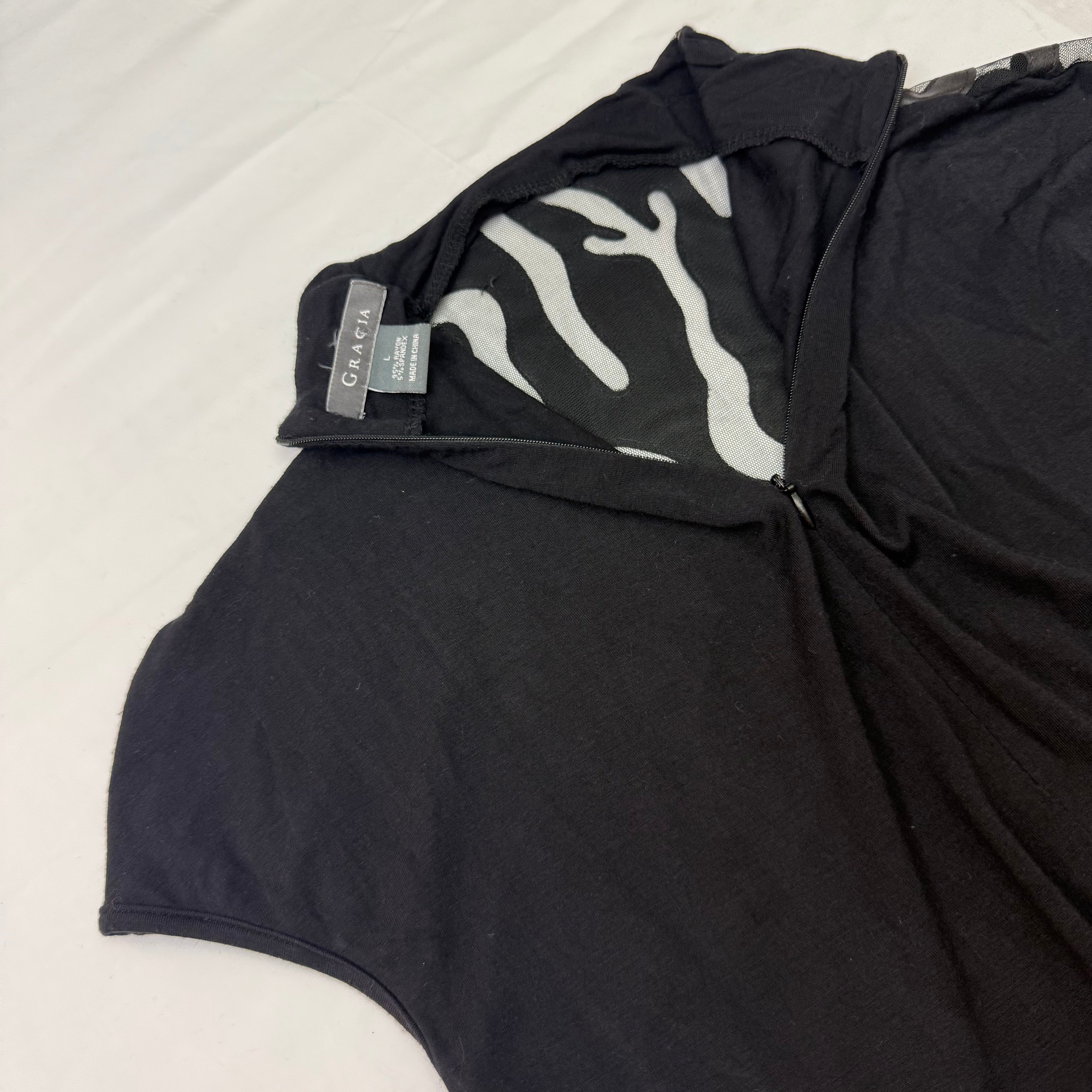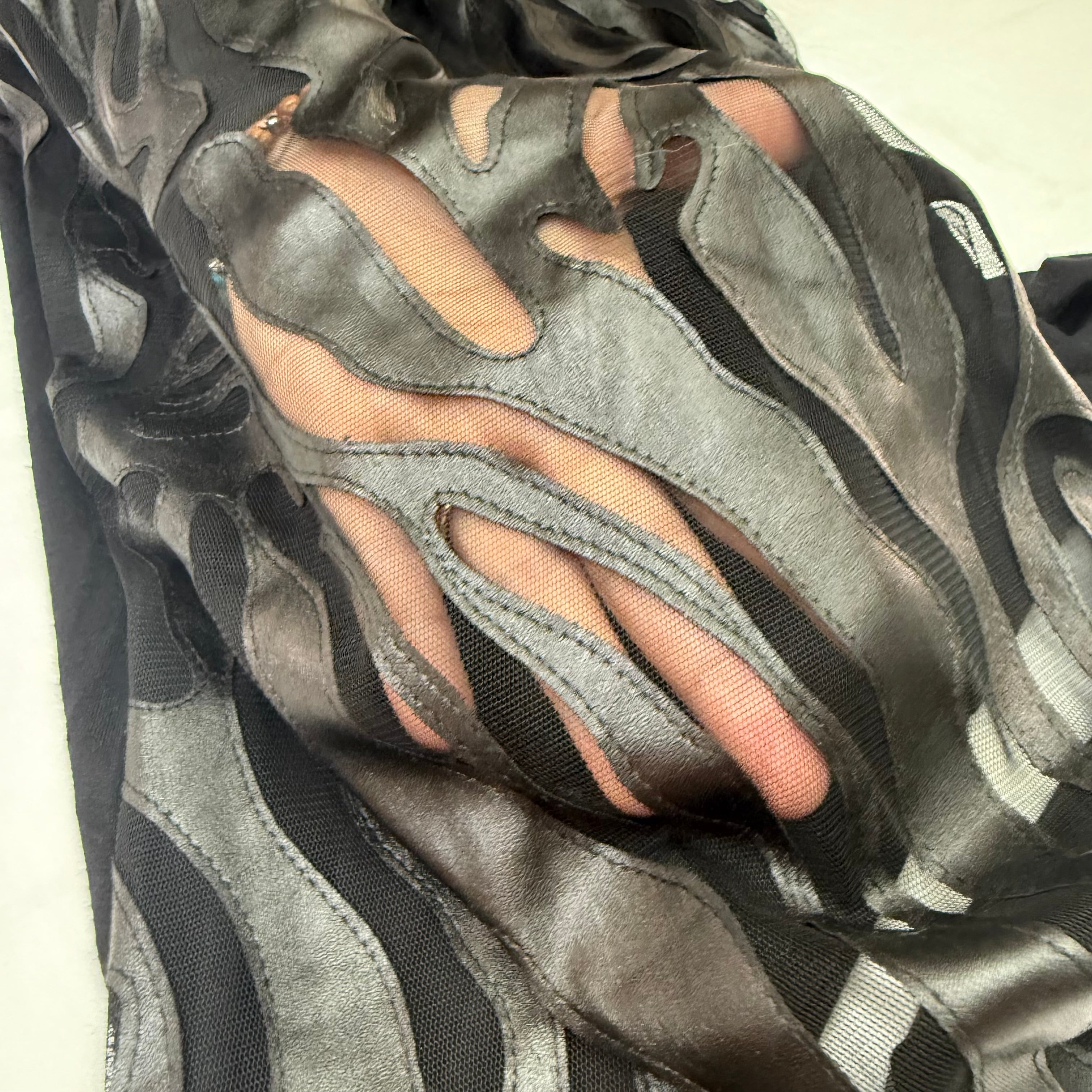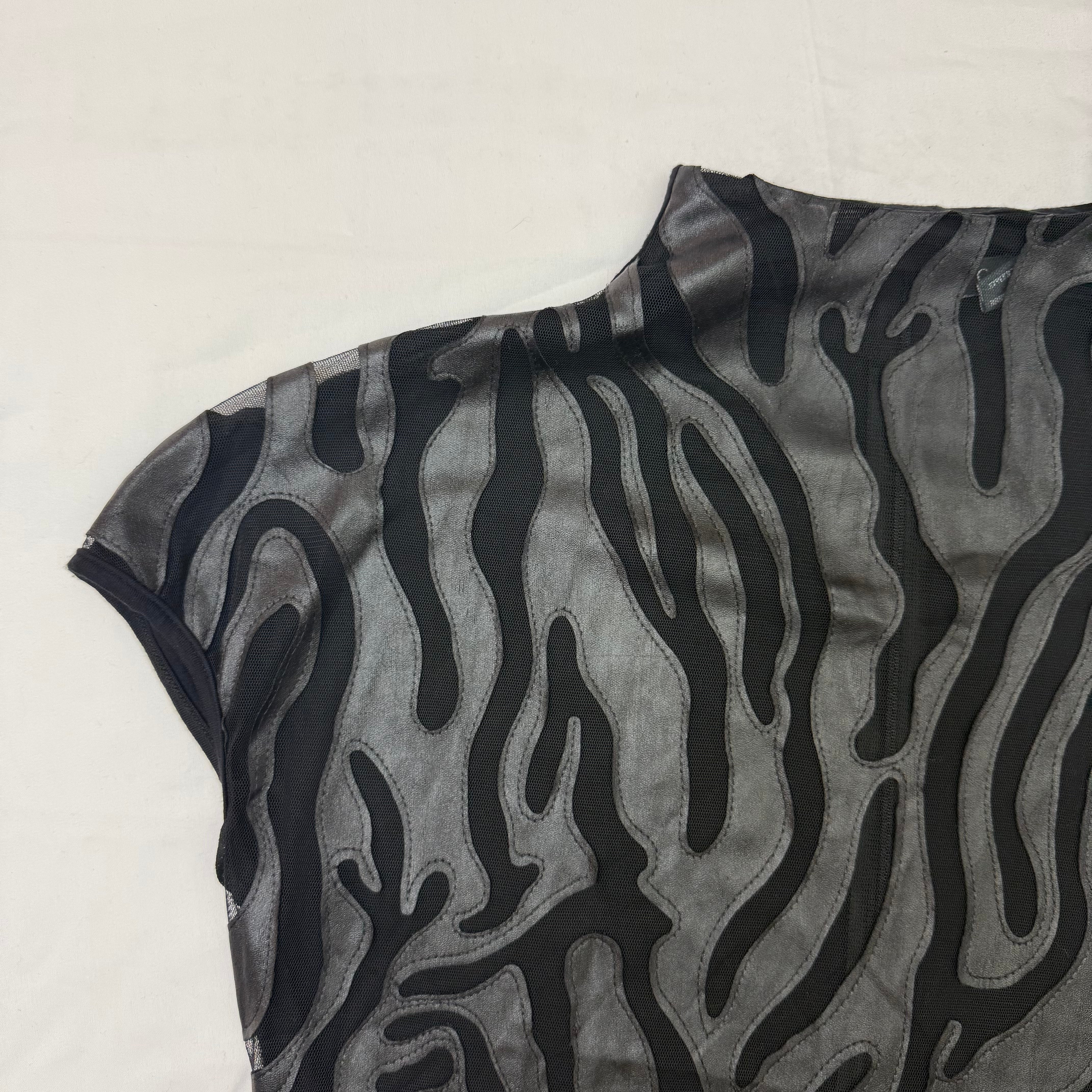 This stunning Gracia top in size Large combines luxe leather panels with sheer mesh for a bold, fashion-forward look. The eye-catching animal print adds a wild touch, while the high neckline and micro sleeves create a sleek, modern silhouette. The mix of textures—smooth black leather paired with sheer mesh—makes this piece a true statement top. Gracia is known for their contemporary designs that blend edge with elegance.