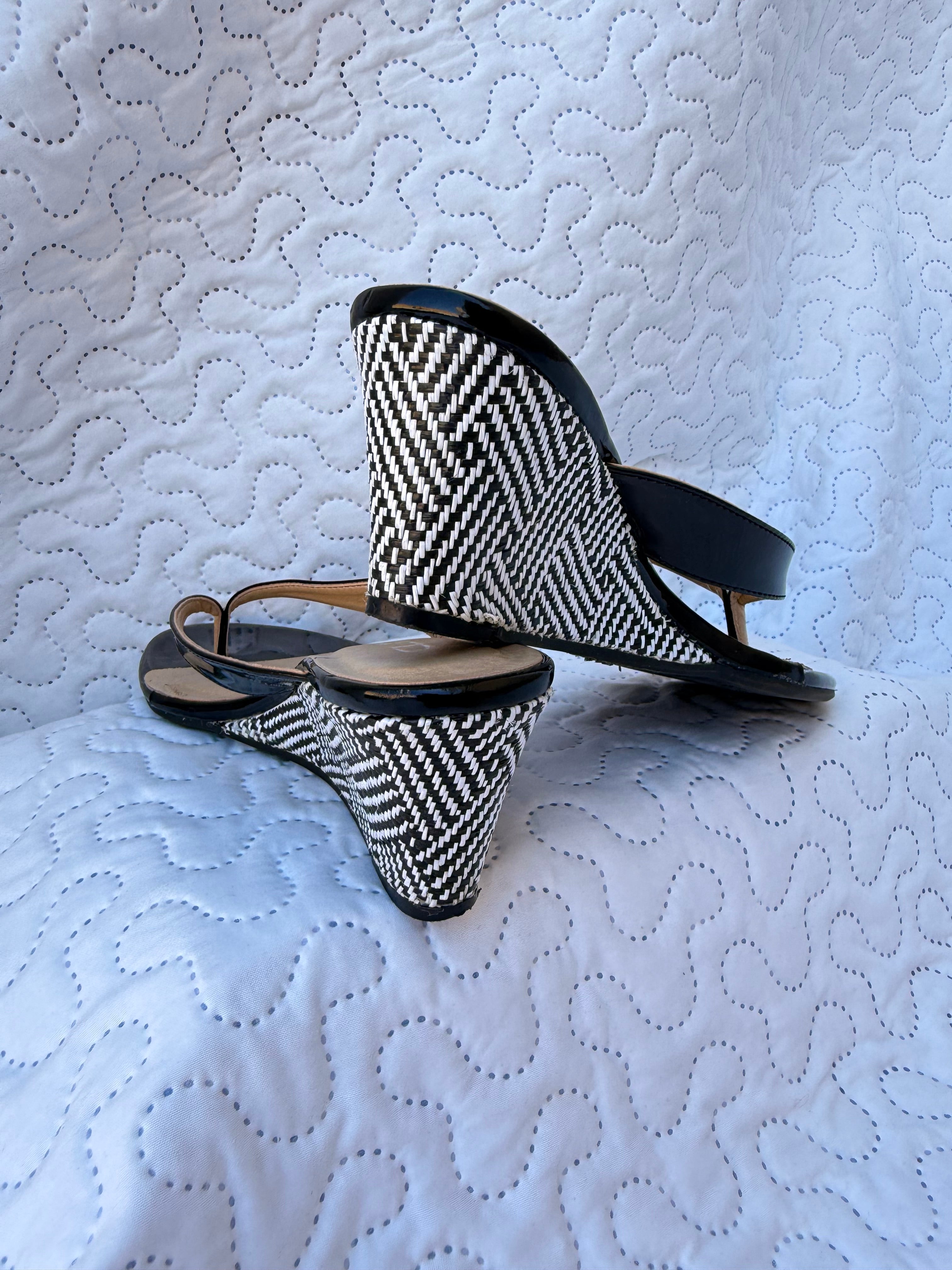 Condition Report: These sandals are in good preowned condition showing normal signs of wear consistent with use. The patent leather uppers show minor wear, and the soles show wear from walking. The houndstooth heels remain in good condition with no significant damage.