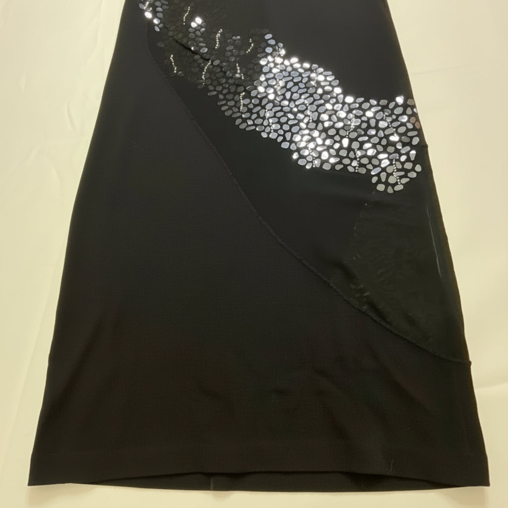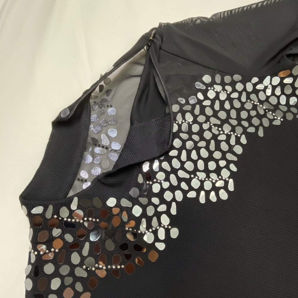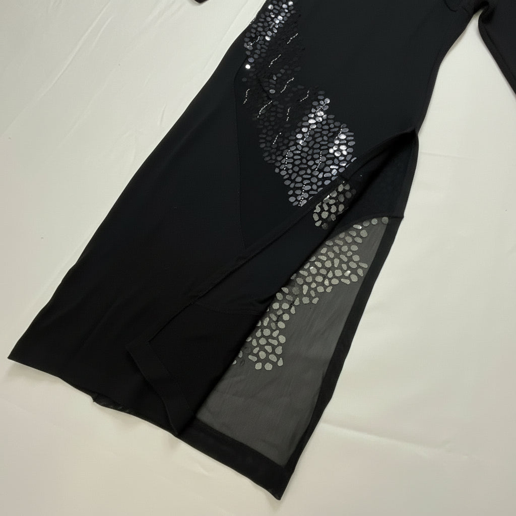 This stunning evening gown showcases St. John's signature attention to detail and impeccable construction from their highly collectible Fall 2003 Group 5 collection. The luxurious Santana knit fabric drapes beautifully and maintains its shape wear after wear, while the dramatic floor-length silhouette features sheer mesh sleeves and an exquisite diagonal cascade of crystal embellishments that catch the light with every movement. The high mock neckline adds sophisticated elegance, while the body-skimming fit creates a sleek, red-carpet-worthy silhouette. A 20-inch side slit adds graceful movement and ease of wear, making this gown as functional as it is beautiful. Dating from 2003, this piece represents St. John during their golden era of American luxury knitwear—a period now highly sought after by vintage collectors and St. John enthusiasts. The Santana collection is particularly coveted in the collector's market for its superior quality, timeless design, and investment value that appreciates over time. Whether you're building a curated St. John collection, attending a gala, or seeking a museum-quality evening piece, this gown delivers the sophistication and polish that only authentic vintage St. John can provide.