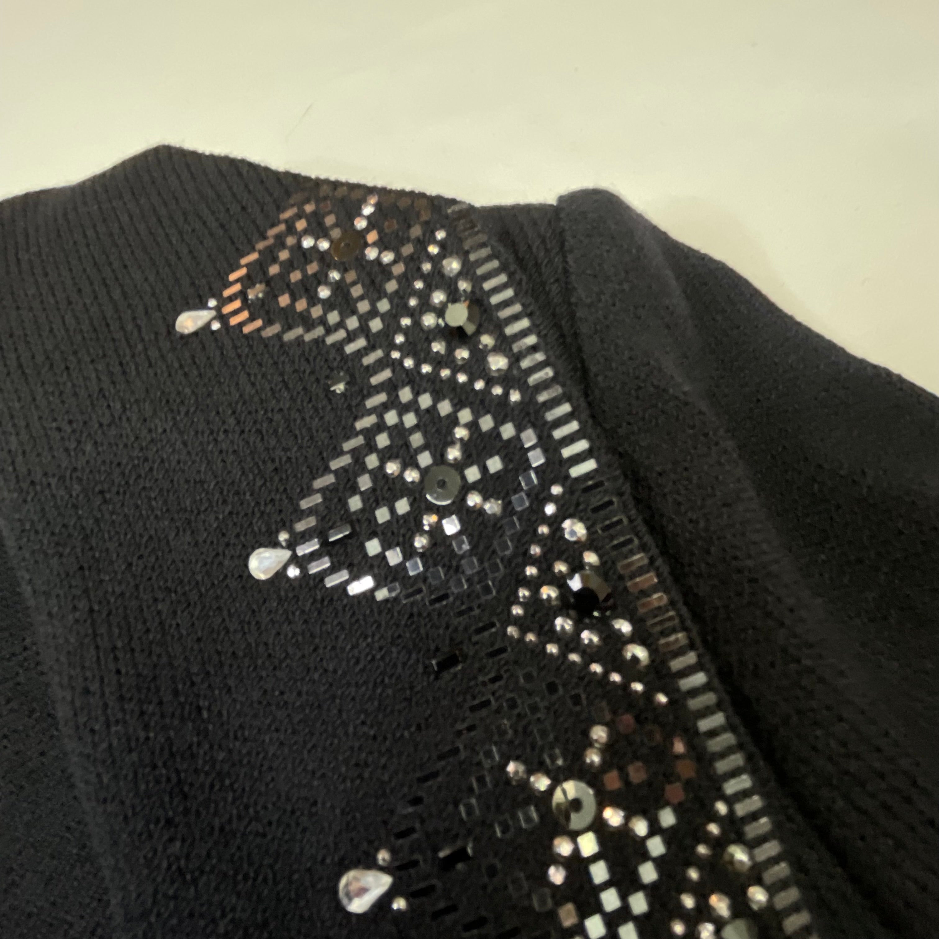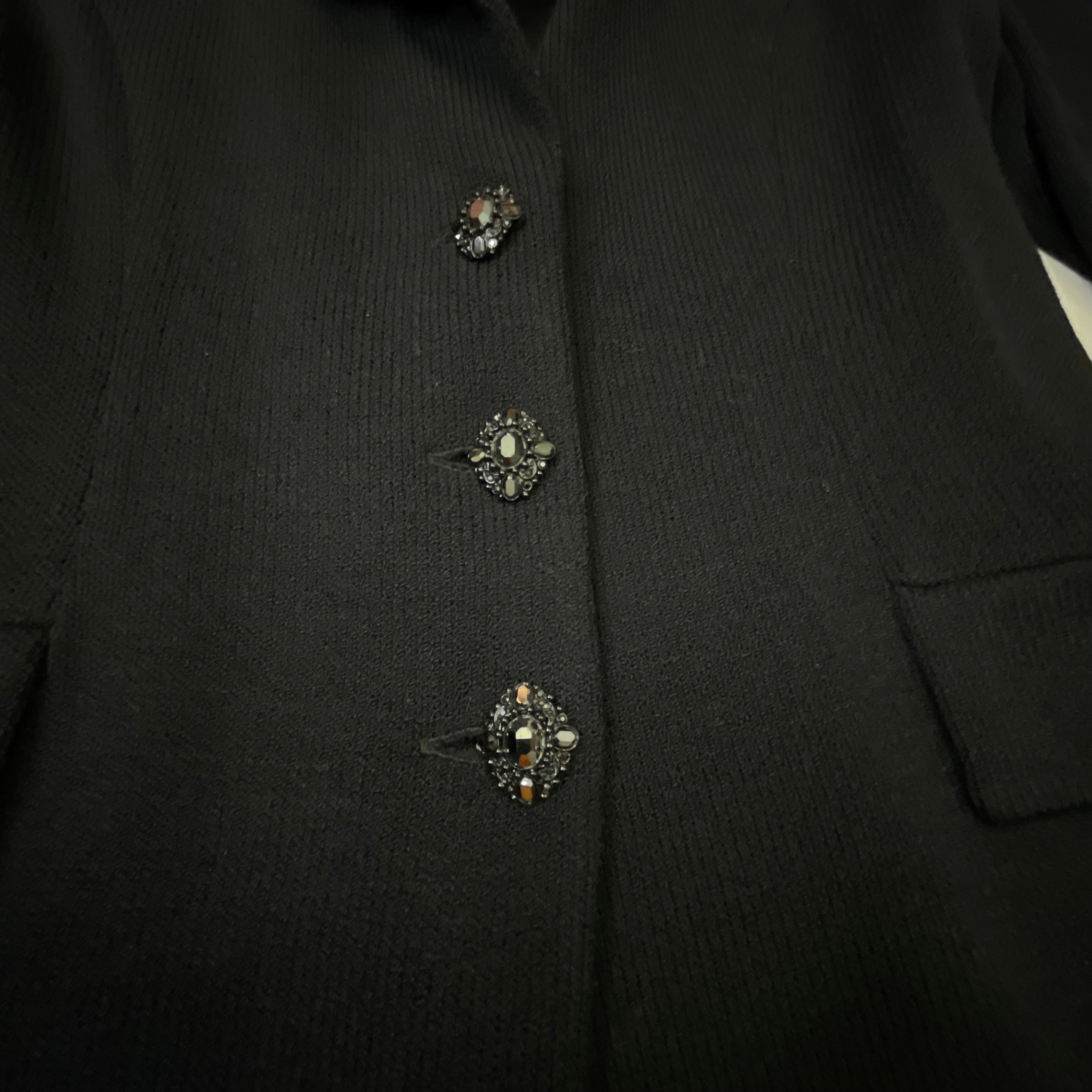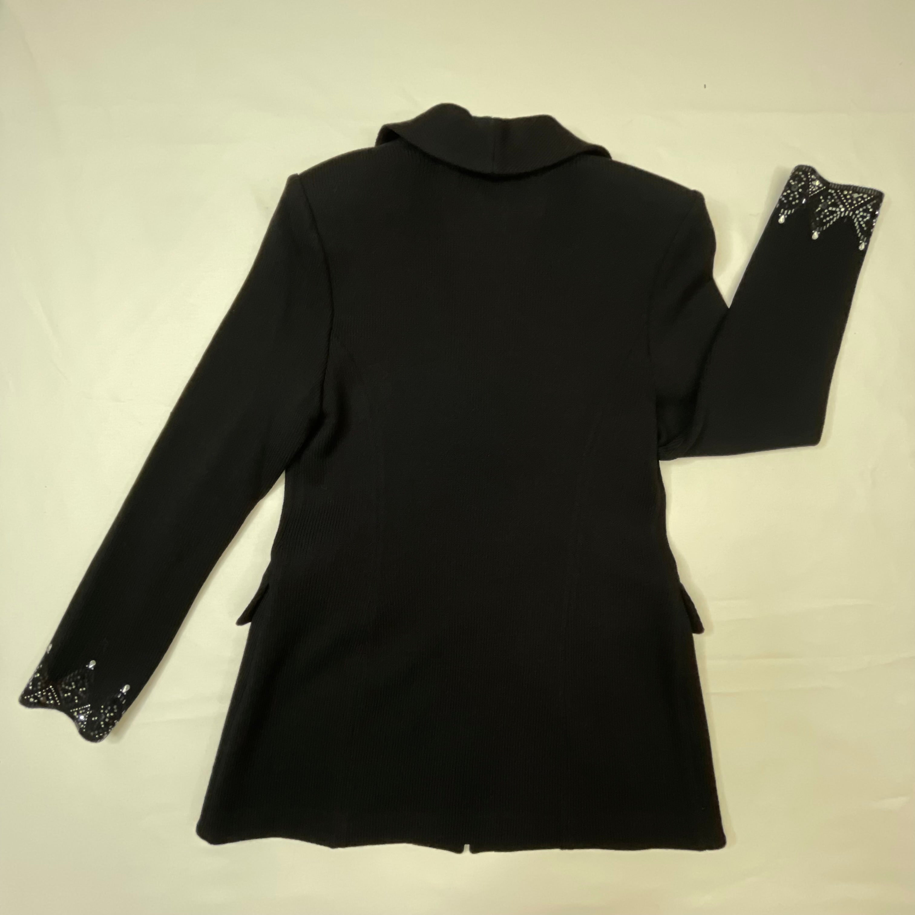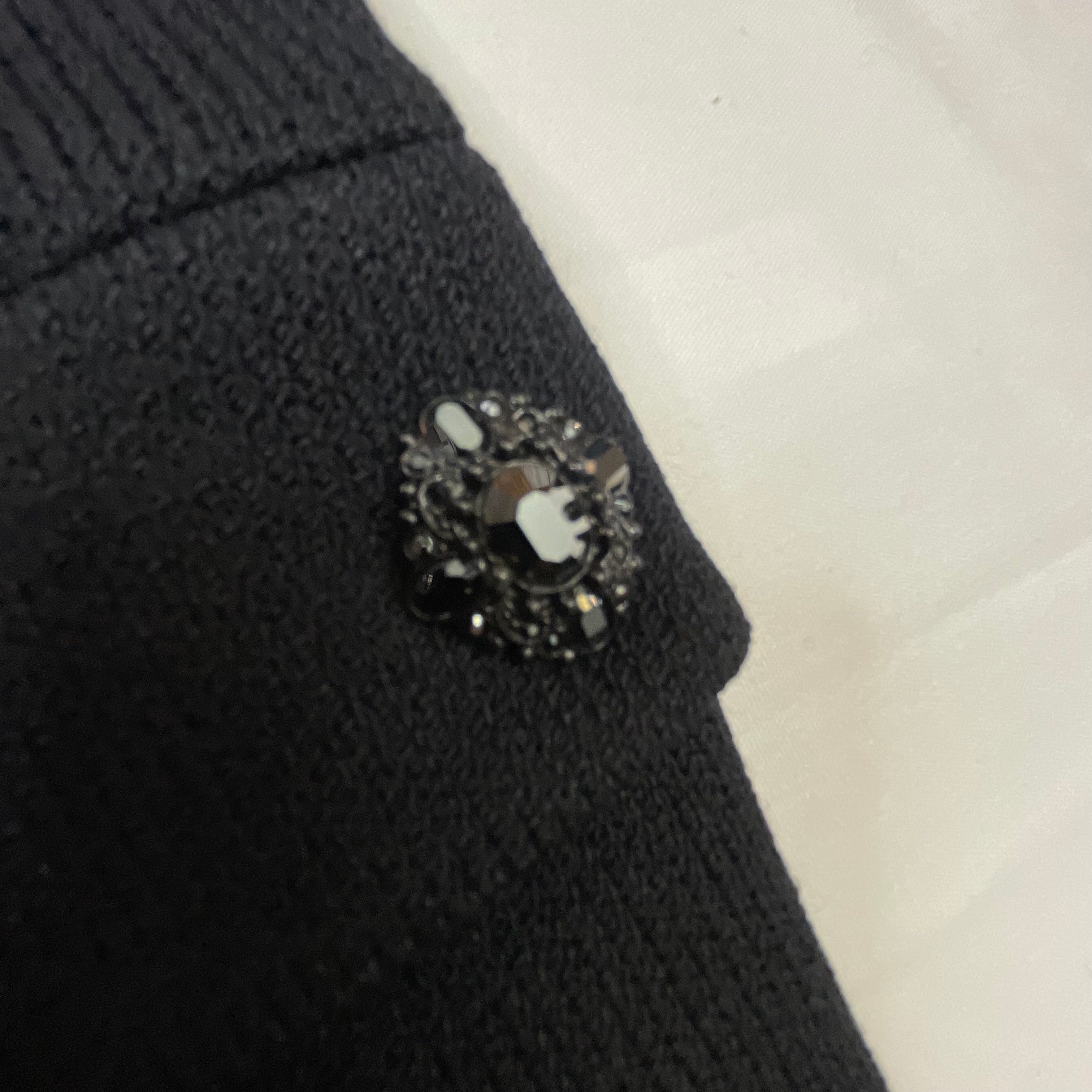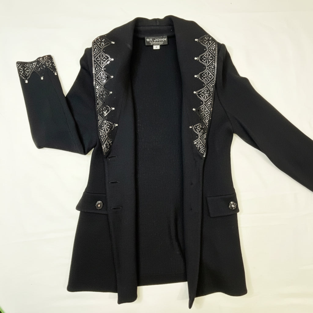 This stunning black Santana knit blazer showcases St. John Evening's signature attention to detail with exquisite crystal embellishments adorning the lapels, cuffs, and decorative buttons. The intricate crystal work creates a dazzling geometric pattern that catches the light beautifully, transforming this classic blazer into a show-stopping evening piece. The impeccable Santana knit construction provides structure while maintaining a comfortable, luxurious drape. The tailored silhouette features a notched lapel, three-button front closure with crystal-embellished buttons, and two front flap pockets—each detail finished to perfection. This is vintage St. John Evening at its finest, representing the brand's golden era of American luxury knitwear when every piece was a wearable work of art. Perfect for galas, special events, or elevating any evening ensemble with sophisticated sparkle.