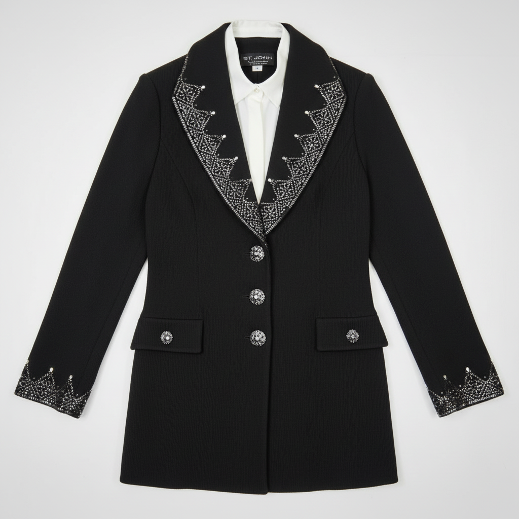 The Real Talk: This St. John Evening blazer is in like-new vintage condition—absolutely pristine with no signs of wear, pilling, or flaws. All crystals are intact and secure, all buttons function perfectly, and the fabric maintains its original structure and beauty. This piece looks exactly as it did when it left the St. John atelier, a testament to the brand's legendary quality.