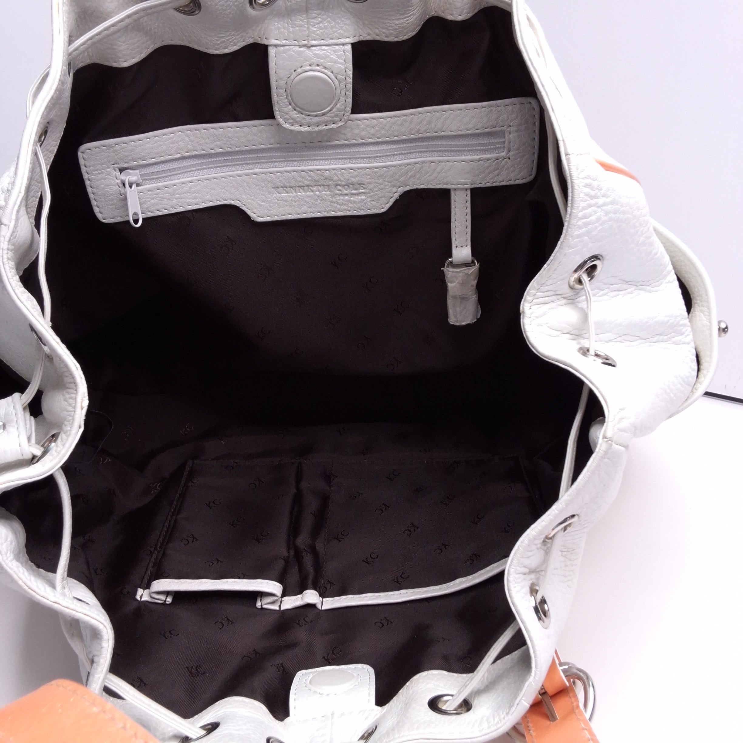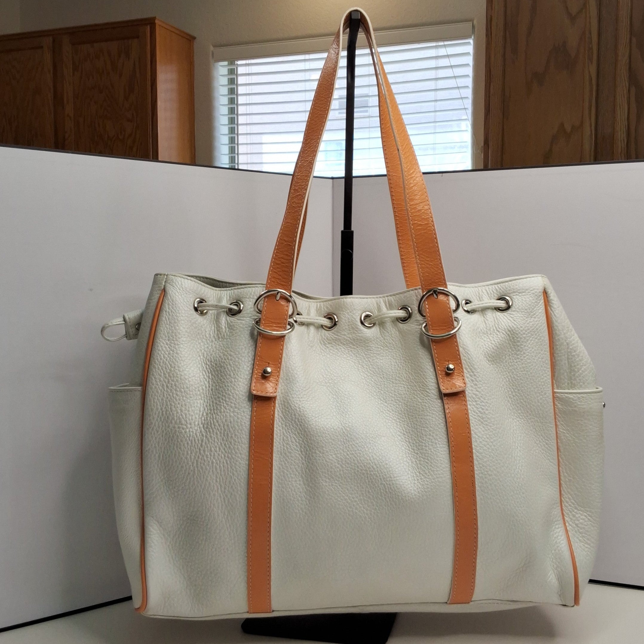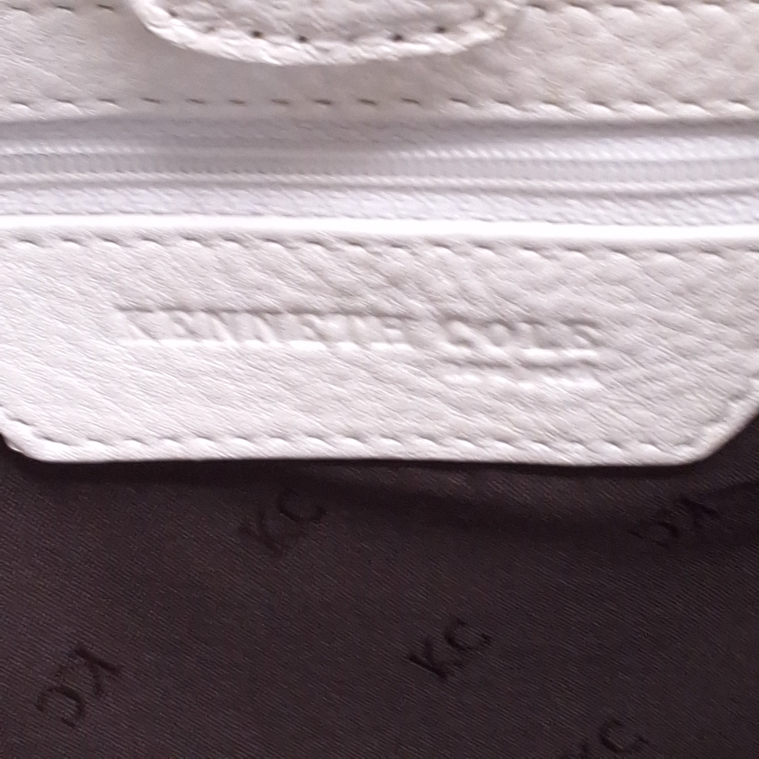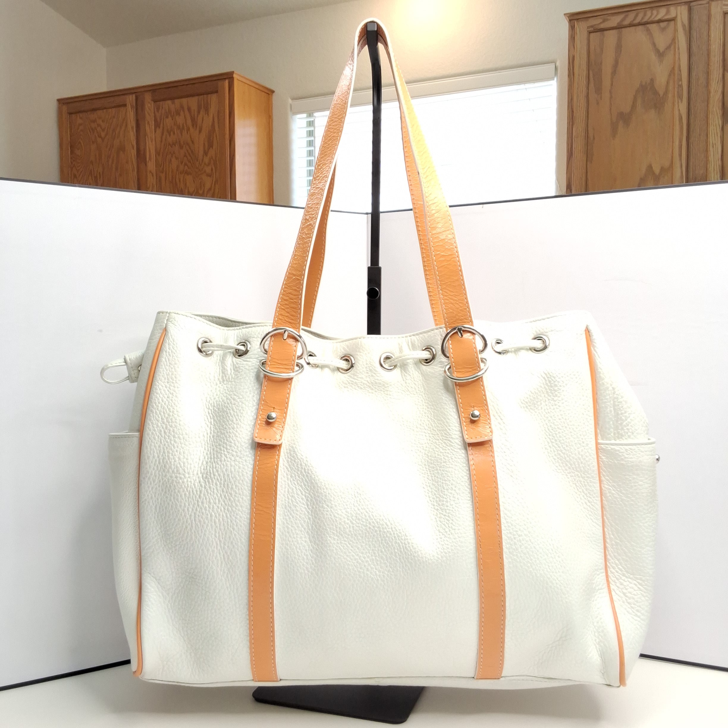 This Kenneth Cole New York bag is the kind of piece that makes getting dressed effortless. Crafted from premium white leather and paired with warm tan straps, this bag creates that perfect neutral combo that goes with literally everything in your closet.
