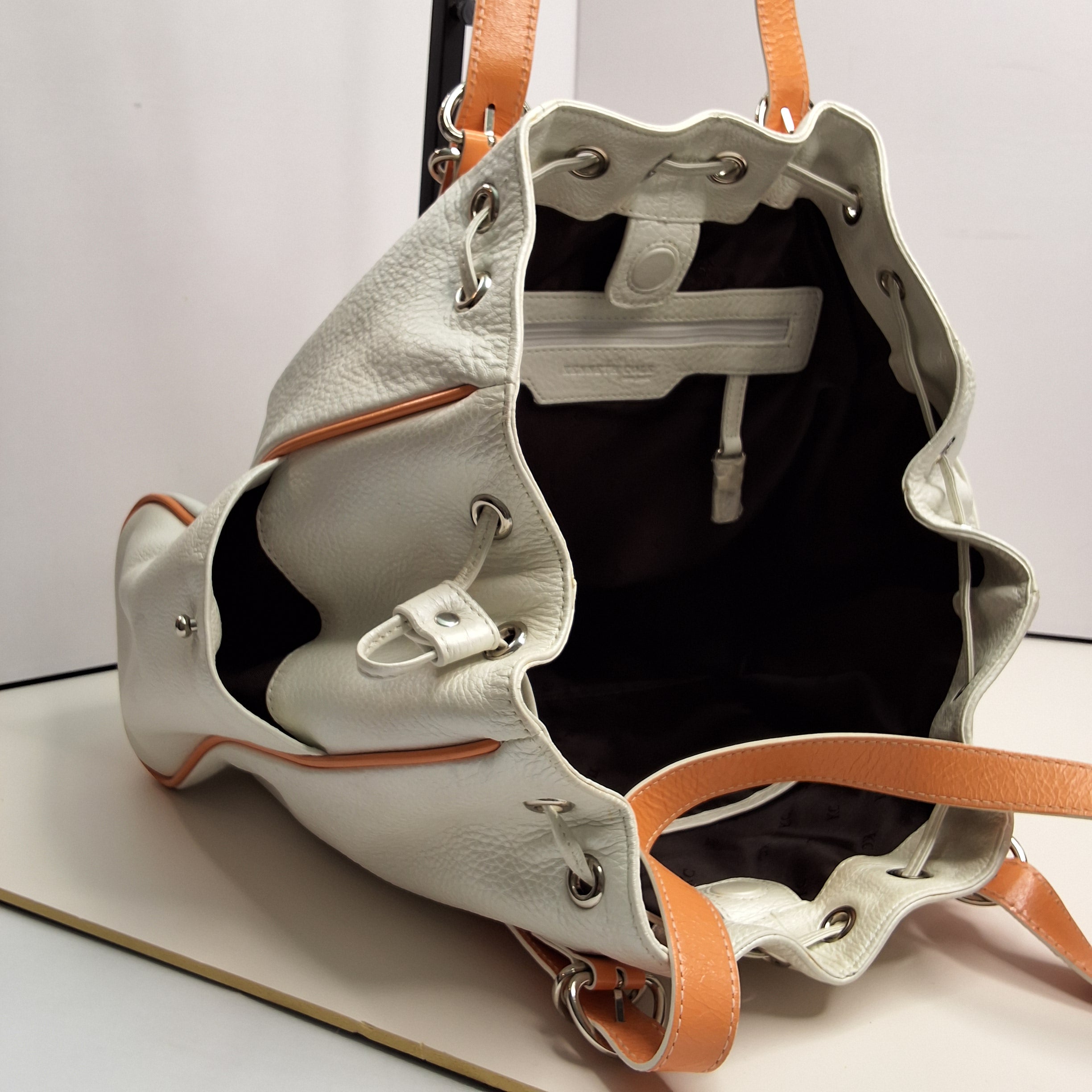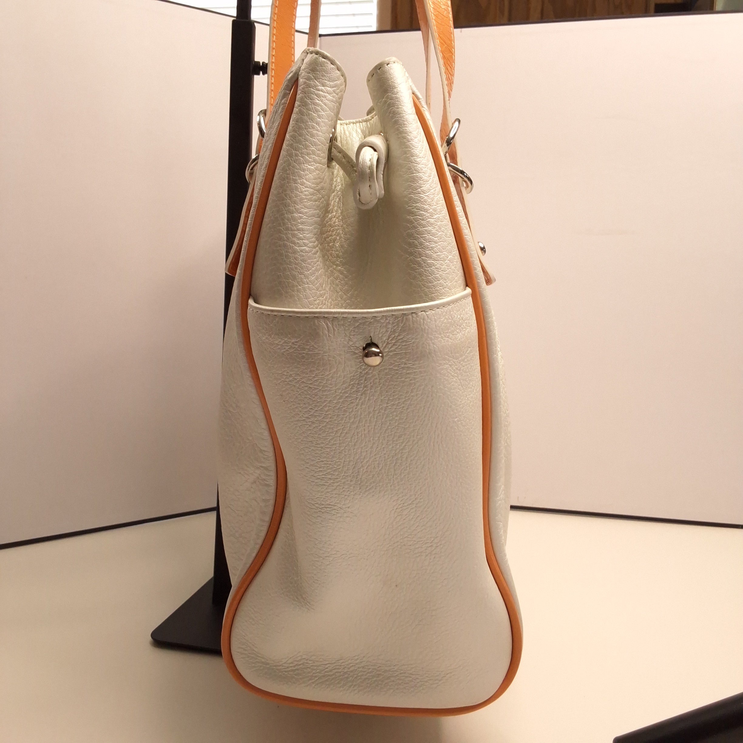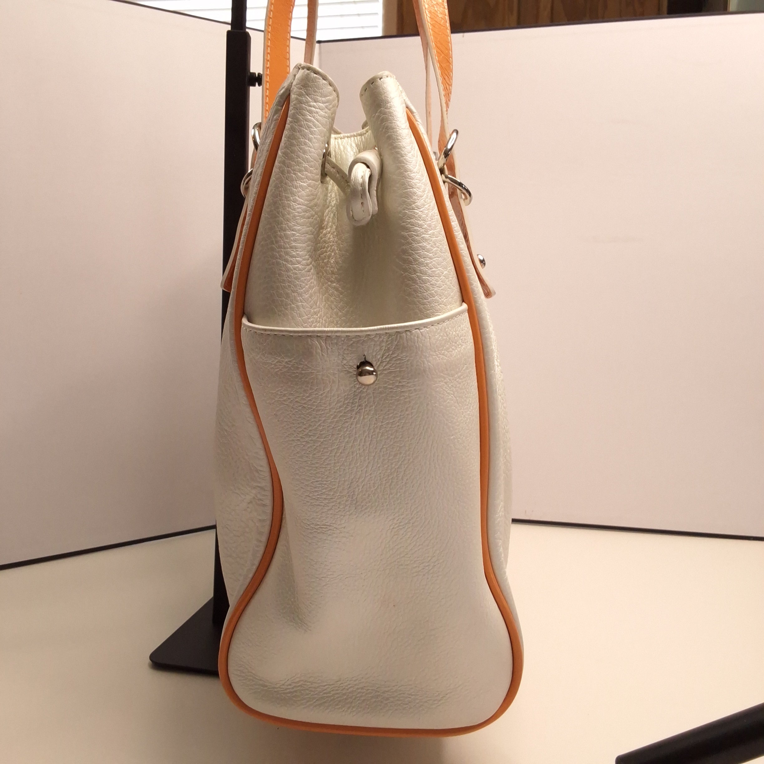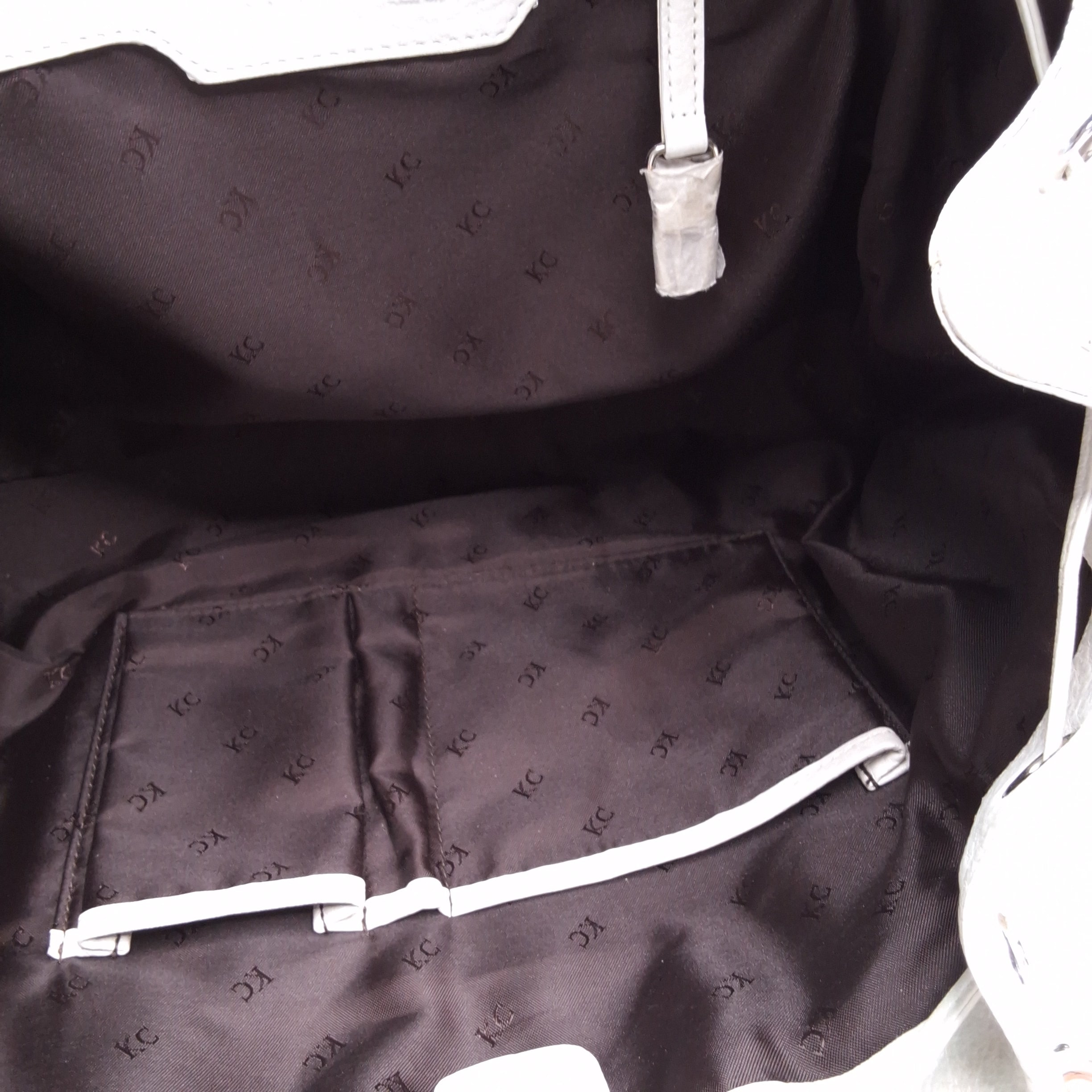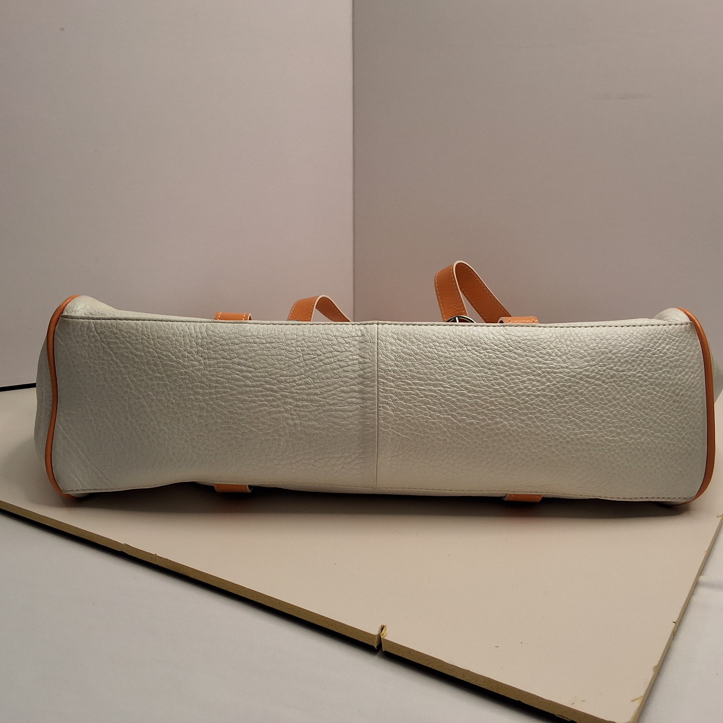 This Kenneth Cole New York bag is the kind of piece that makes getting dressed effortless. Crafted from premium white leather and paired with warm tan straps, this bag creates that perfect neutral combo that goes with literally everything in your closet.