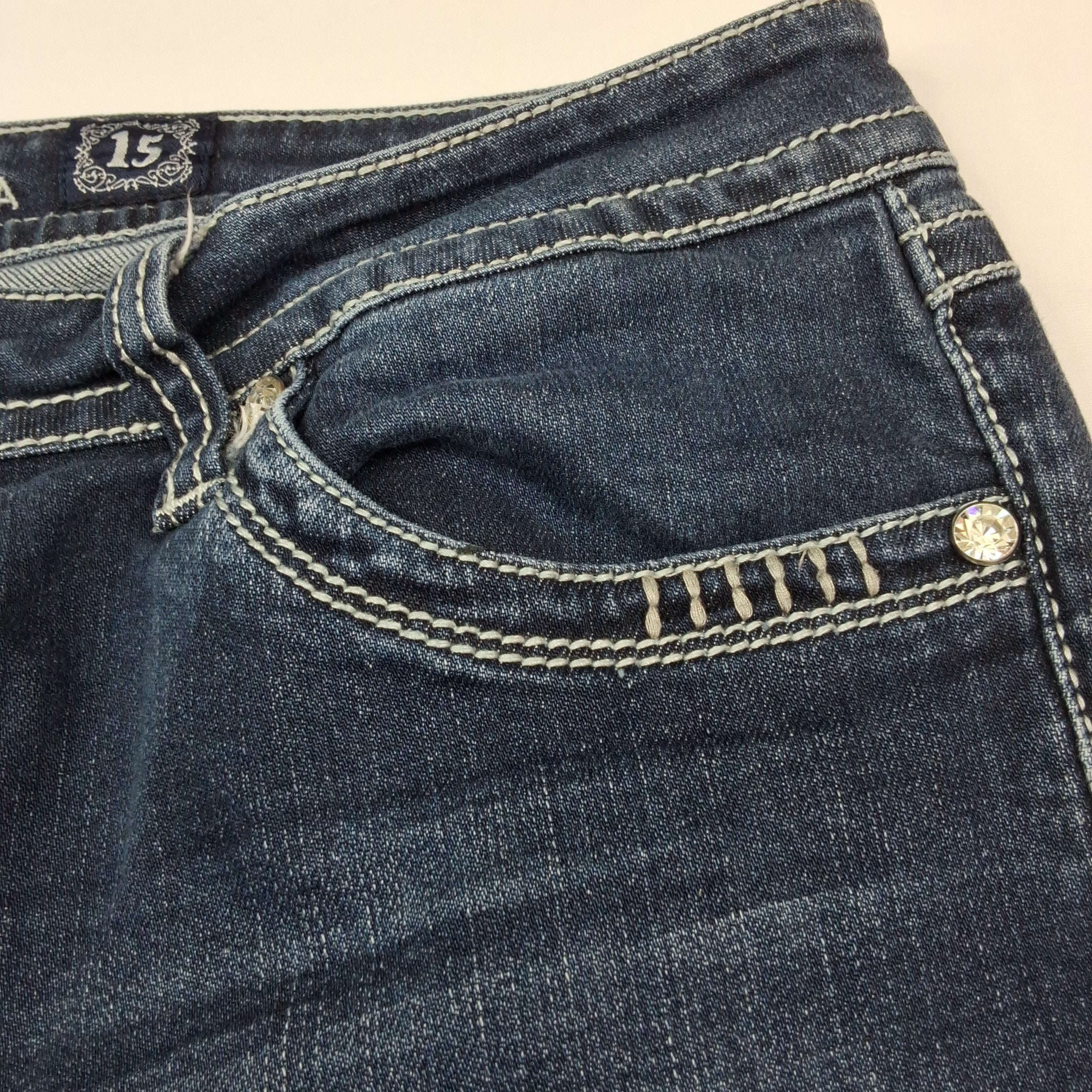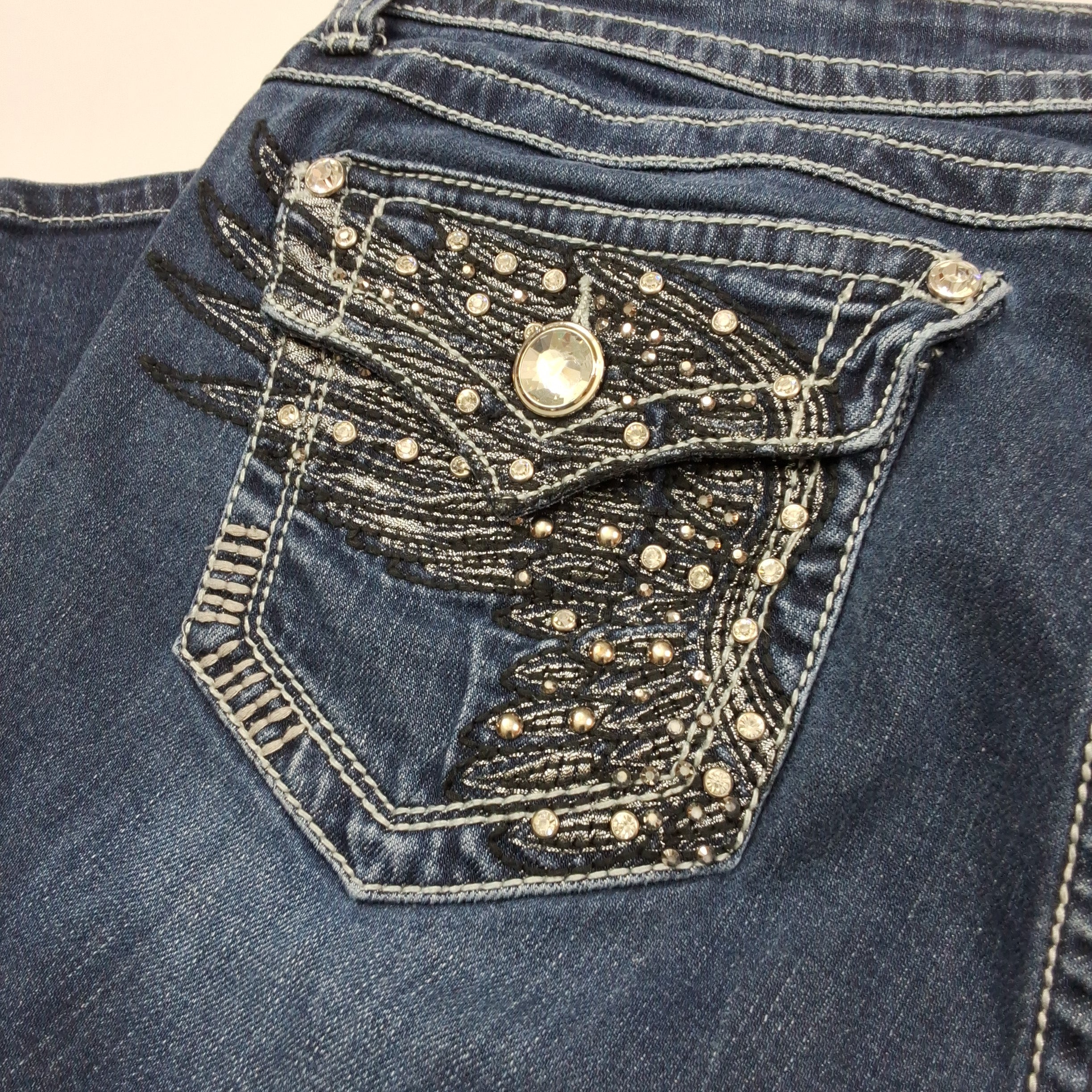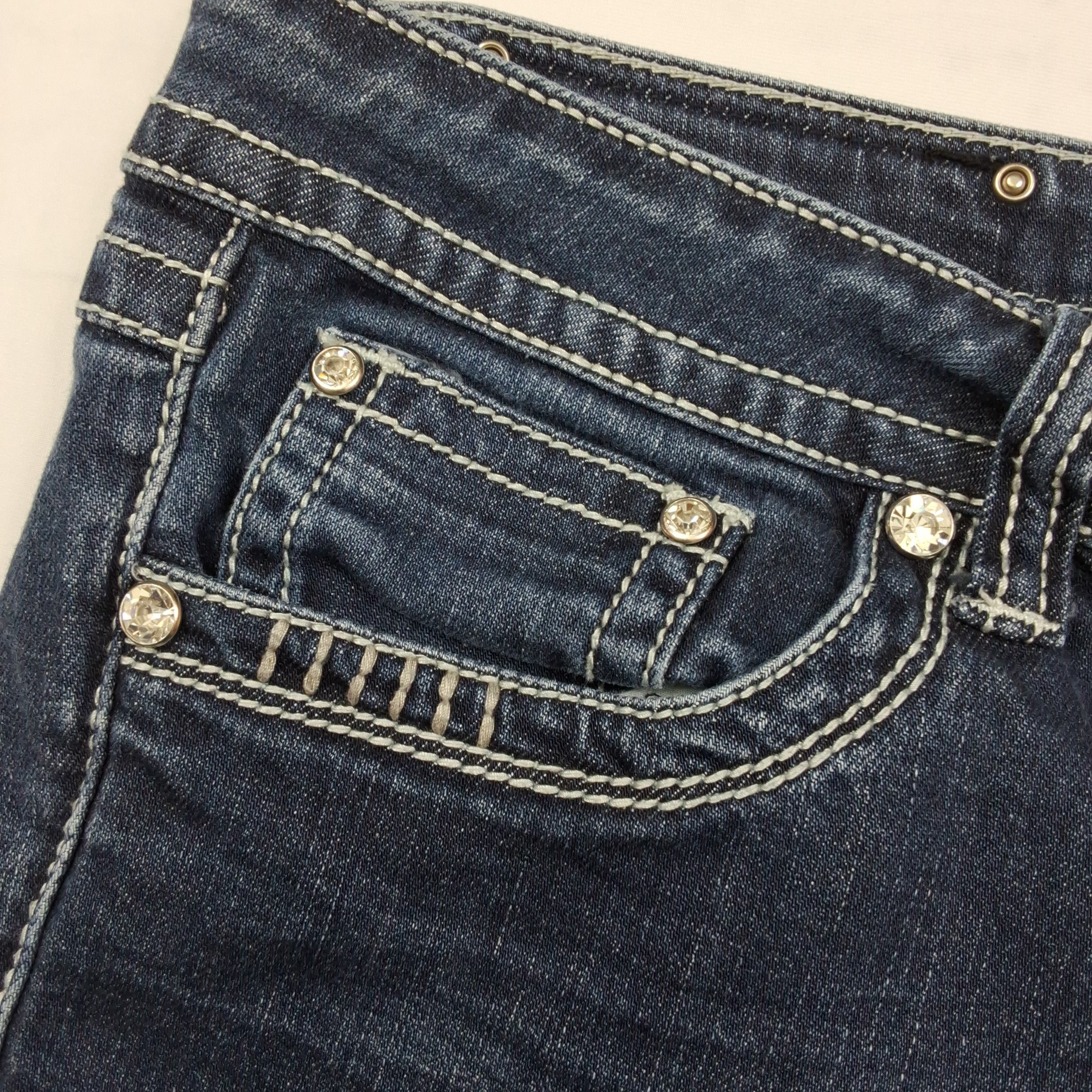LA Idol capri jeans with rhinestone and metallic embellished back pockets. Medium wash denim with classic 5-pocket styling.