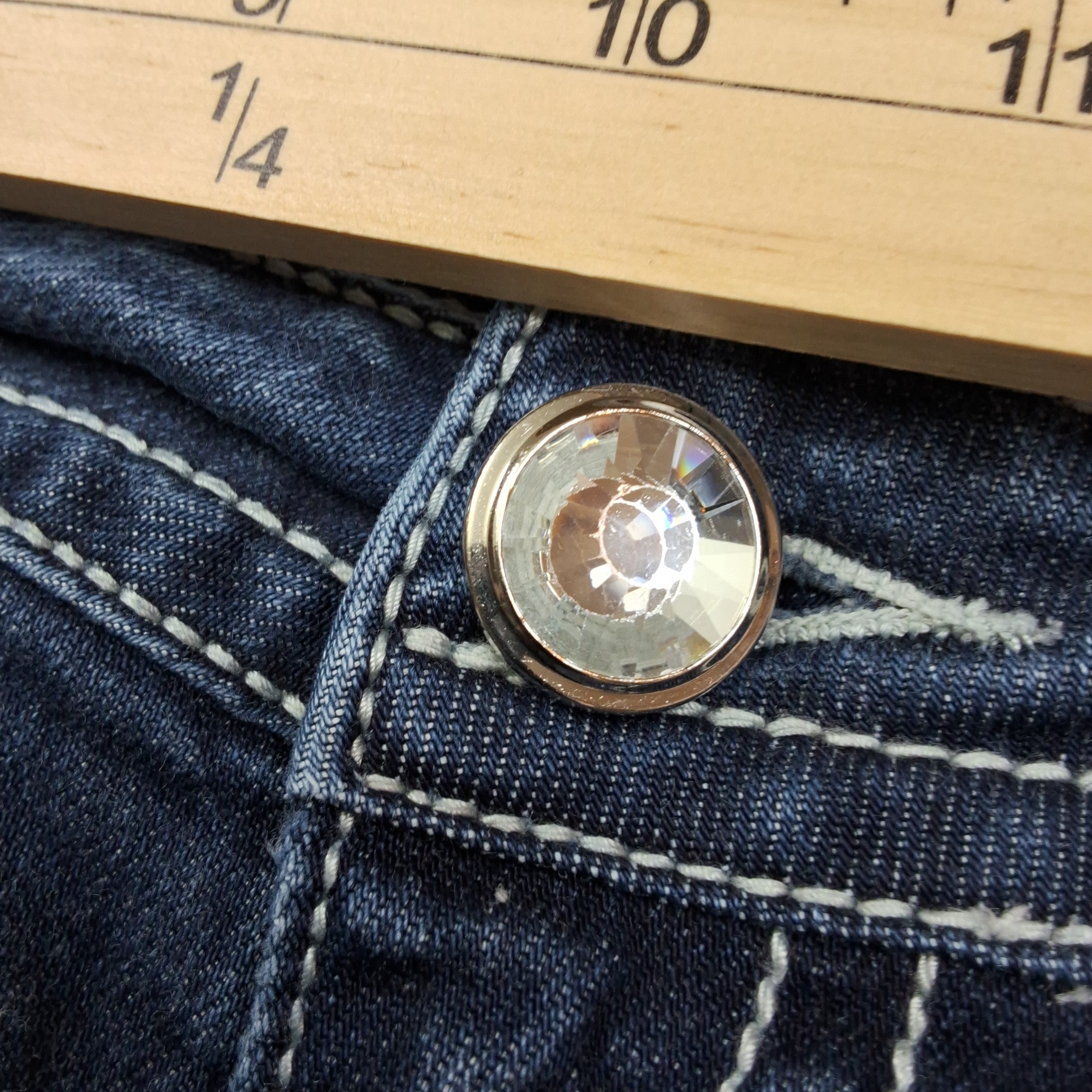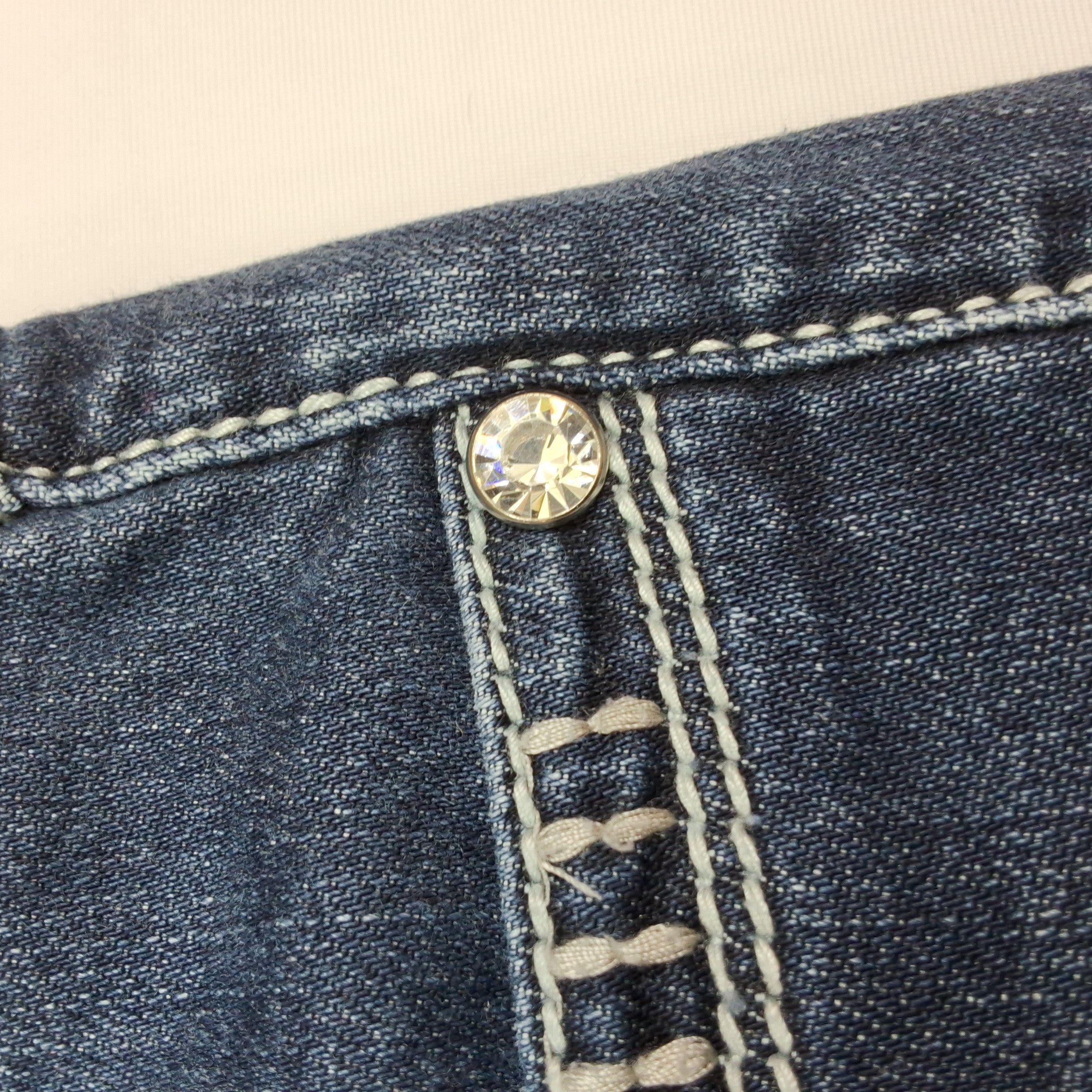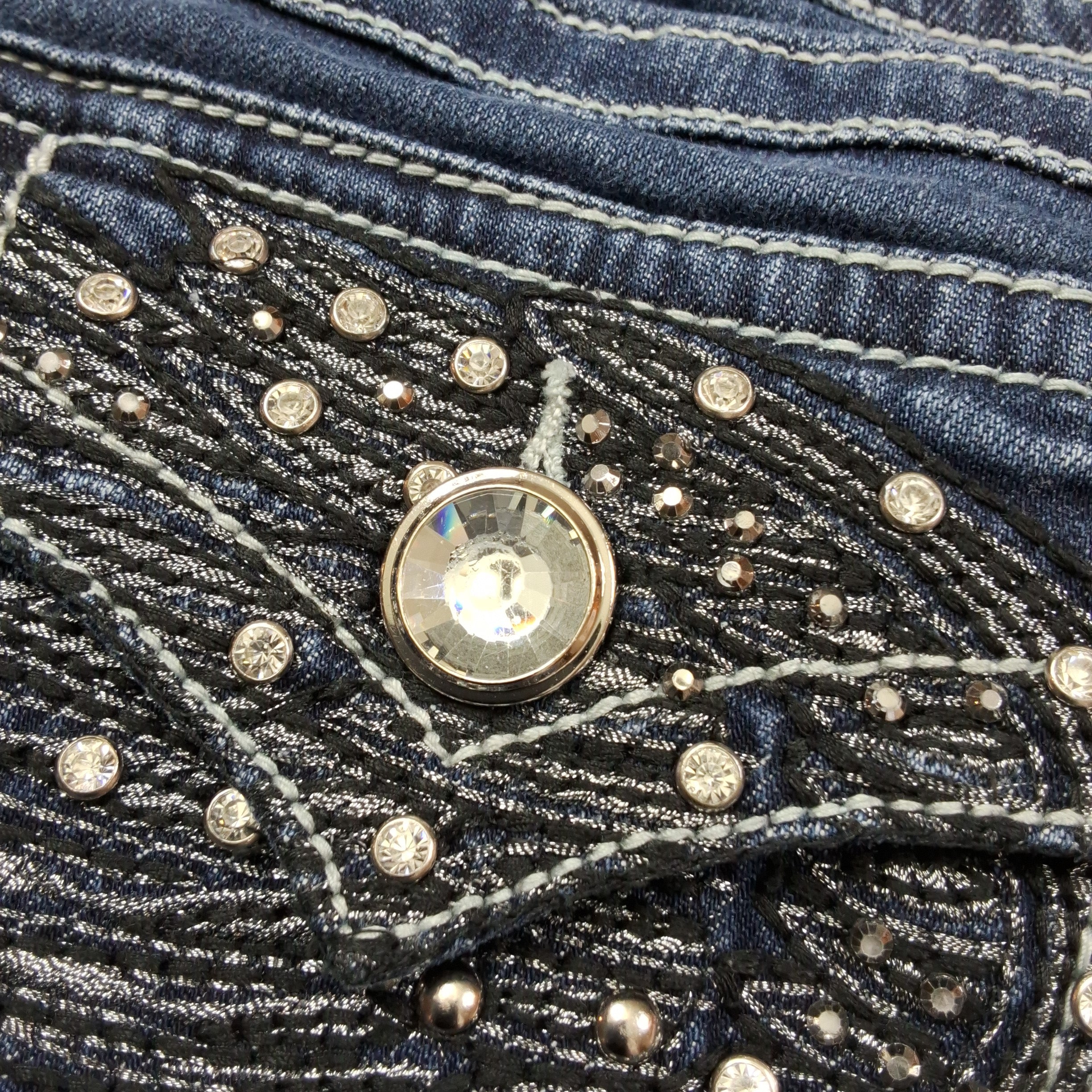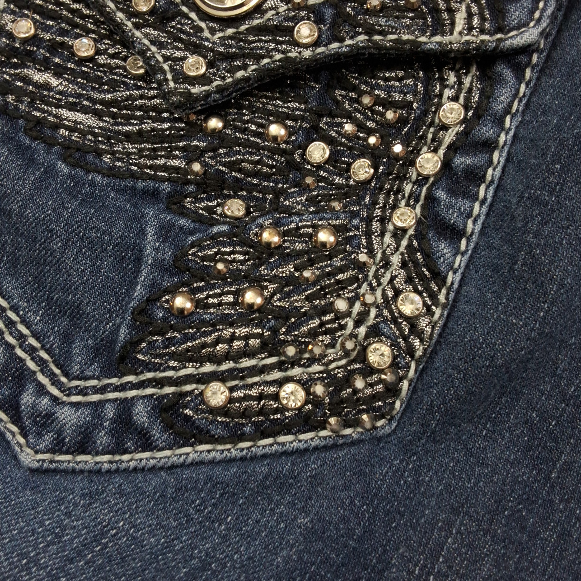 LA Idol capri jeans with rhinestone and metallic embellished back pockets. Medium wash denim with classic 5-pocket styling.
