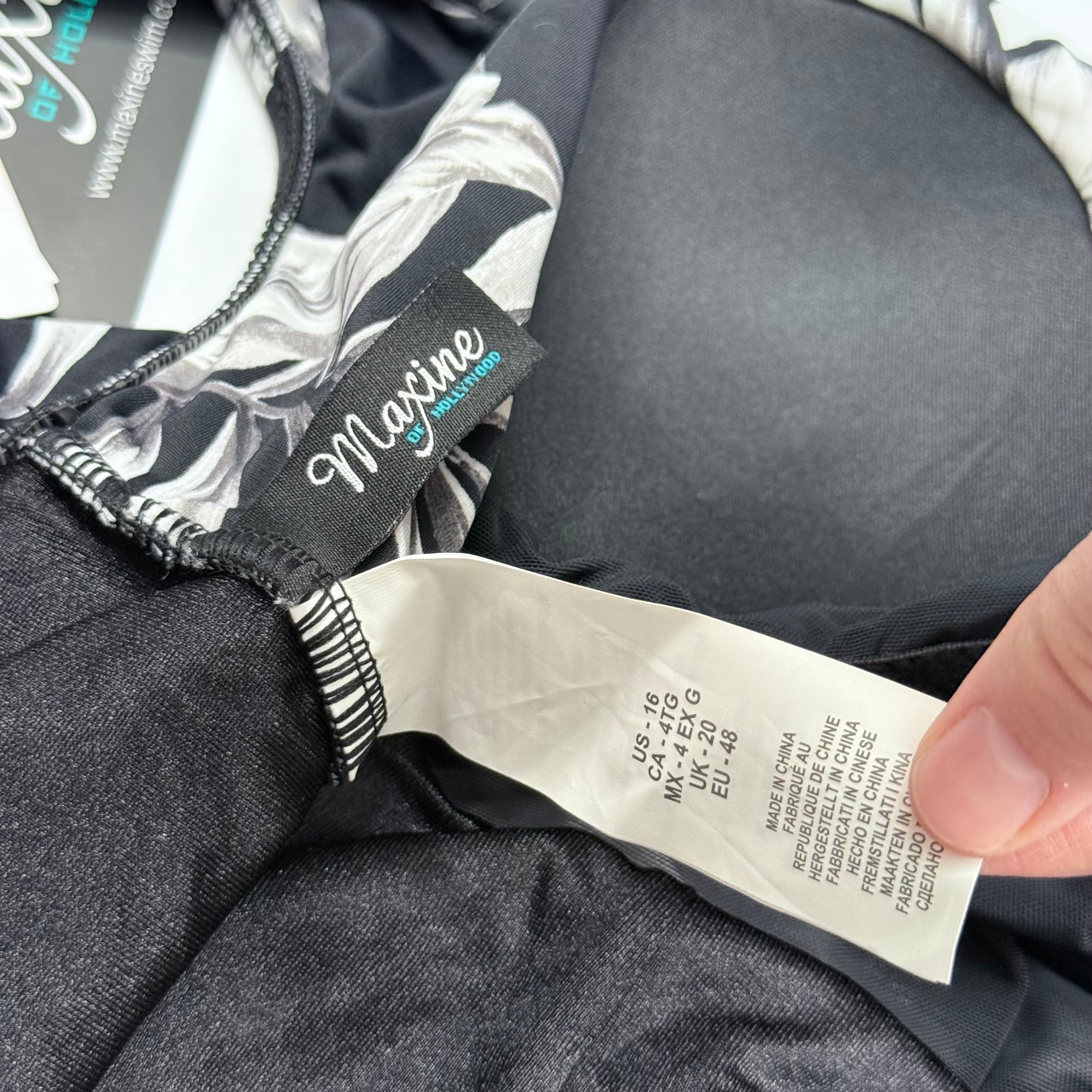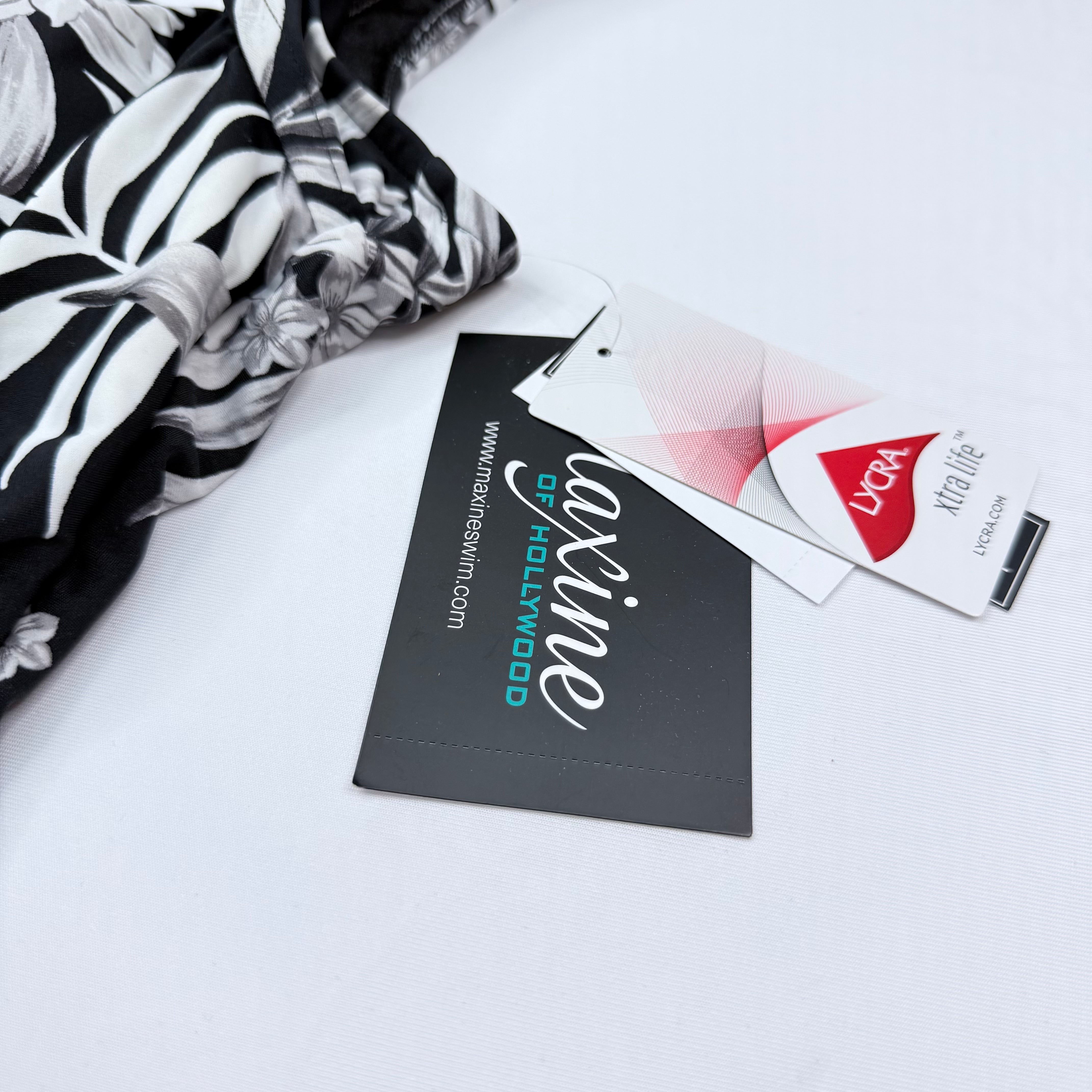 This stunning Maxine of Hollywood one-piece is the kind of swimsuit that makes you feel like you're on a tropical getaway every time you wear it. The bold black and white palm leaf print is absolutely gorgeous and creates a sophisticated, resort-ready look that stands out from basic solid swimwear.