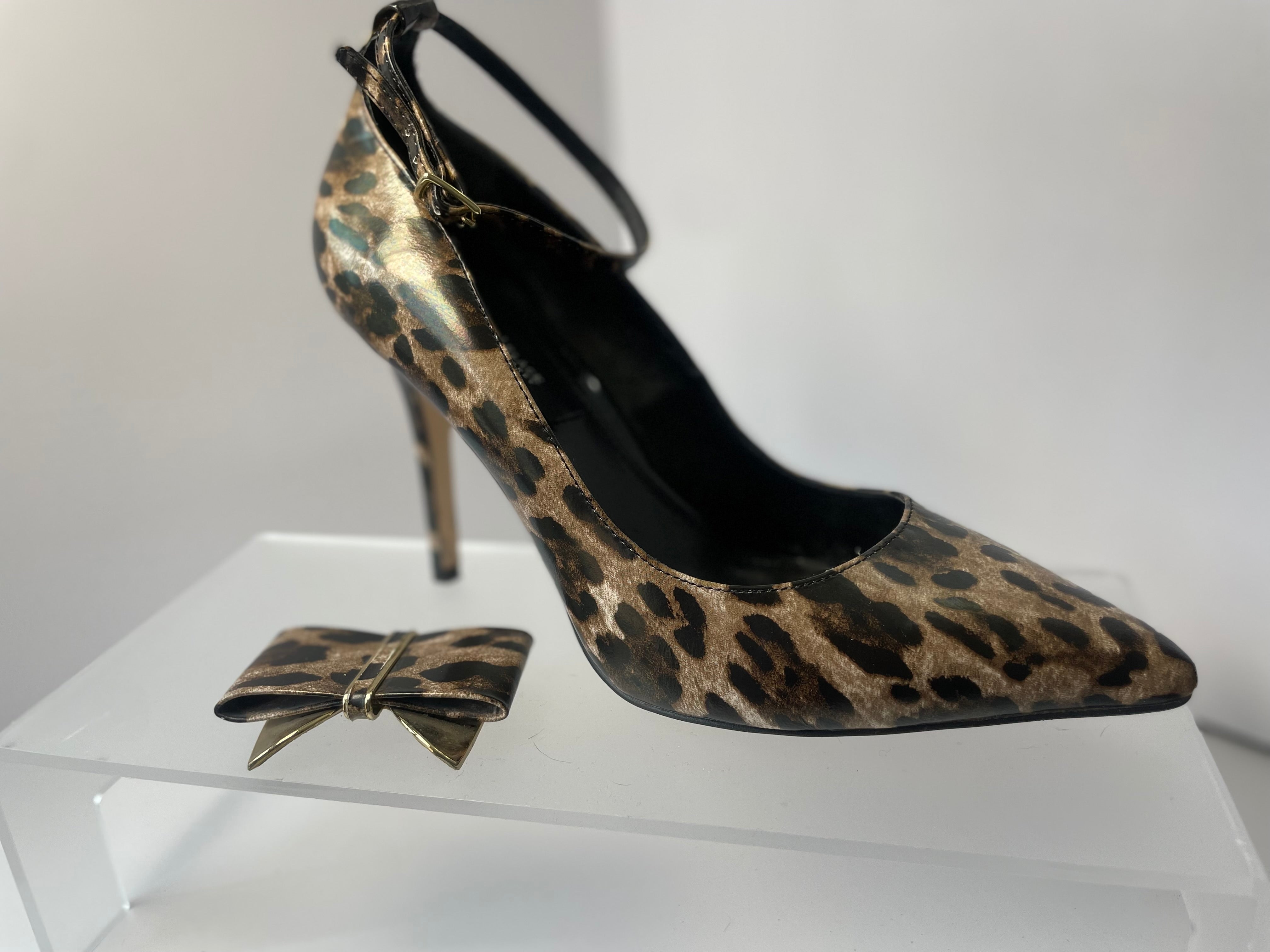 These exquisite pointed-toe pumps feature a luxurious leopard print in rich bronze, gold, and black tones that creates an unforgettable statement. The sleek ankle strap with polished hardware detail adds architectural interest while ensuring a secure, comfortable fit. A chic removable bow embellishment offers versatile styling options—wear it for added glamour or remove it for a sleek, streamlined look. Crafted with meticulous attention to detail, these versatile heels transition effortlessly from boardroom to cocktail hour, elevating everything from tailored trousers to your favorite little black dress.