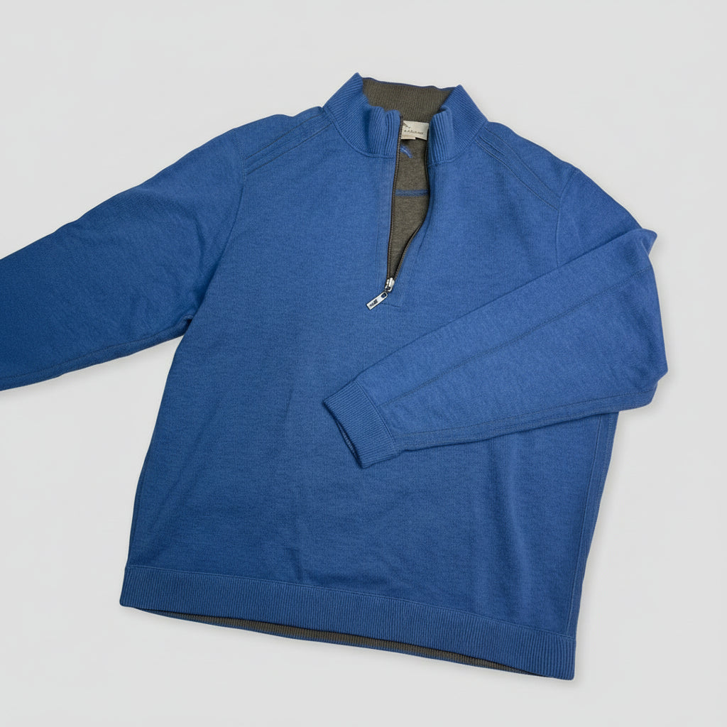 This handsome blue golf sweater from Tommy Bahama combines the brand's signature island-inspired aesthetic with performance-ready style for the course. Known for their premium fabrics and impeccable construction, Tommy Bahama creates golf wear that transitions seamlessly from the links to the clubhouse. In like-new condition, this sweater shows virtually no signs of wear and is ready to elevate your golf wardrobe.