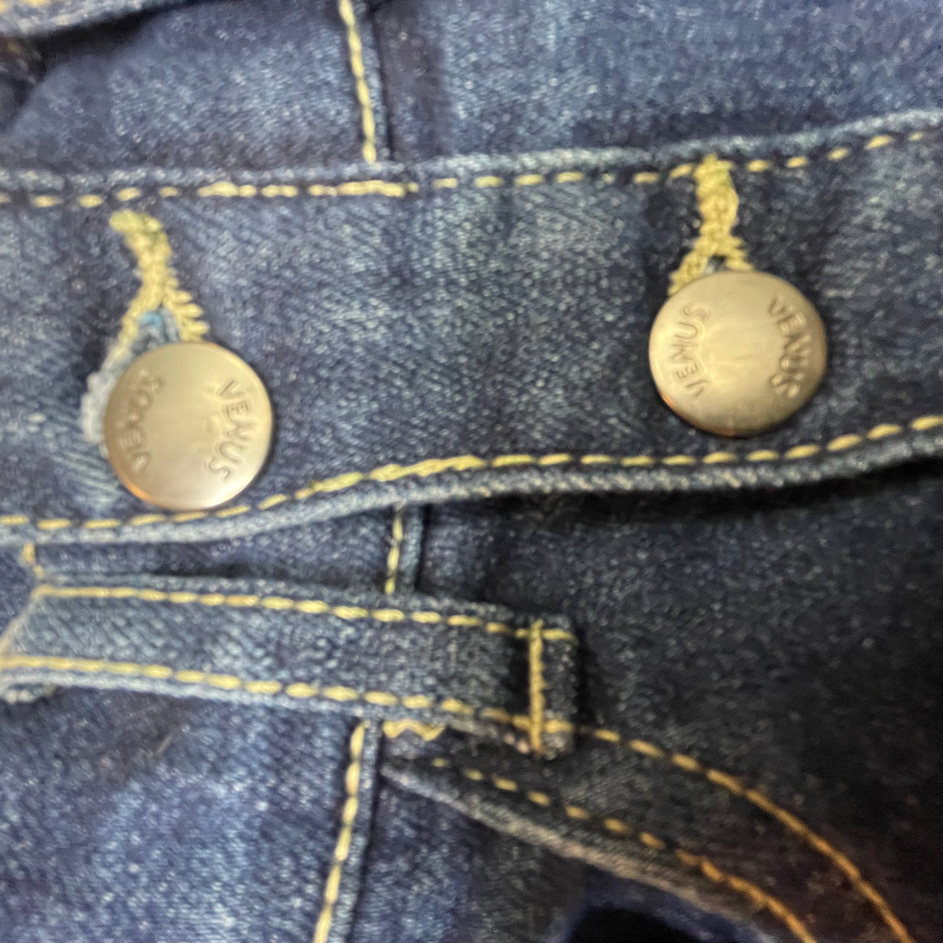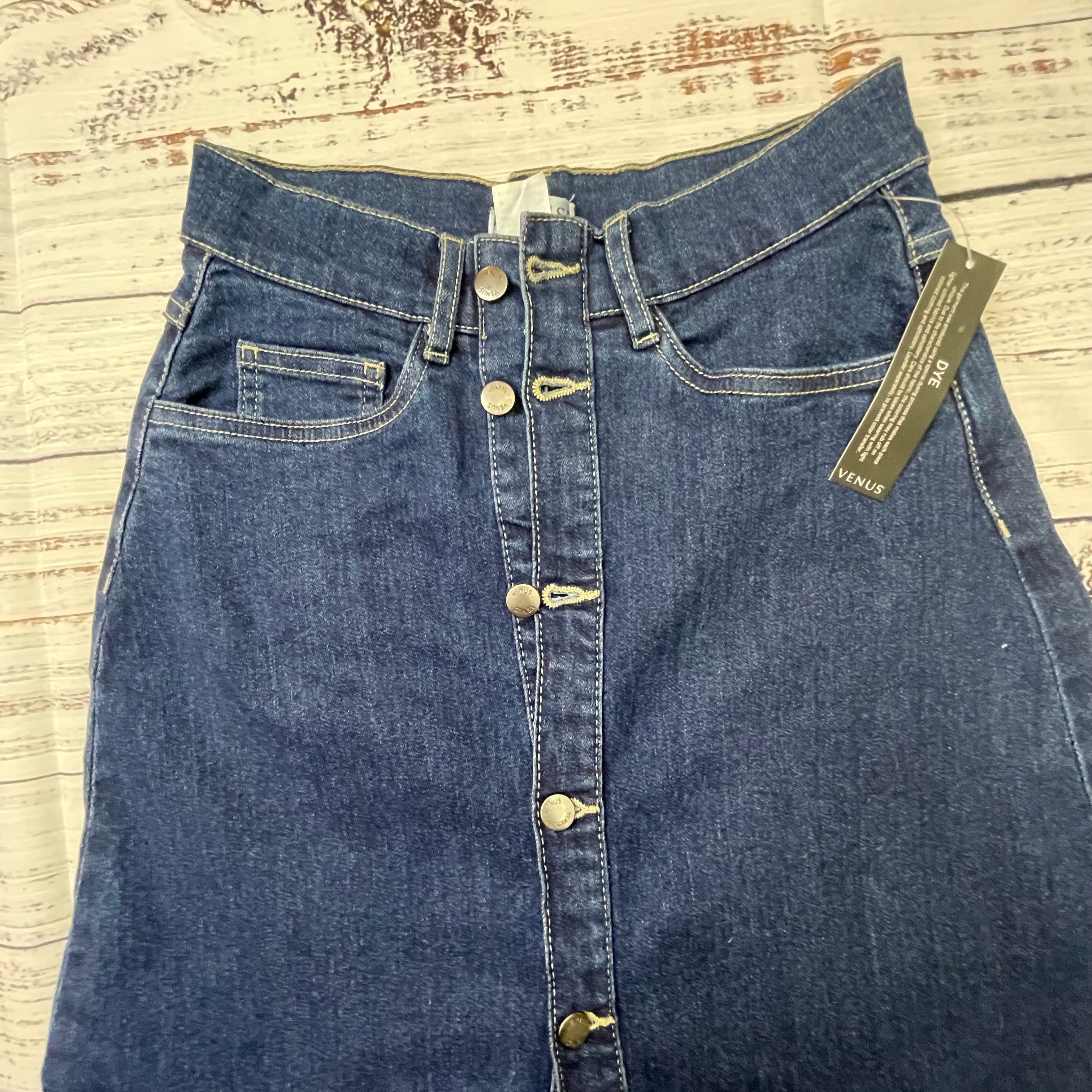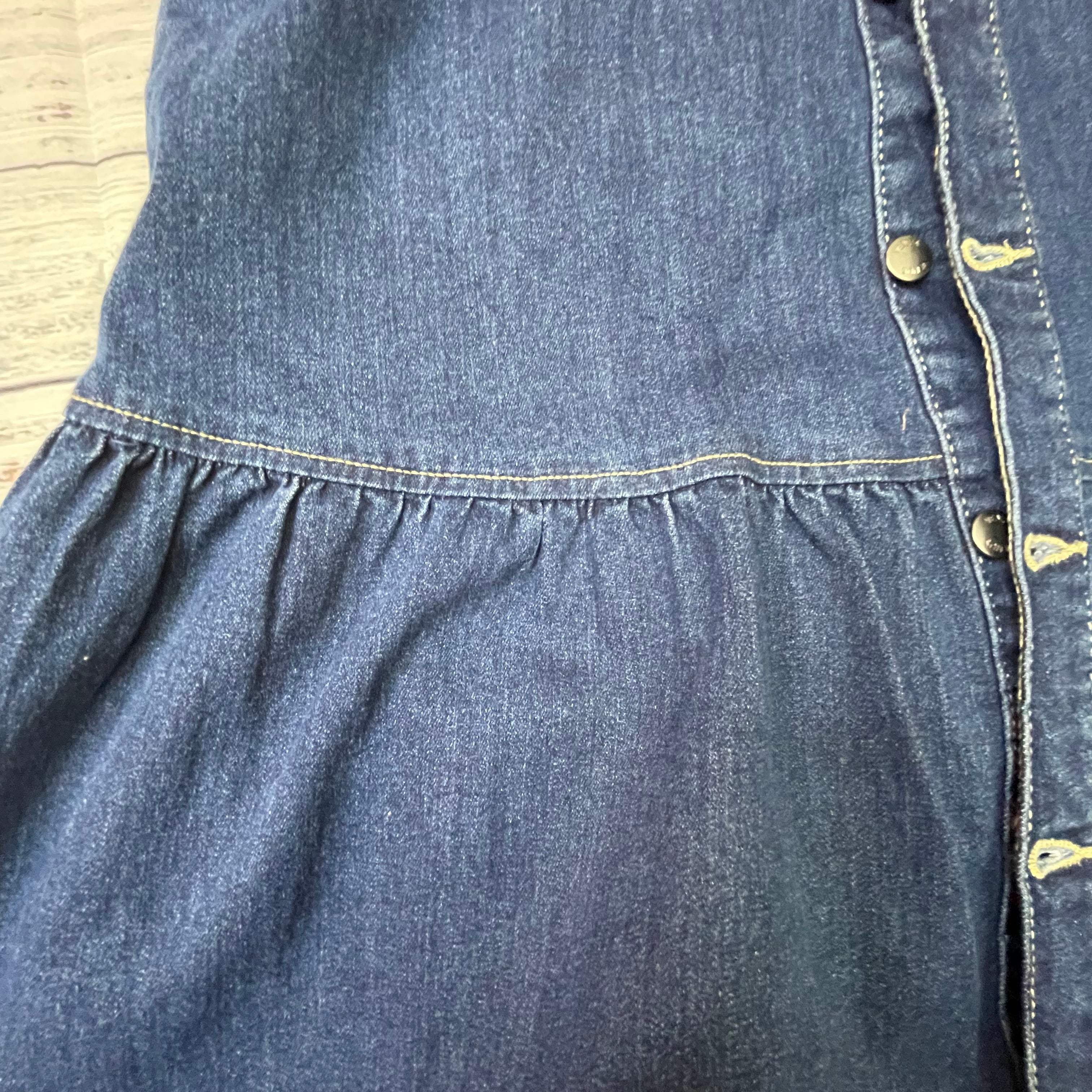 Casual vintage denim skirt with button-front closure and playful ruffle hem detail.