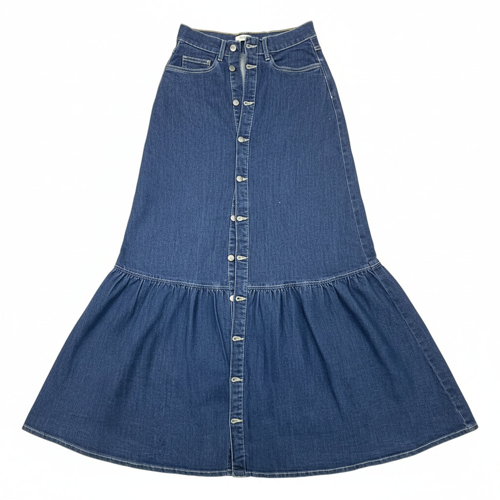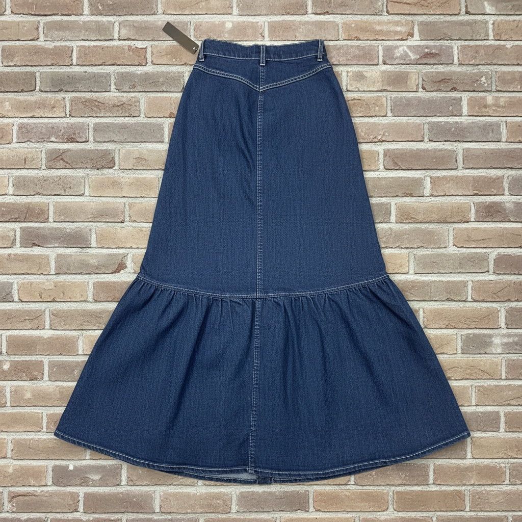 Vintage Button-Up Denim Skirt with Ruffle Hem